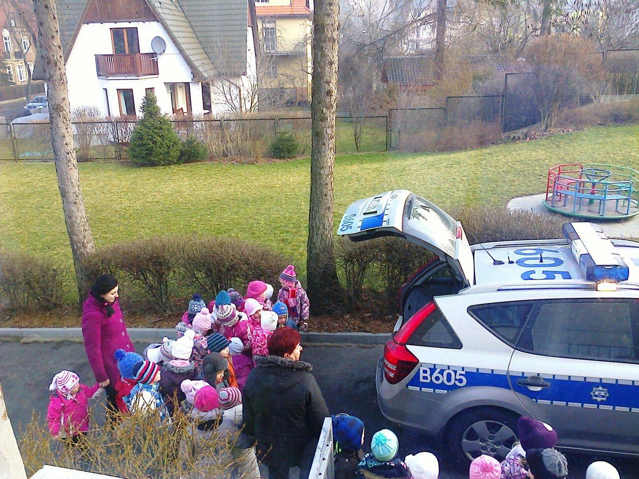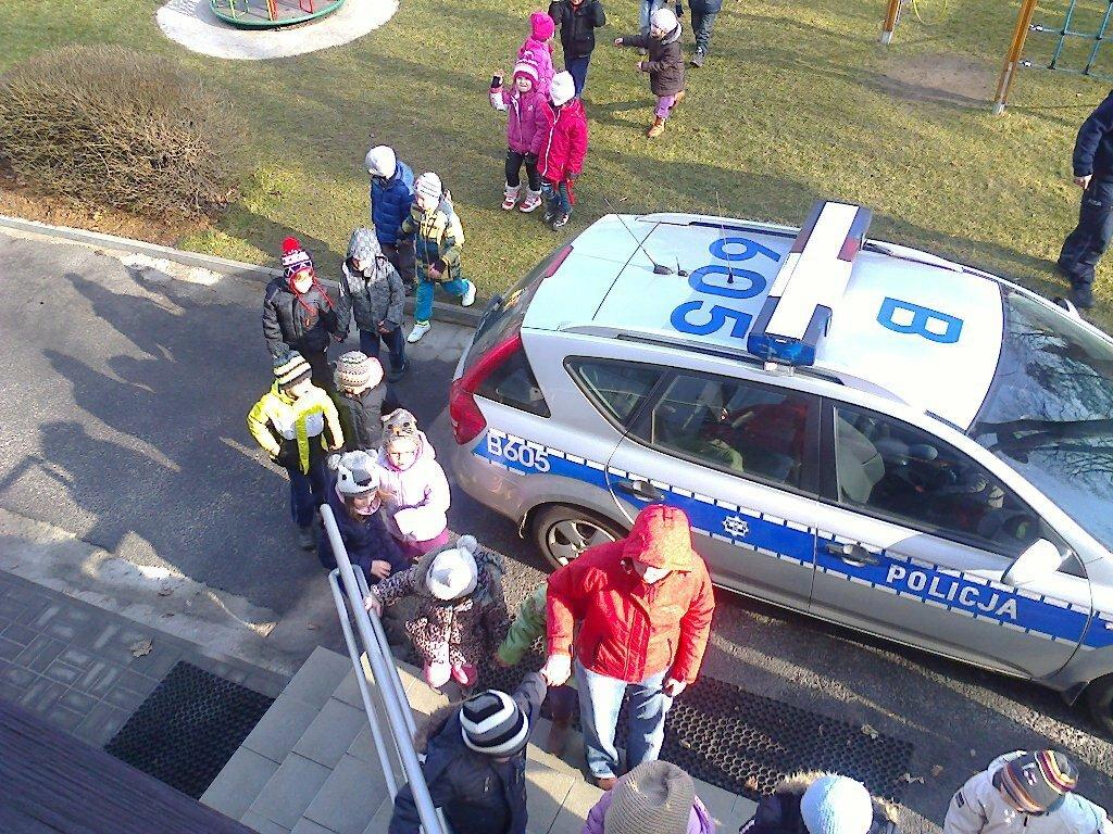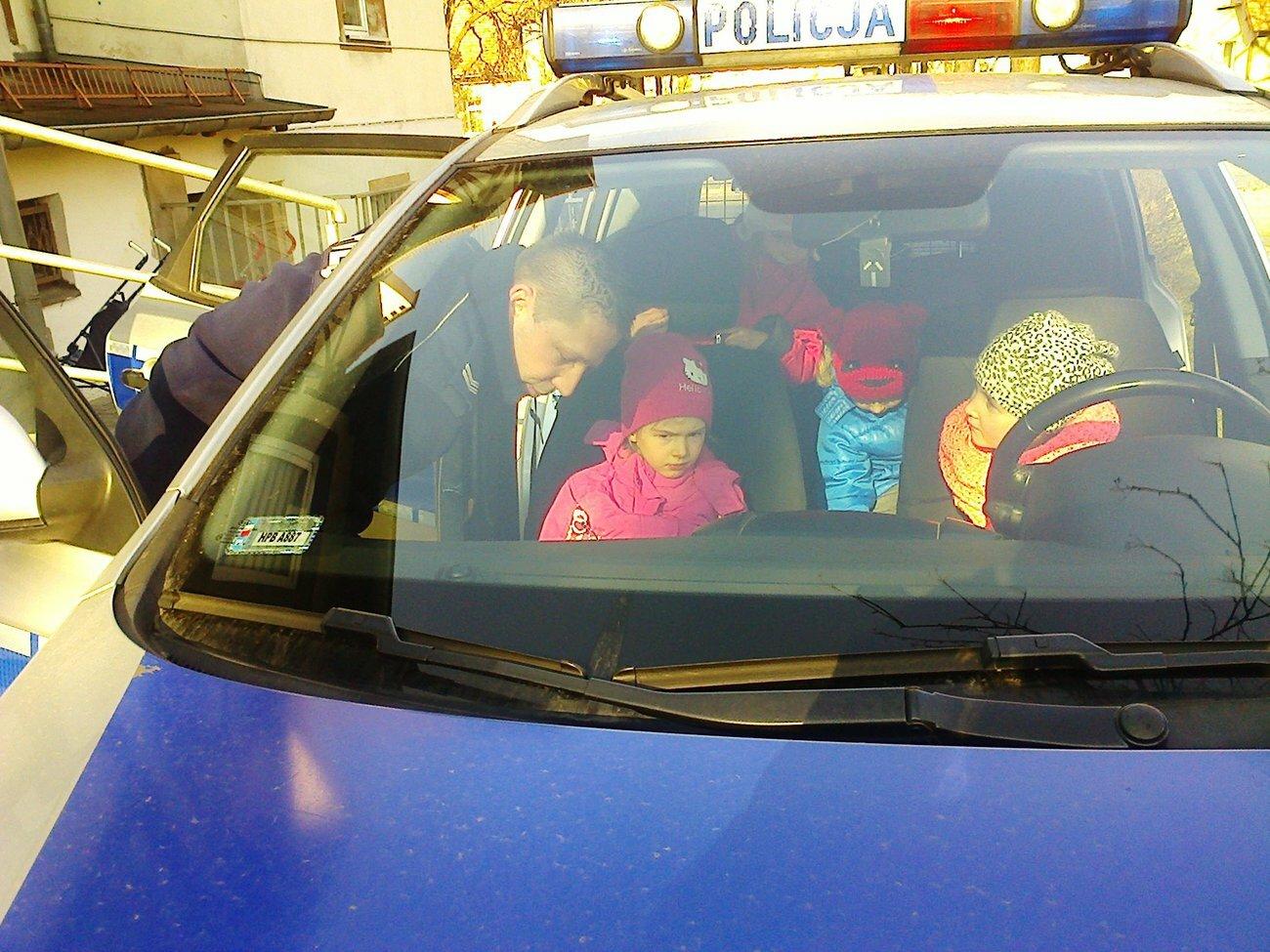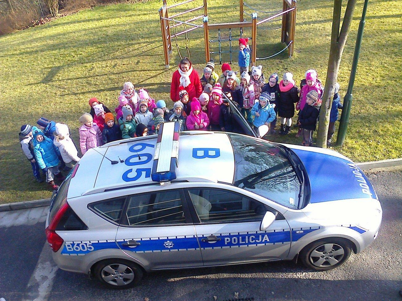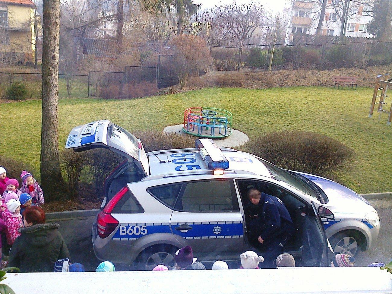 Świetnie się dziś bawiliśmy, nasze przedszkole odwiedził patrol policji. Policjanci przyjechali do nas, aby opowiedzieć o swojej pracy i zaprezentować niezbędne do jej wykonywania rzeczy. Mogliśmy obejrzeć prawdziwą broń, kajdanki a nawet radiowóz, który wzbudził najwięcej emocji. Policjanci pozwolili nam wejść do środka i uruchomić syrenę sygnalizacyjną. Ich praca, choć ciężka i niebezpieczna jest bardzo ciekawa. Kto wie, może ktoś z nas w przyszłości też zostanie stróżem prawa.
