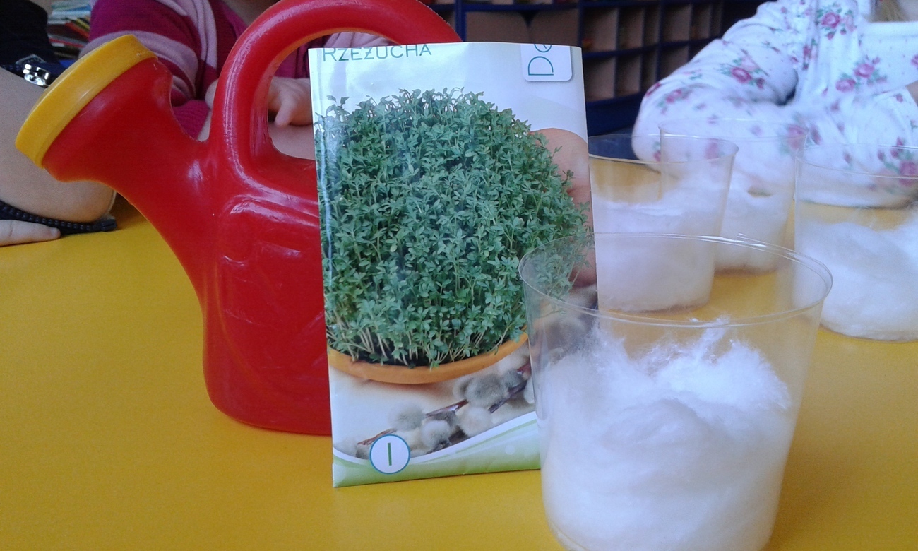 Do sadzenia potrzebne nam były tylko malutkie pojemniki, wata oraz co najważniejsze nasionka rzeżuchy i konewka z wodą.