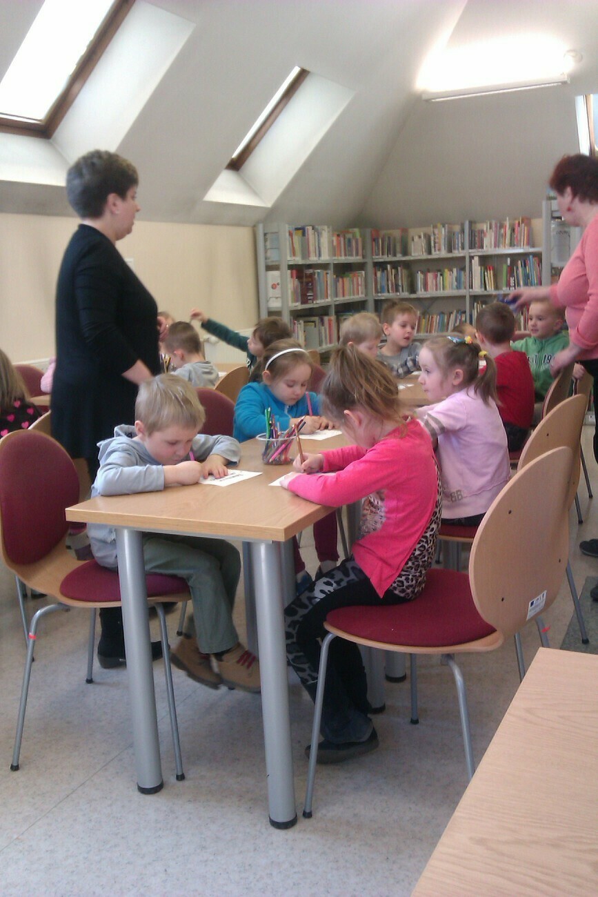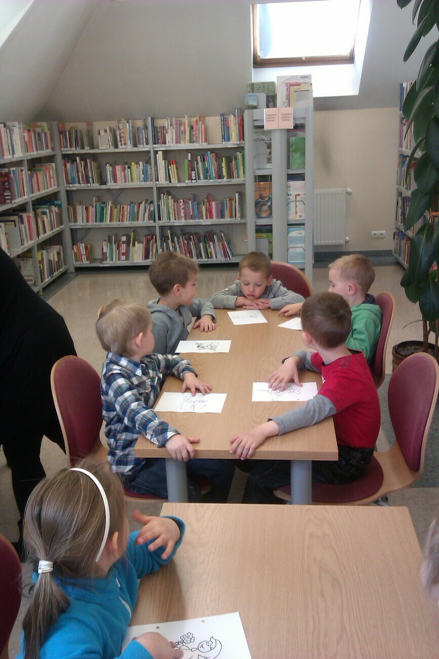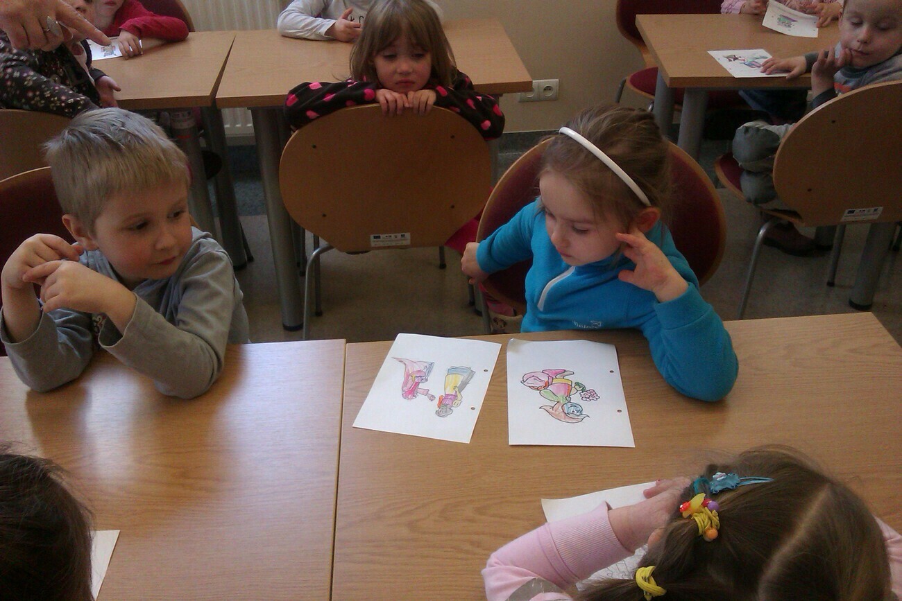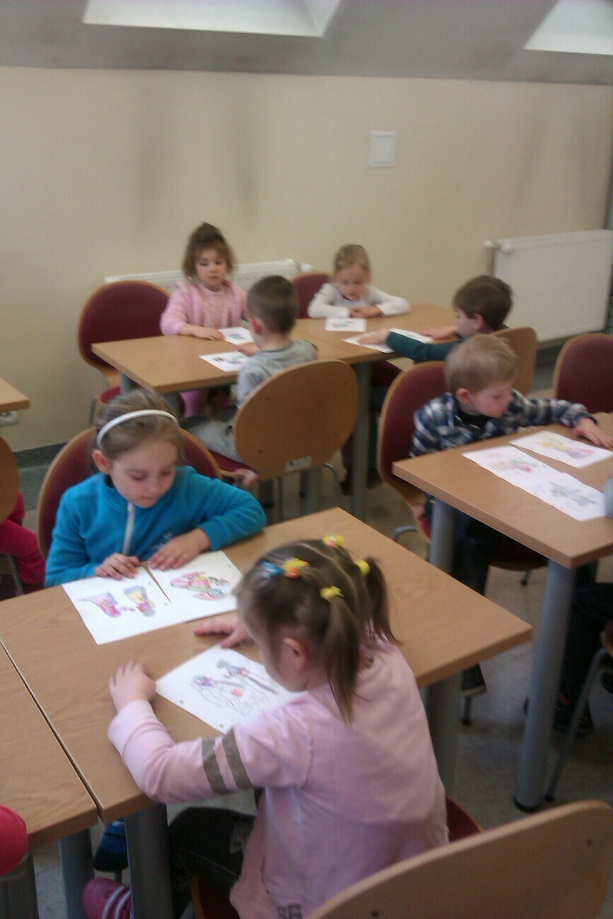 Nasze spotkanie z książką było inne niż dotychczas. Przedszkolaki na chwilę zamieniły się w ilustratorów. Każdy z nas, /nawet panie/, otrzymał zadanie do wykonania. Musieliśmy wykonać ilustracje do naszej pierwszej w życiu książki :) Przedszkolaki dzielnie kolorowały obrazki. Na tym jednak nasze zadnie się nie zakończyło. Aby złożyć książkę trzeba było odgadnąć zagadki według alfabetu. Przedszkolaki musiały odszukać obrazek pasujący ilustracją do odczytanej zagadki. Trzeba przyznać, że radziły sobie dzielnie.