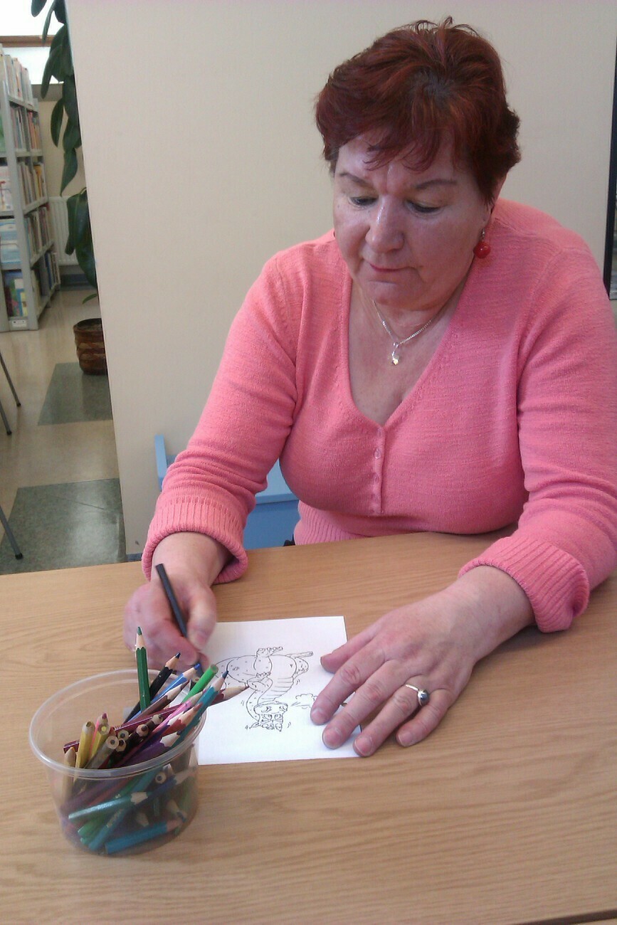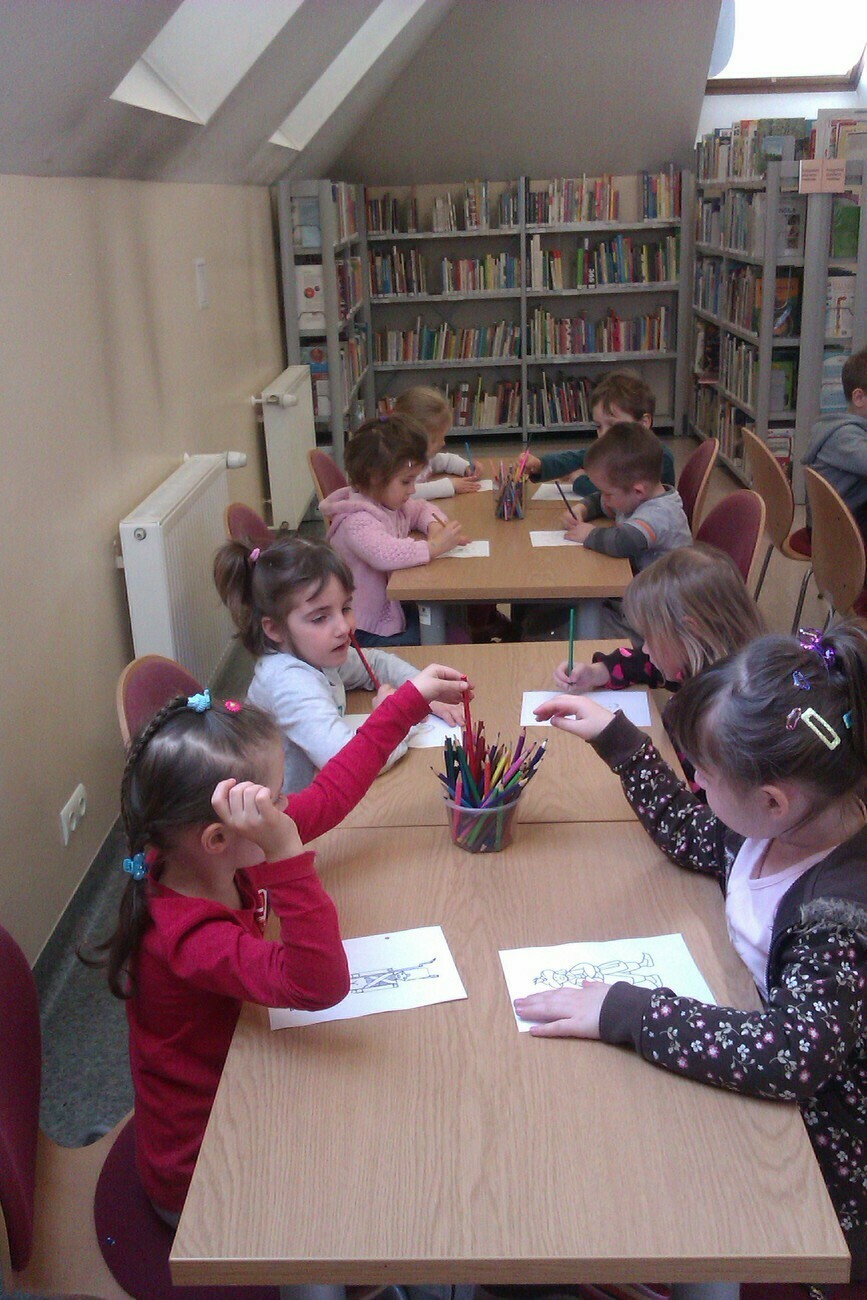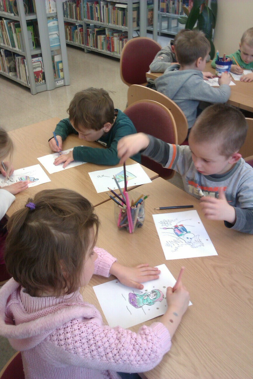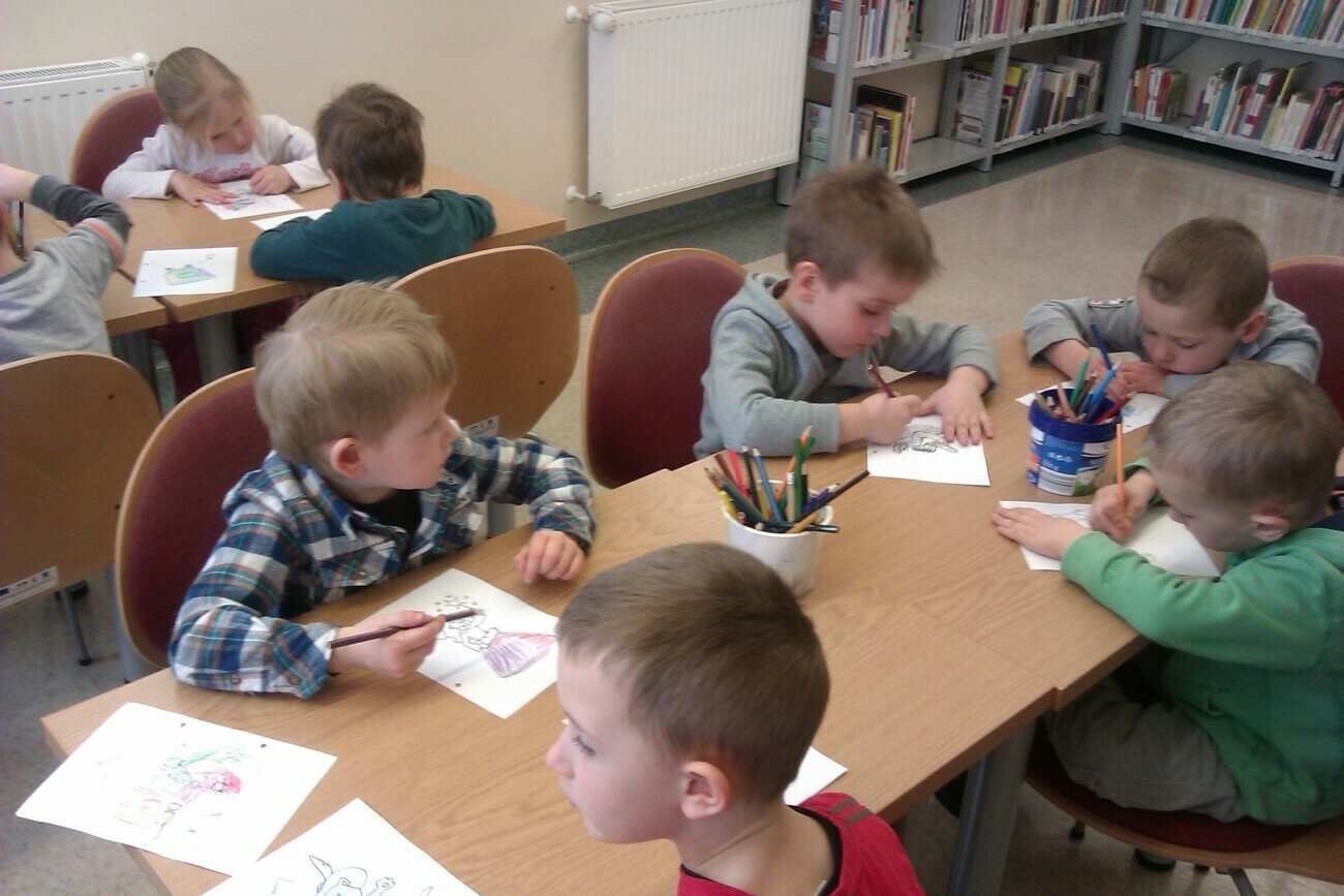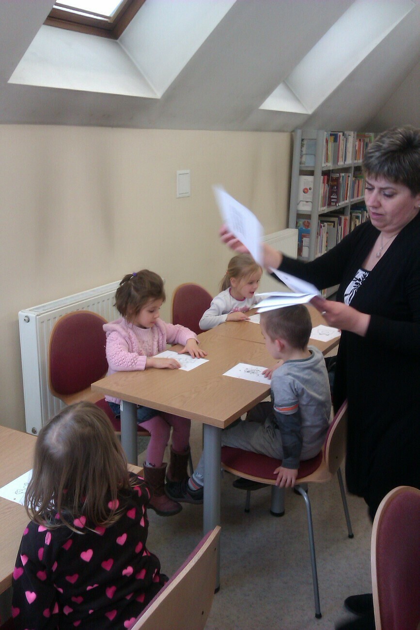 Nasze spotkanie z książką było inne niż dotychczas. Przedszkolaki na chwilę zamieniły się w ilustratorów. Każdy z nas, /nawet panie/, otrzymał zadanie do wykonania. Musieliśmy wykonać ilustracje do naszej pierwszej w życiu książki :) Przedszkolaki dzielnie kolorowały obrazki. Na tym jednak nasze zadnie się nie zakończyło. Aby złożyć książkę trzeba było odgadnąć zagadki według alfabetu. Przedszkolaki musiały odszukać obrazek pasujący ilustracją do odczytanej zagadki. Trzeba przyznać, że radziły sobie dzielnie.