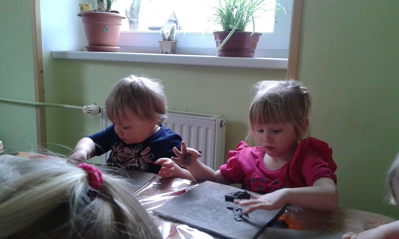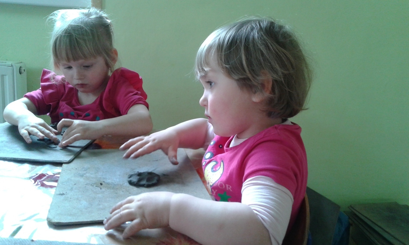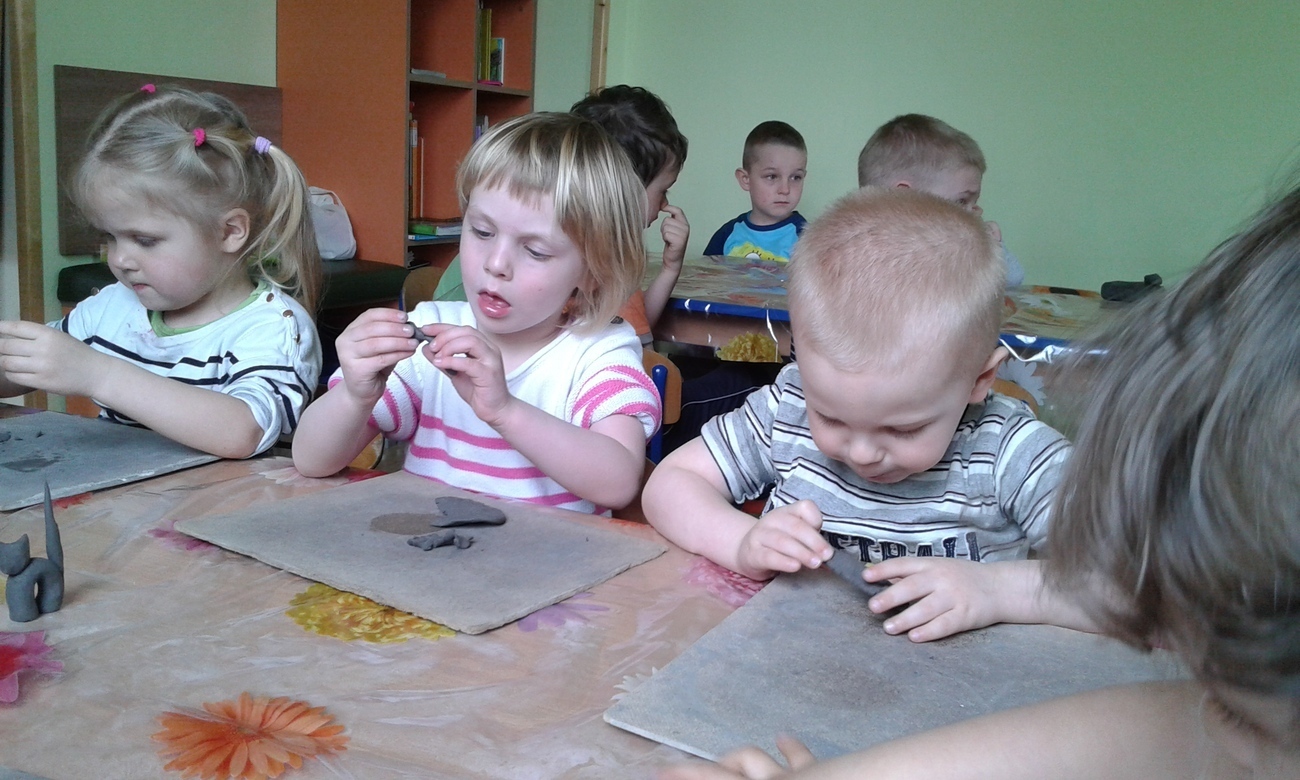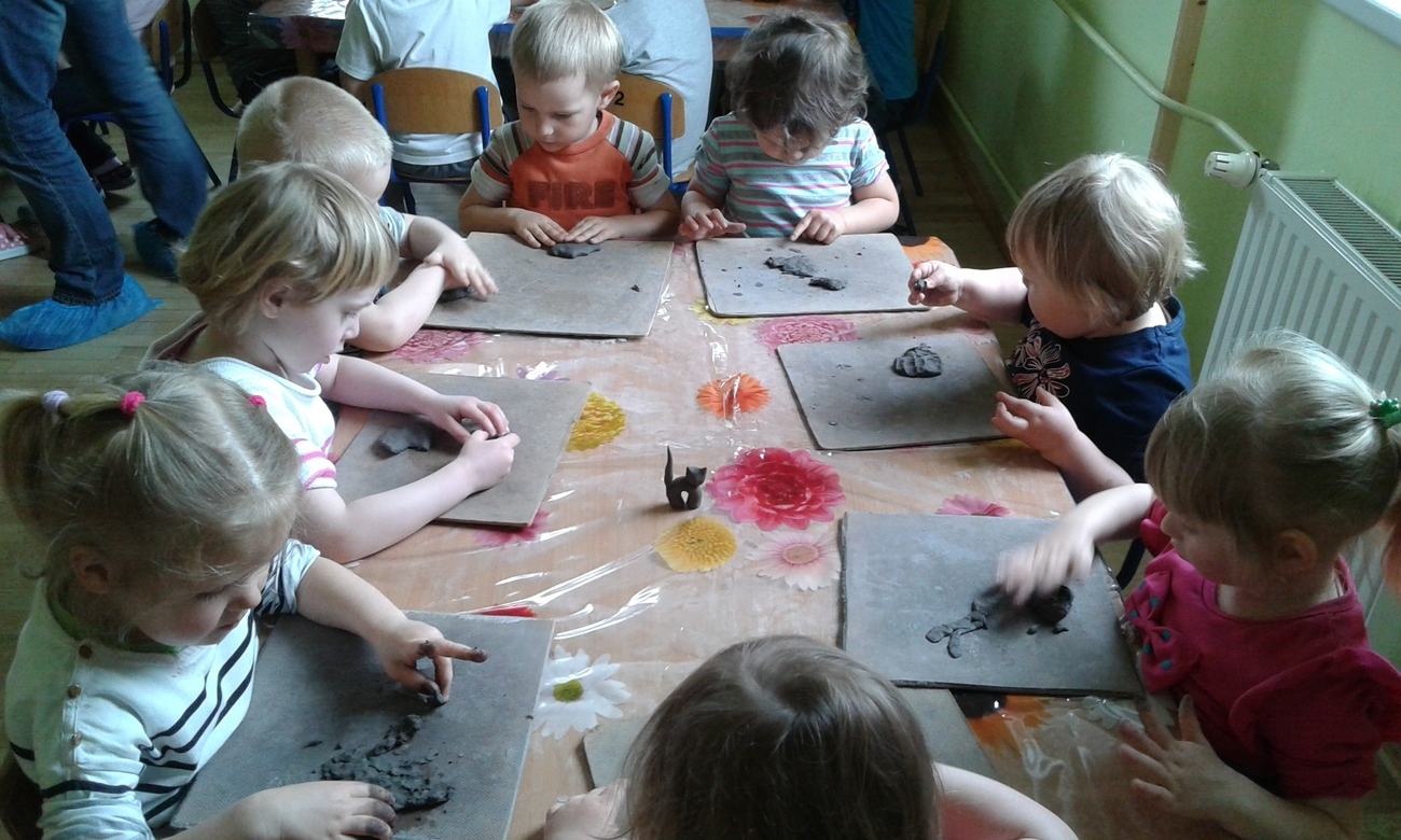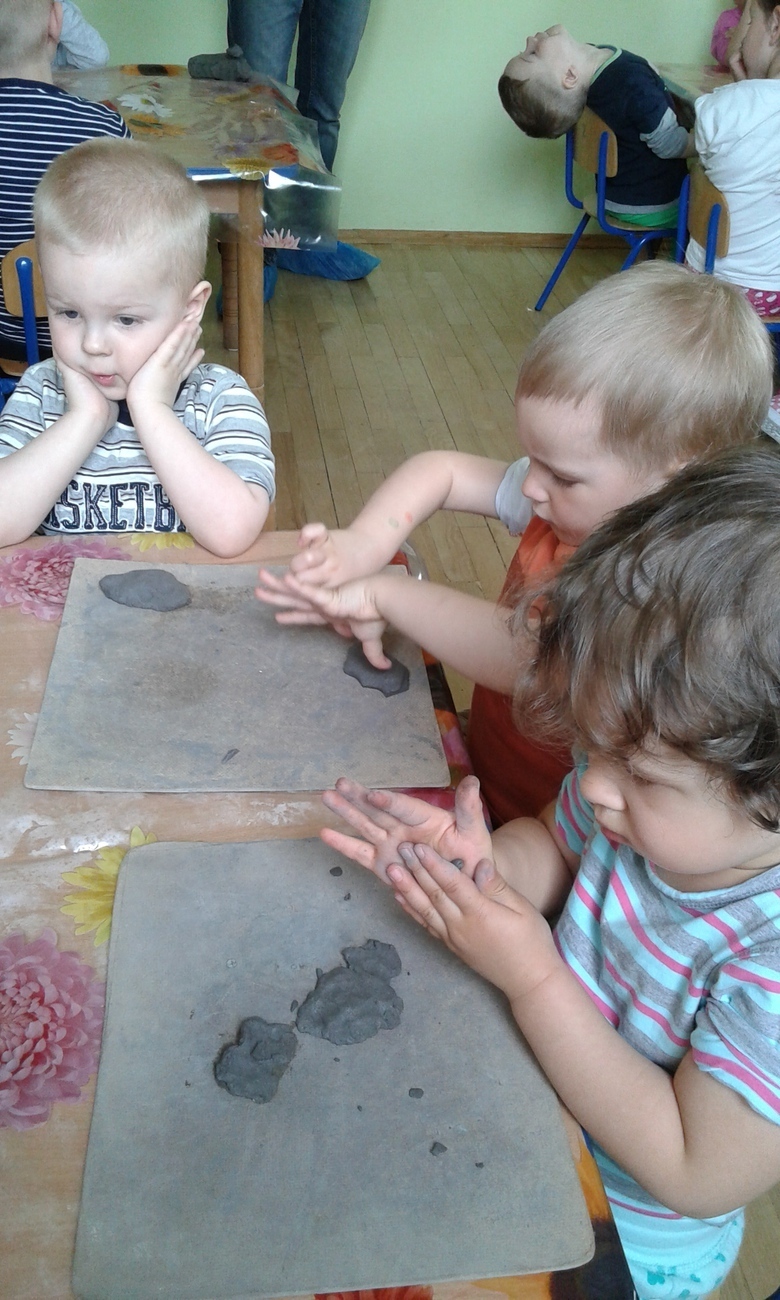 Dzieci otrzymały specjalne deseczki i mały kawałek gliny. Przedszkolaki były bardzo zdziwione, dlaczego glina jest taka zimna i czemu tak strasznie brudzi ręce. Natomiast z drugiej strony ogromnie zachwycone tak wspaniałą zabawą.