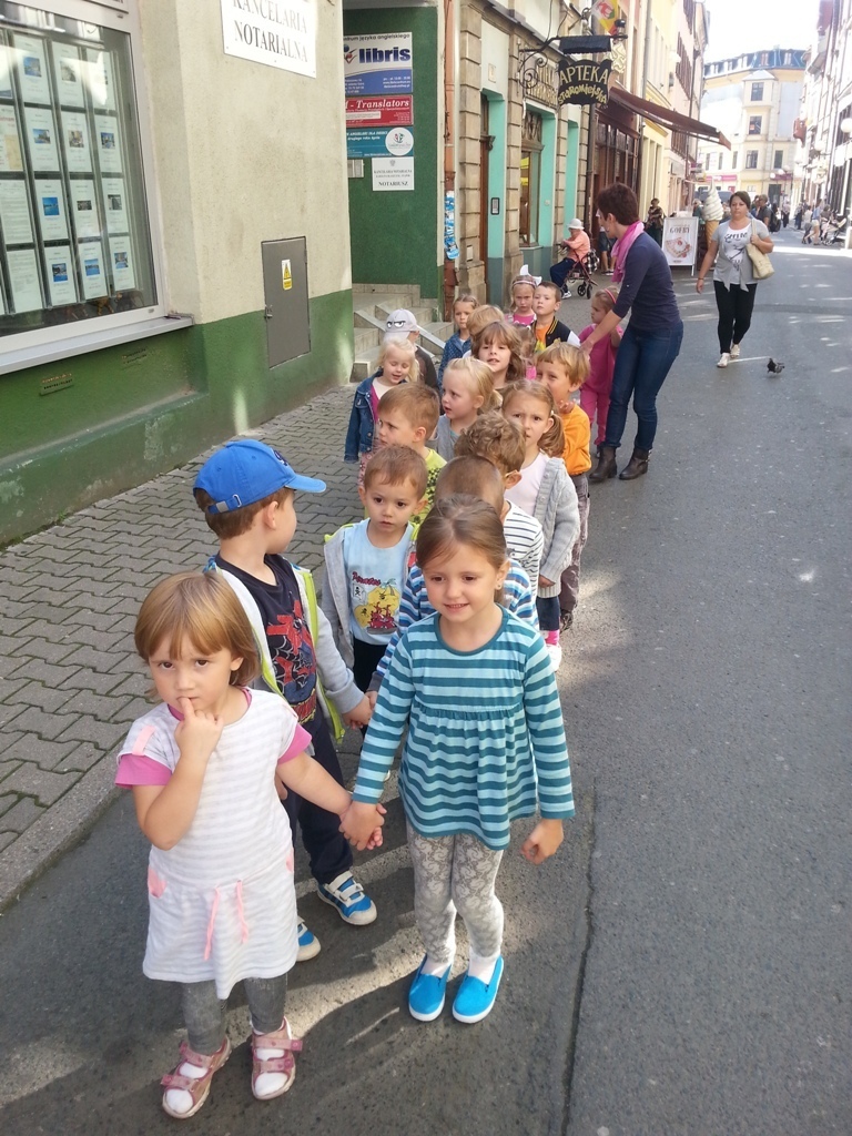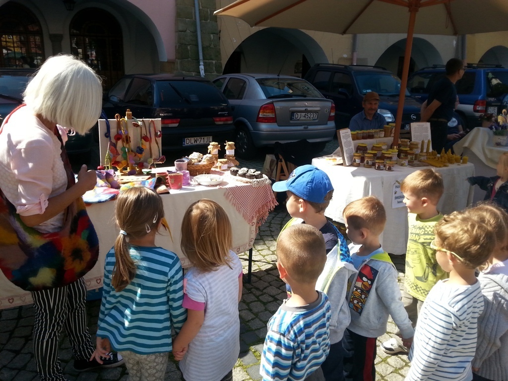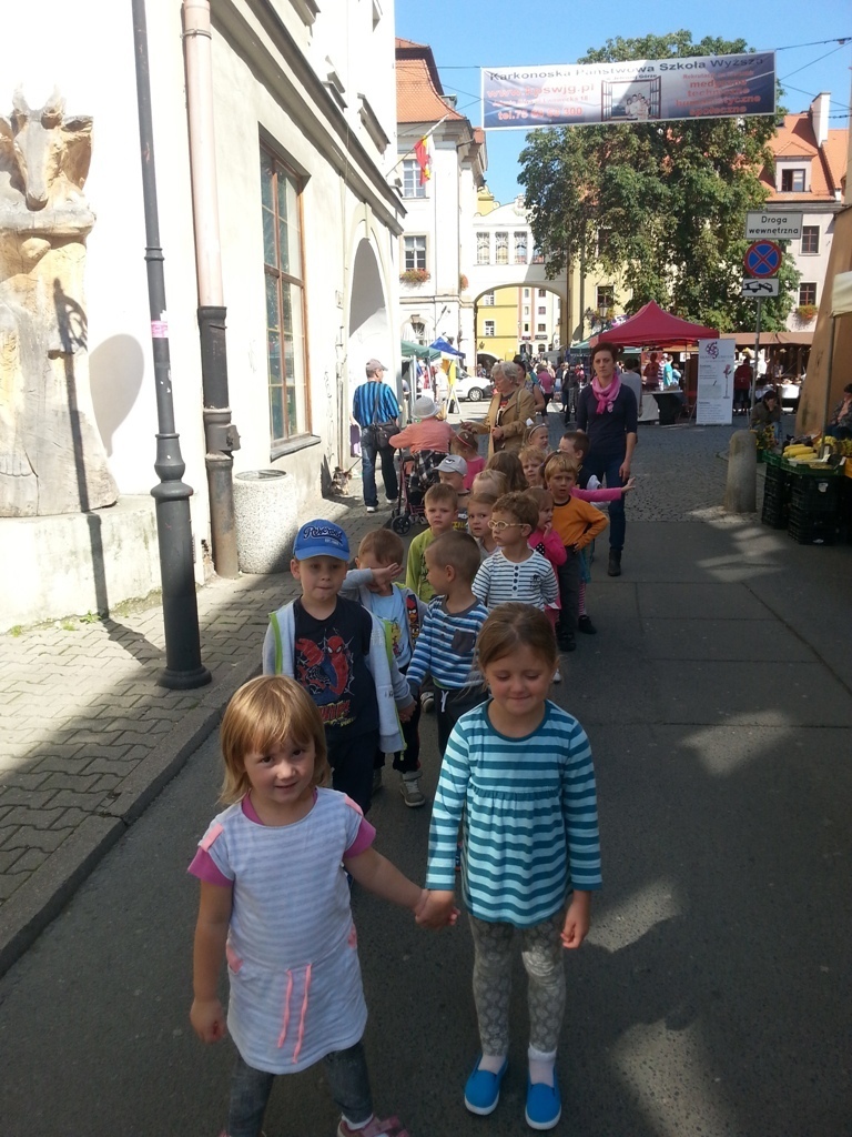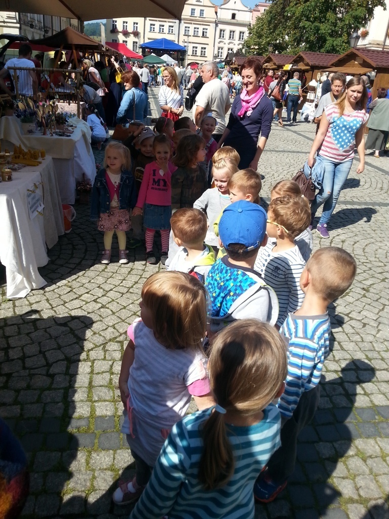 05.09.2014 r poszliśmy na Plac Ratuszowy podziwiać XII Wystawę Produktów Regionalnych „Wyprodukowano pod Śnieżką”. Przedszkolaki dowiedziały się dlaczego miejsce, na którym zlokalizoawna jest impreza, nazywa się Placem Ratuszowym. Kolejno obeszliśmy wszystkie stoiska. Każdy mógł podziwiać wszelakie różności od świeczek, poprzez wyroby pszczelarskie i zdrową żywność, aż po ręcznie zdobione bombki choinkowe. Mieliśmy też okazję odwiedzić stoisko pani Heni (naszej przedszkolnej psycholog). Pokazała nam jakie rzeczy można wykonać z filcu.