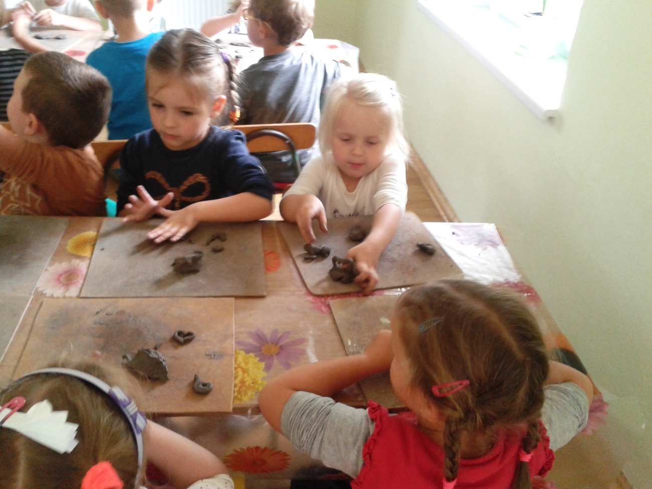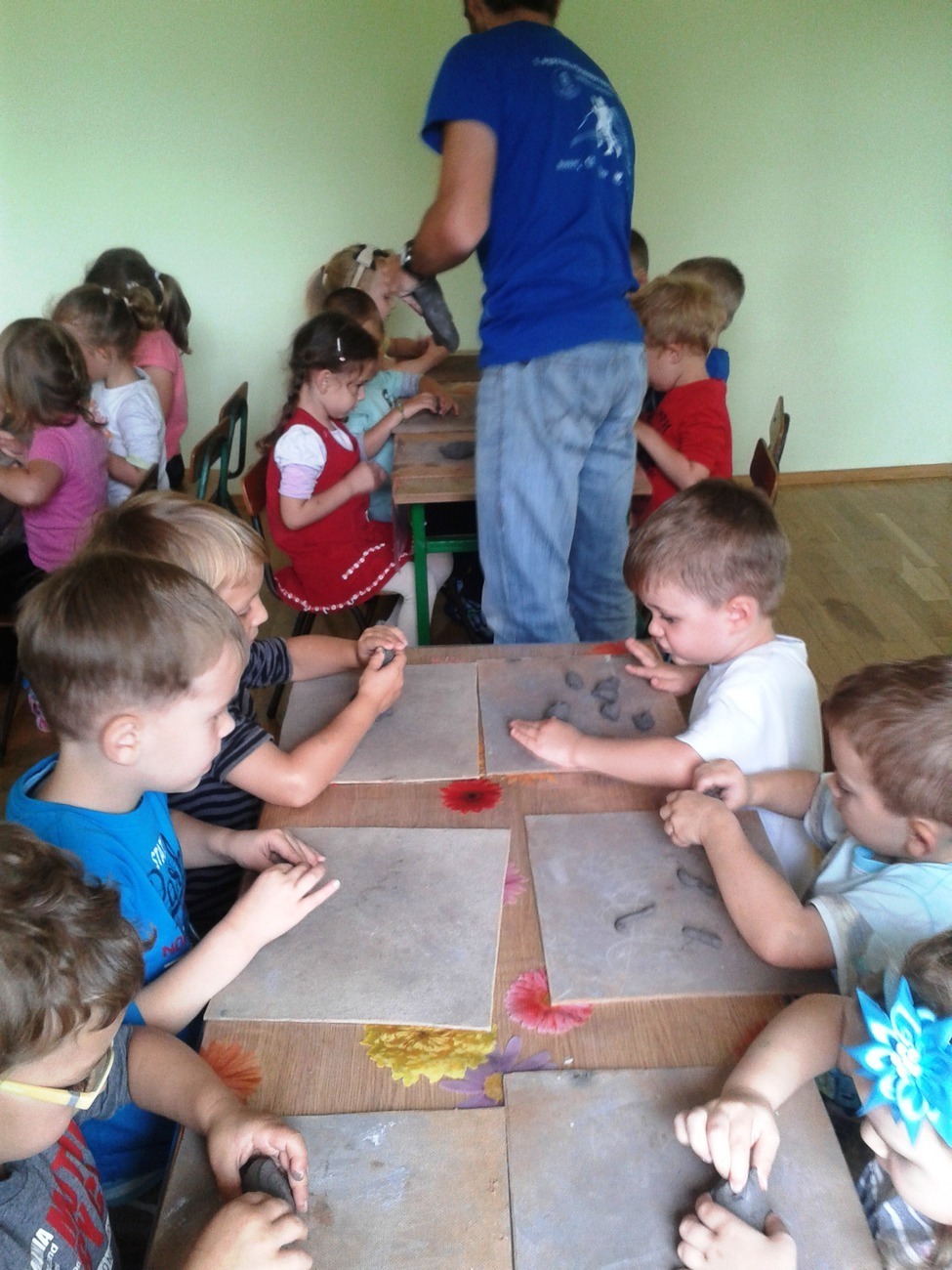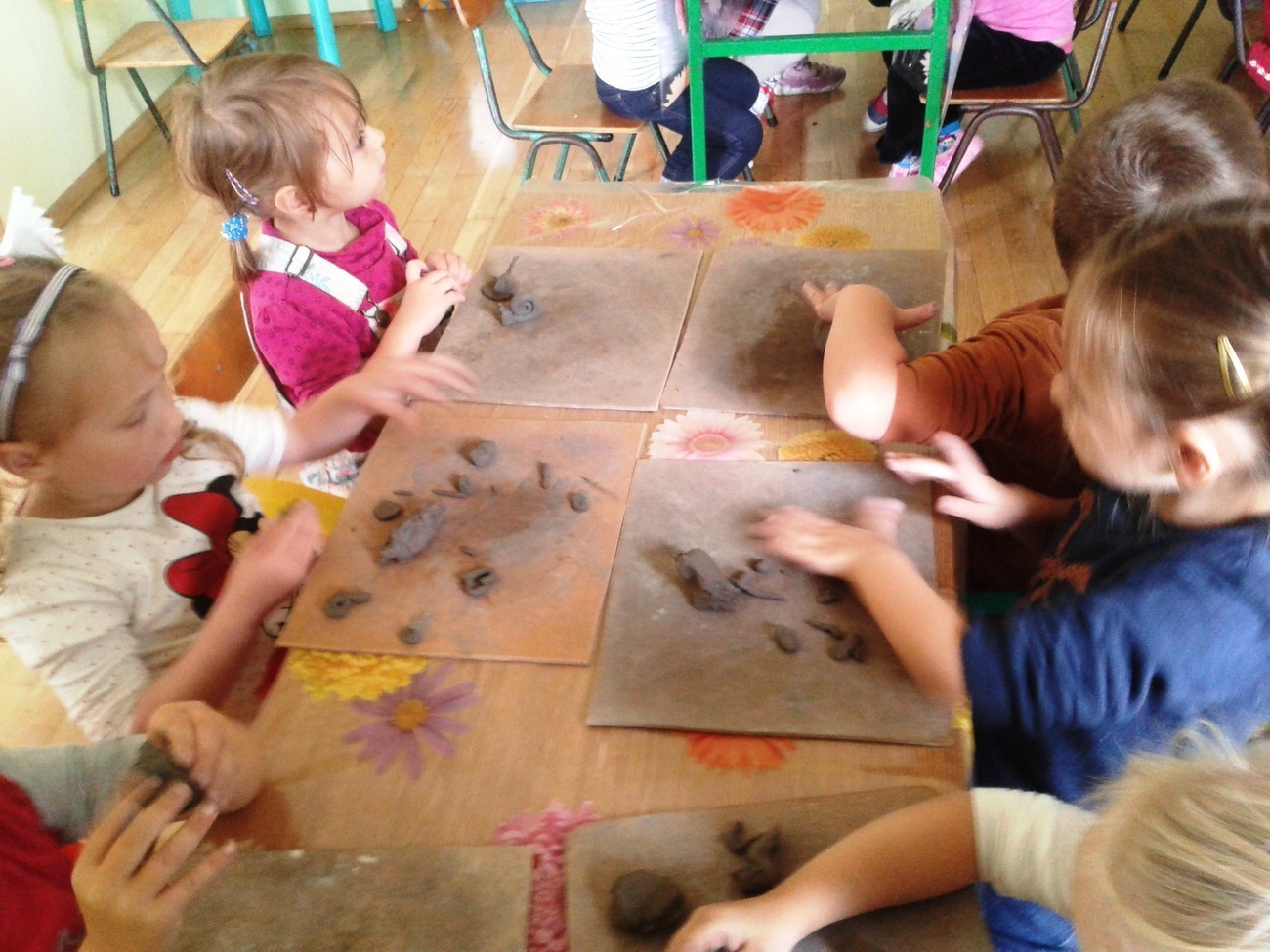 Środa 10.09.2014r. dla Żabek była bardzo ciekawym dniem. To właśnie wtedy, grupa odbyła swoje pierwsze zajęcia z ceramiki. Dzieci były podekscytowane nowymi zajęciami, w jakich uczestniczyły. Nowa technika plastyczna - glina, osoba prowadząca zajecia i forma zajęć. Wszyscy dokładnie wysłuchali instrukcji pana Rafała co do wykonania pracy. Wałkowanie, ugniatanie czy turlanie przysporzyło nieco kłopotów. Jednak po zakończeniu pracy wszyscy zgodnie uznali, że już chcieliby następne zajęcia.