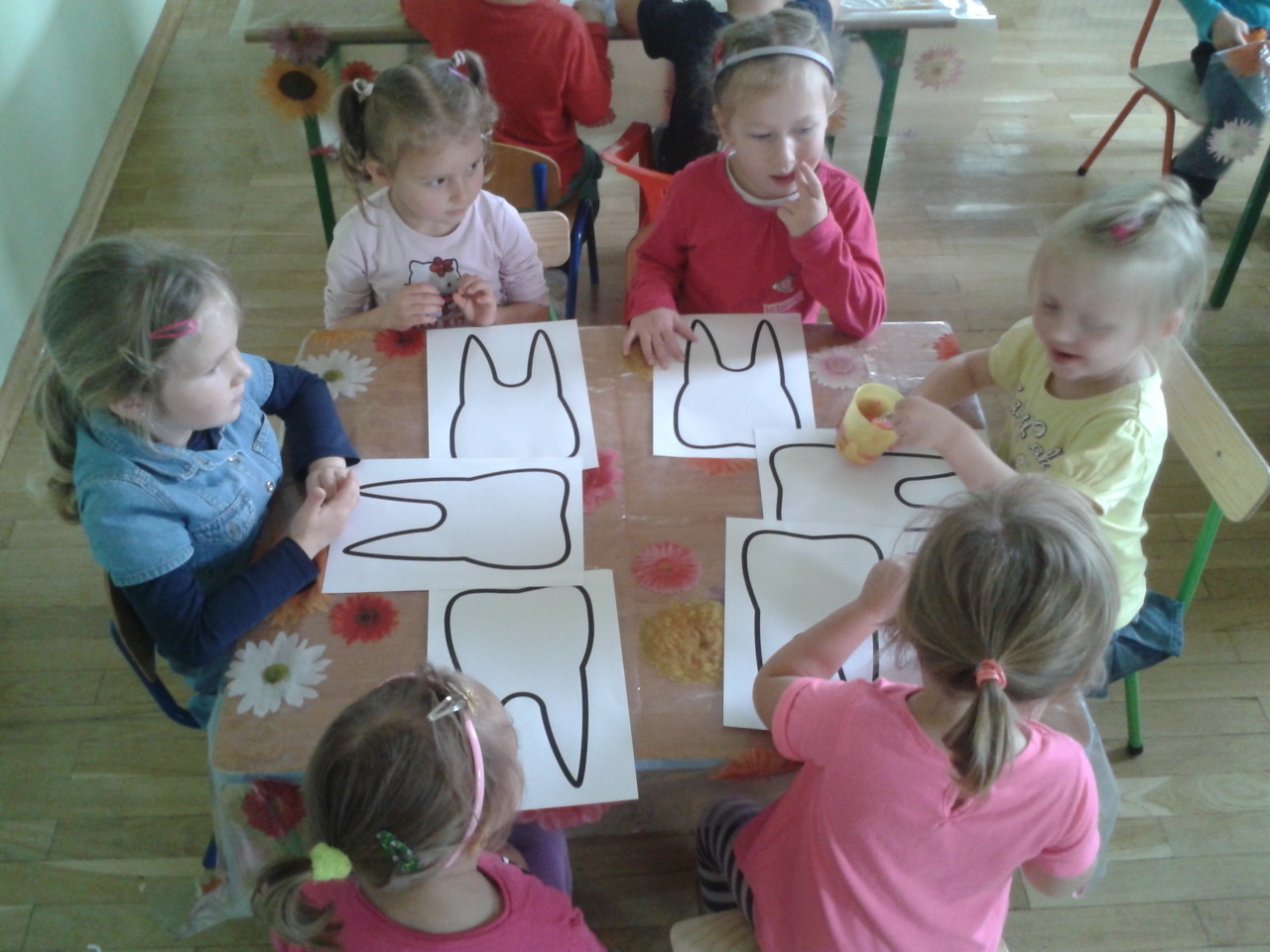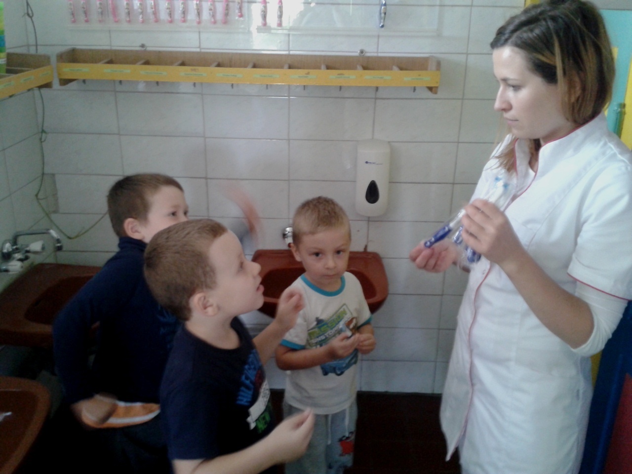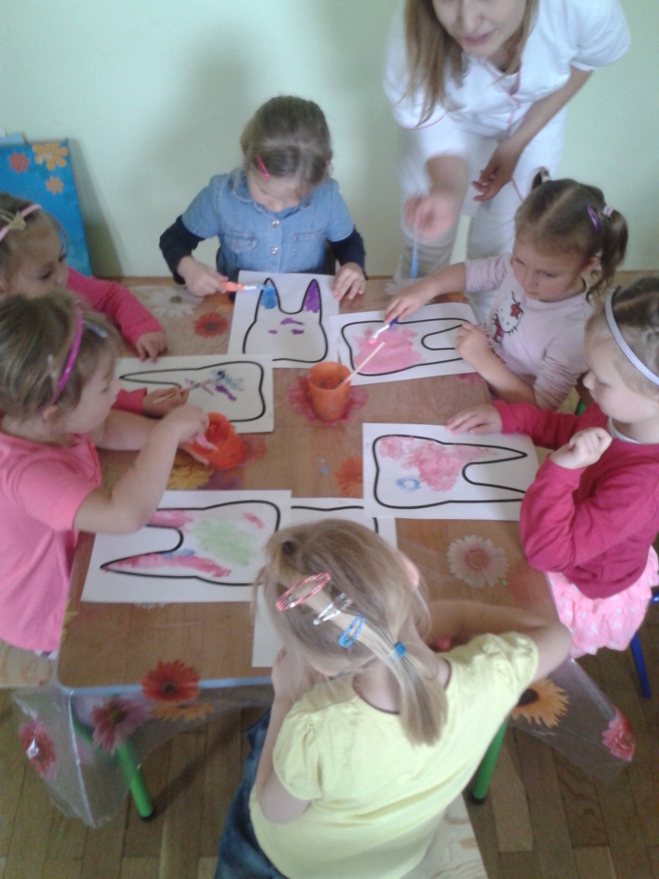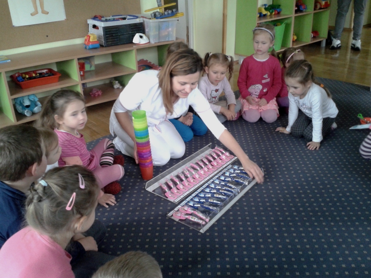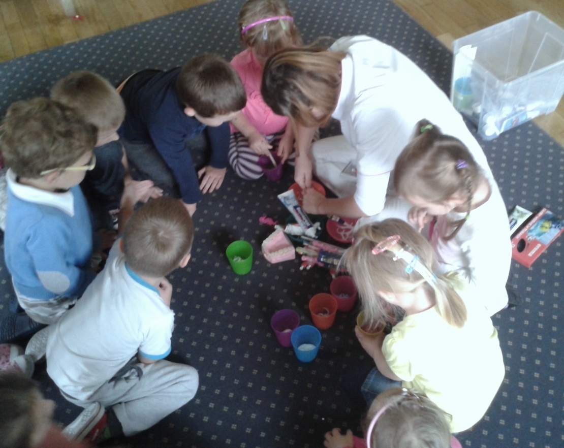 Pani Milena pokazała przedszkolakom przygotowane specjalnie dla nich ściankę, na której umocowane były ich nowe szczoteczki do zębów oraz kolorowe kubeczki. Wszystko pięknie podpisane ich imionami. Chłopcy otrzymali szczoteczki w kolorze niebieskim, natomiast dziewczynki w ich ulubionej barwie - różowej. Radości było co nie miara, ponieważ od razu każde z dzieci miało „obowiązek” wyszczotkowania zębów nowymi przyborami i przeznaczona specjalnie dla nich pastą. Na koniec naszego spotkania wszystkie dzieci otrzymały od pani Mileny naklejkę szczęśliwego ząbka, która była nagrodą za fantastyczny i aktywny udział dzieci w dzisiejszych warsztatach.