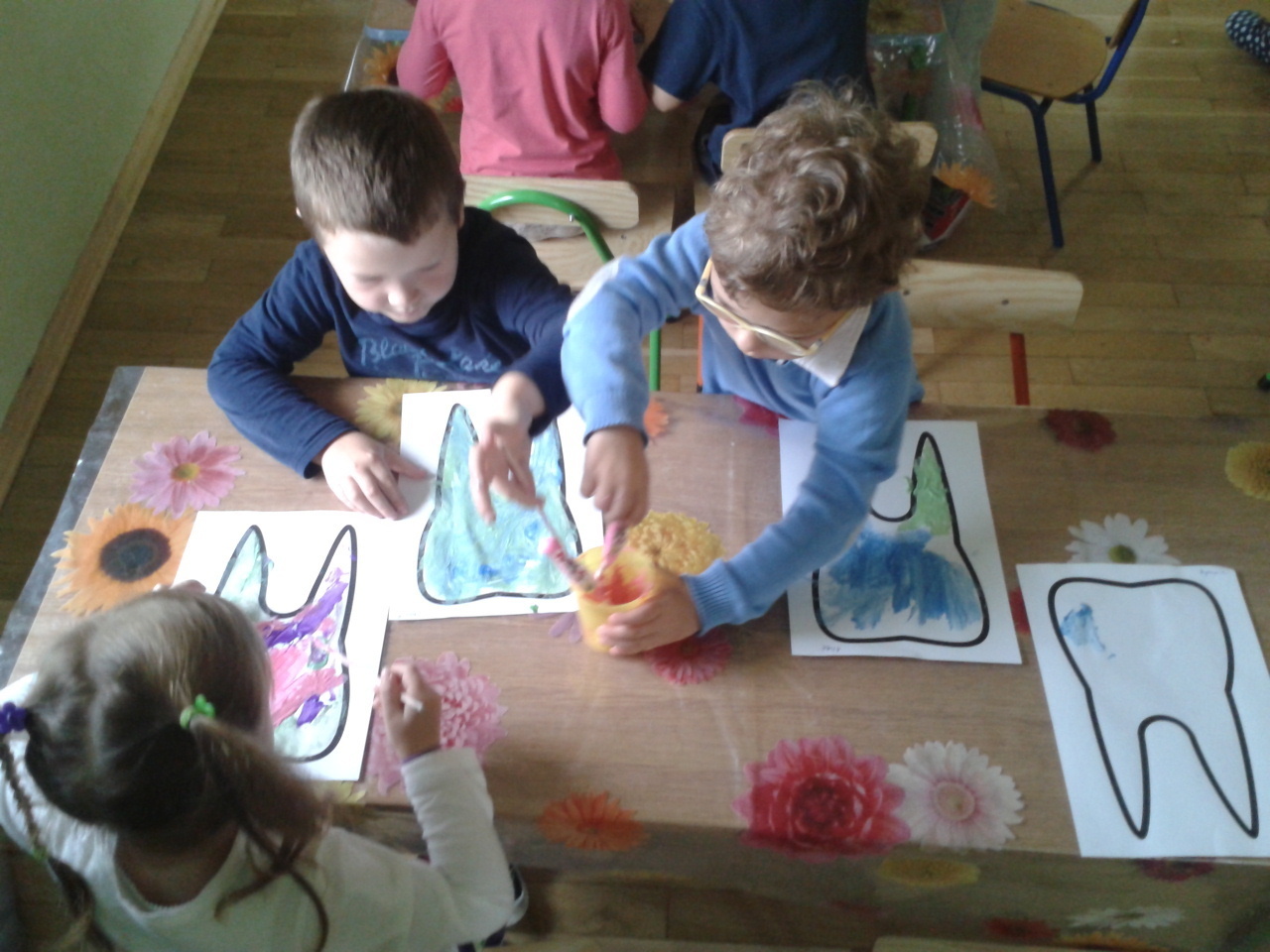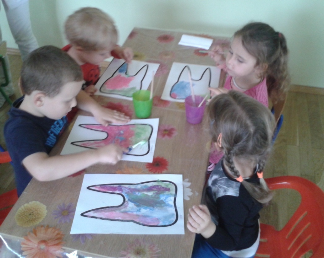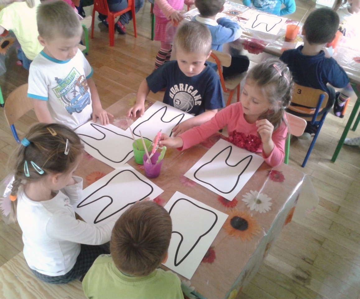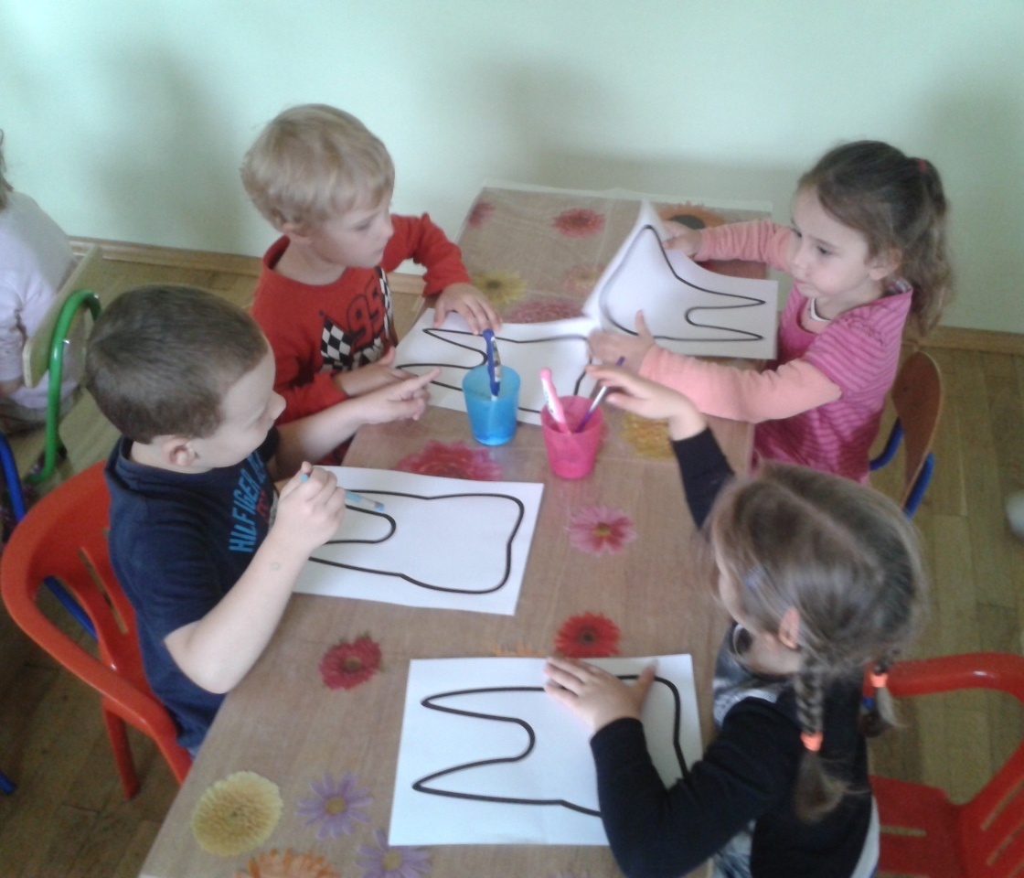 Dzięki rodzicom i ich aprobacie Żabki rozpoczęły dziś nową „wyprawę” po zdrowy uśmiech wraz z KidDentClubem. Pierwsza wizyta pani stomatolog spotkała się z olbrzymim entuzjazmem. Dzieci z wielką uwagą wysłuchały zasad prawidłowego dbania o zęby, zadawały mnóstwo pytań i udzielały odpowiedzi na wszystkie, które zadawała im pani Milena (stomatolog). Każdy z naszych przedszkolaków dokładnie przyjrzał się wyglądowi sztucznej szczęki i prawidłowym sposobem szczotkowania zębów. Kolejnym etapem było malowanie przy użyciu szczoteczek i wymieszanej z kolorowymi barwnikami pasty do zębów, konturów „wesołego” ząbka. Po chwili pracy przyszedł czas na najbardziej wyczekiwany moment.