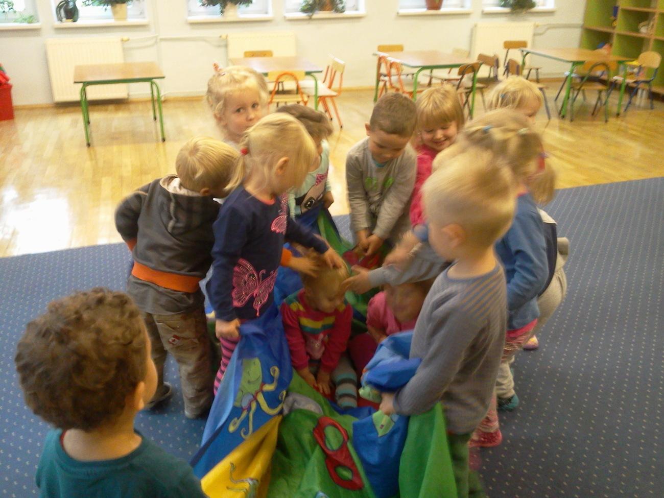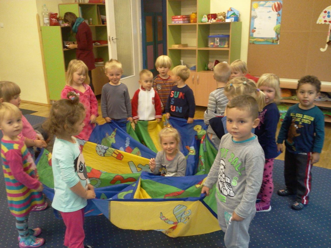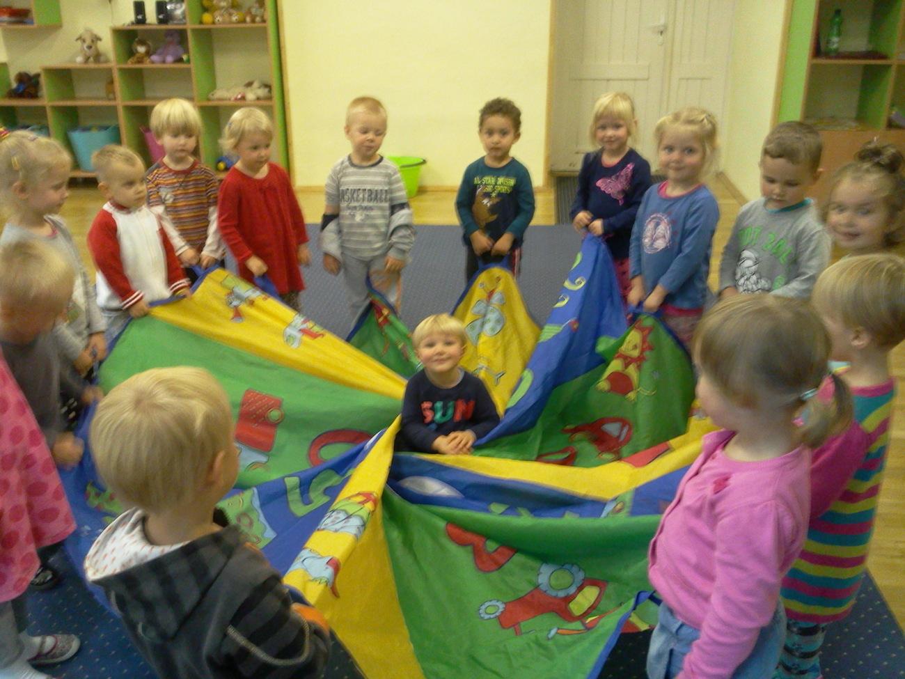 Chustę można podrzucać, można się pod nią chować, można być na niej zakręconym i odkręconym, można po niej przetaczać przedmioty ku sobie. To jest właśnie to, co Tygryski lubią najbardziej - wspaniałą zabawę!