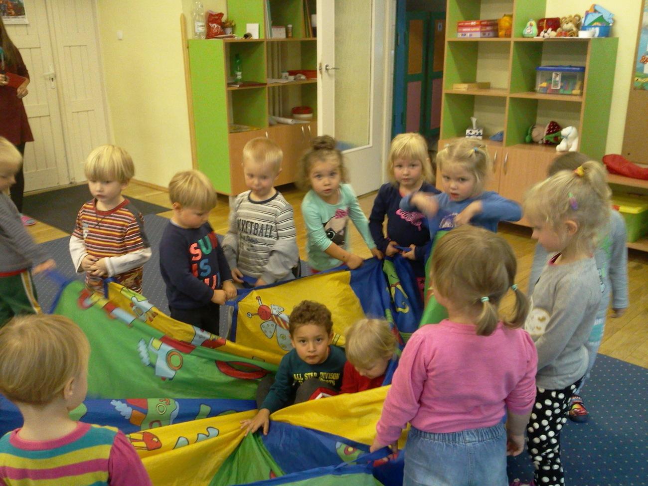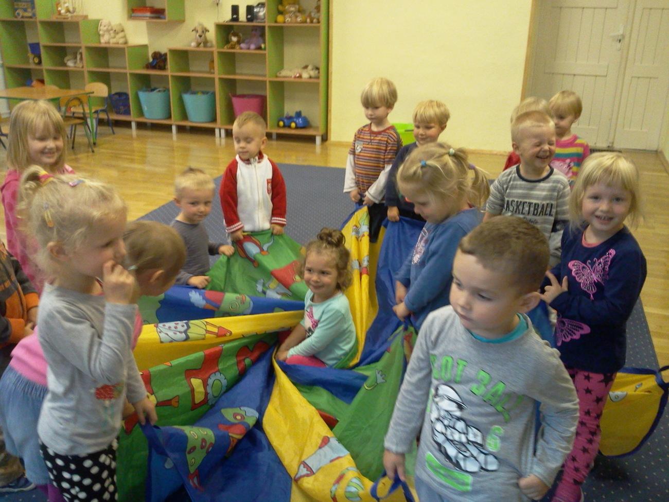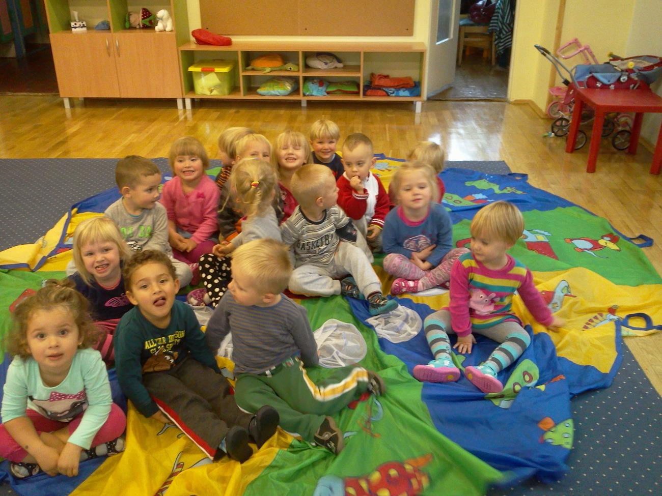 Chustę można podrzucać, można się pod nią chować, można być na niej zakręconym i odkręconym, można po niej przetaczać przedmioty ku sobie. To jest właśnie to, co Tygryski lubią najbardziej - wspaniałą zabawę!