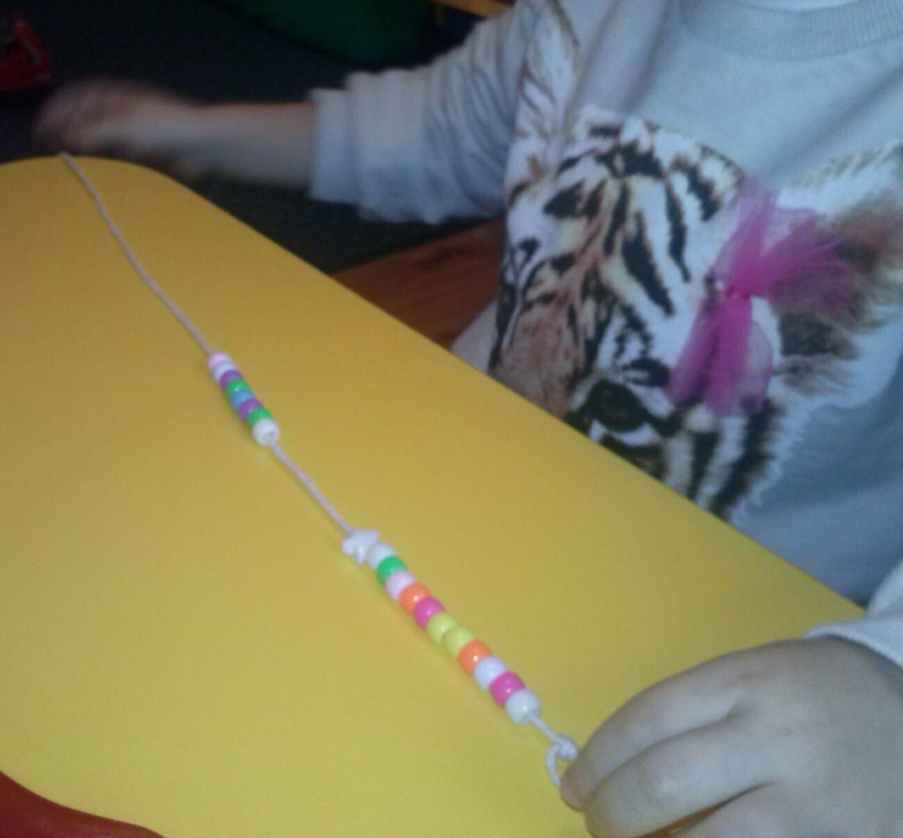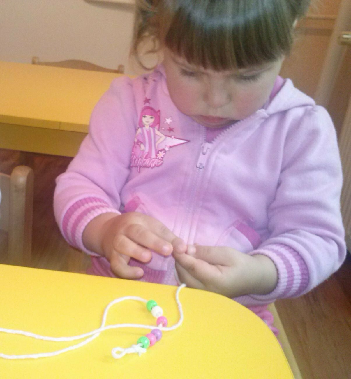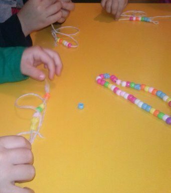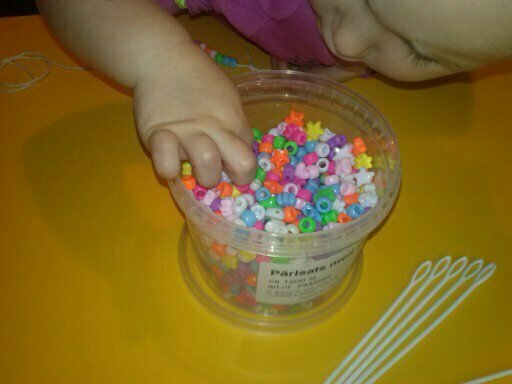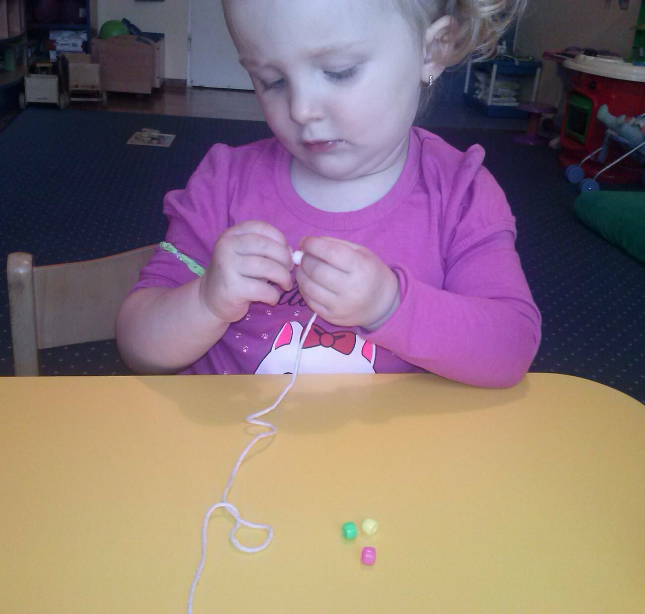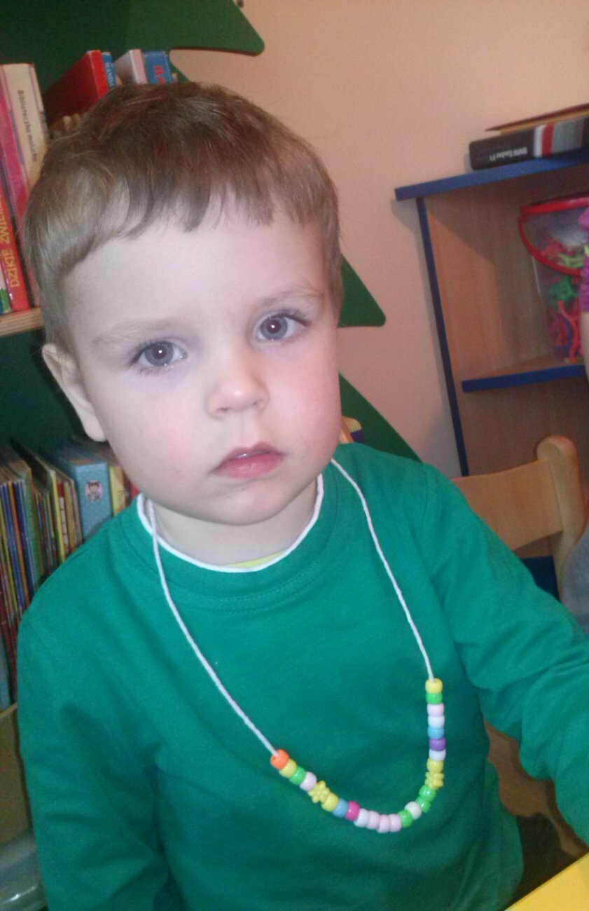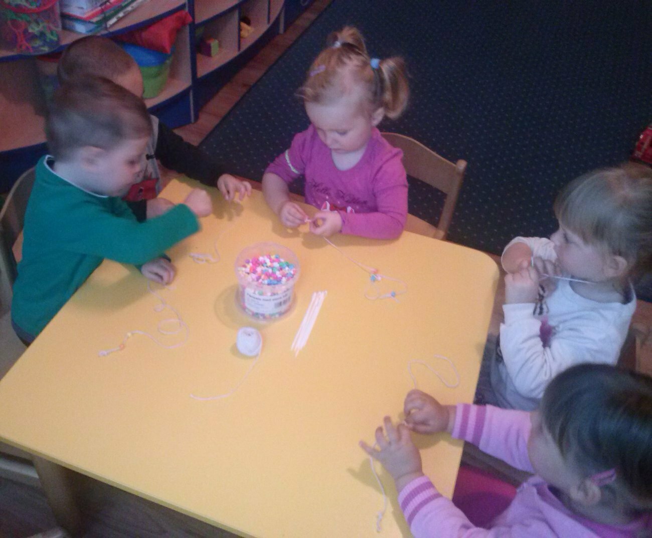 Dziś w przedszkolu trenowaliśmy sprawność naszych rączek. Była to przy tym świetna zabawa. Tworzyliśmy własne korale. Korzystając z przygotowanych przez naszą panią różnokolorowych paciorków i grubych nici oraz fantazji i inwencji tworzyliśmy fantazyjne naszyjniki i bransolety. Nie było to łatwe zadanie, gdyż nizanie koralików na nitkę wymaga skupienia i wielkiej koncentracji. Dobór barw również nie jest łatwy i żeby stworzyć naprawdę ładny naszyjnik trzeba użyć wyobraźni i nieźle się napracować. Warto było się pomęczyć, bo teraz możemy z dumą prezentować nasze wyroby i wzbudzać zazdrość i podziw innych przedszkolaków.