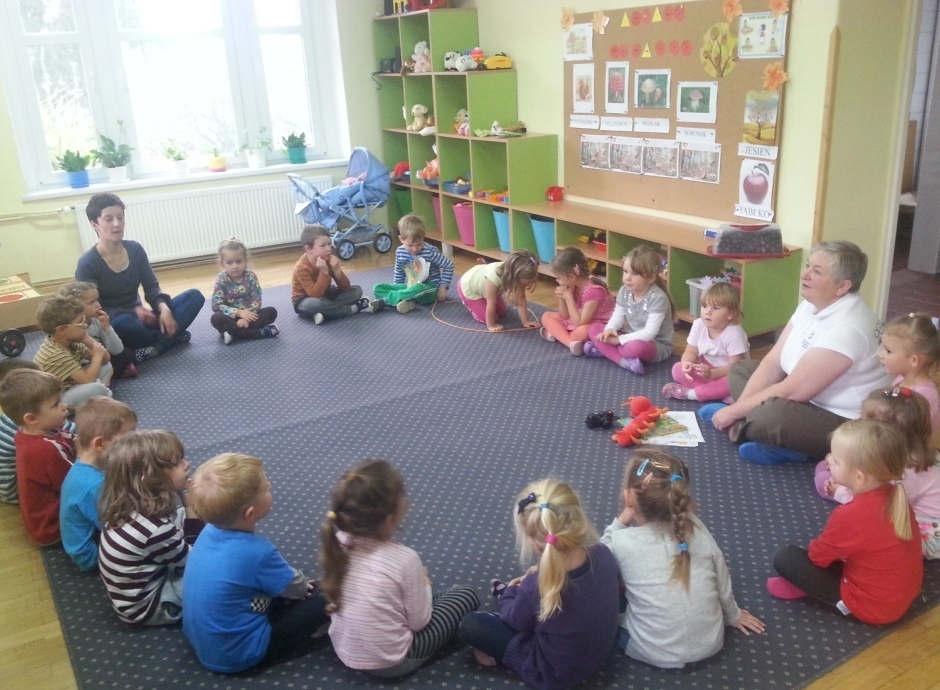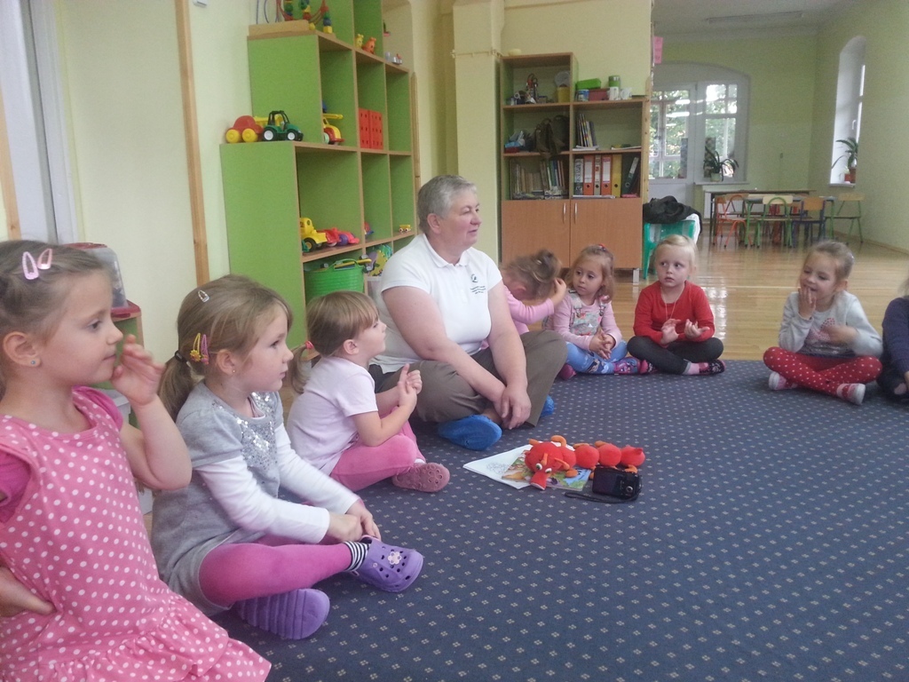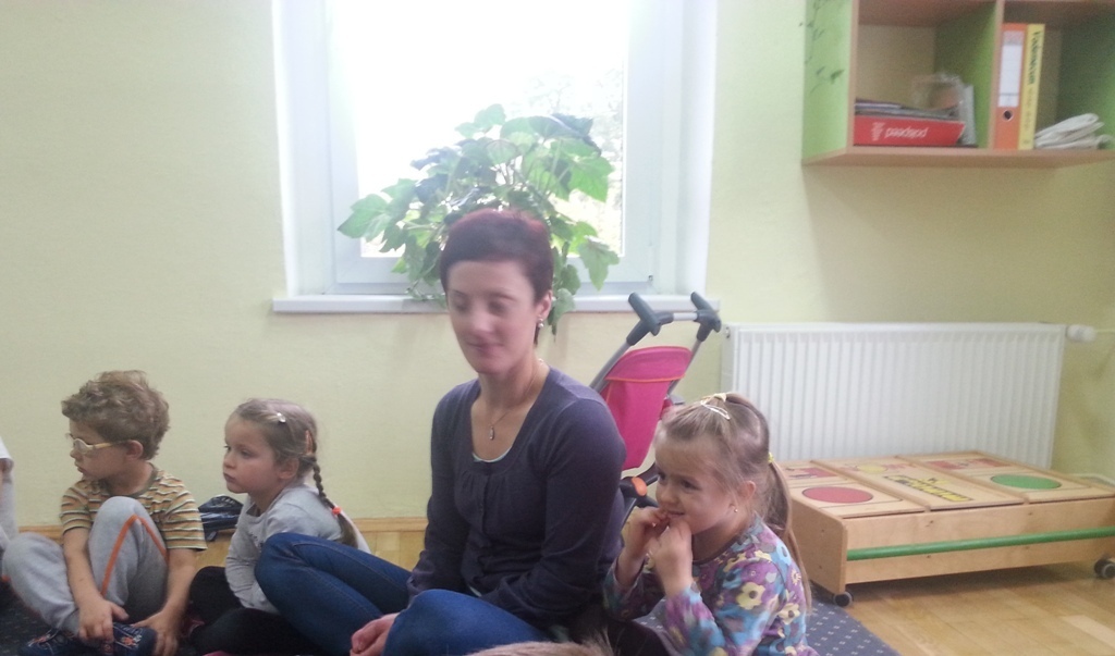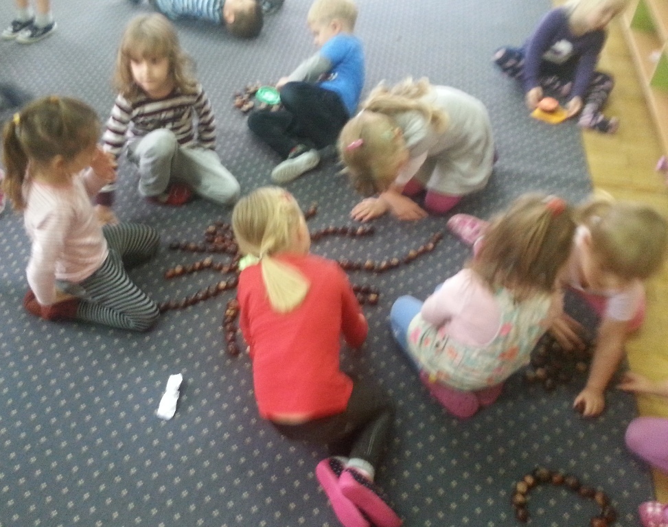 Dnia 16.10.2014 kolejny raz odwiedziła nas pani Bogusia - edukator z Nadleśnictwa Śnieżka w Kowarach. Tym razem opowiadała nam o drzewach rosnących w lesie oraz o tym jakie dają owoce. Dowiedzieliśmy się, że takie owoce jak żołędzie, kasztany czy orzechy mogą być pożywieniem dla zwierząt żyjących w lesie. Pani Bogusia przywiozła ze sobą całe pudełko kasztanów, z których powstały przecudne układanki, które wspólnie tworzyliśmy. Na pożegnanie pani Bogusia obdarowała nas tymi kasztanami. Niedługo powstaną z nich kolejne piękne prace.