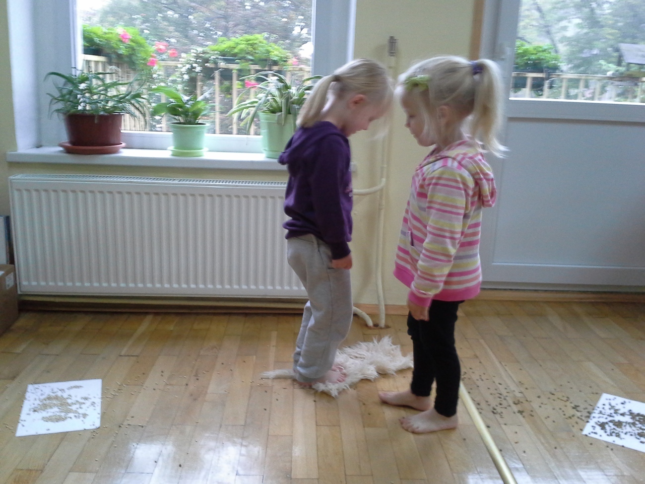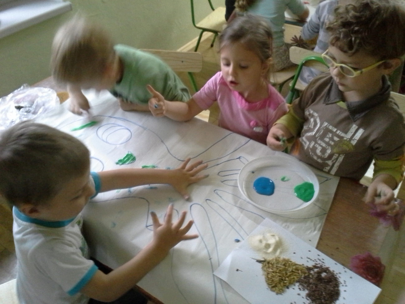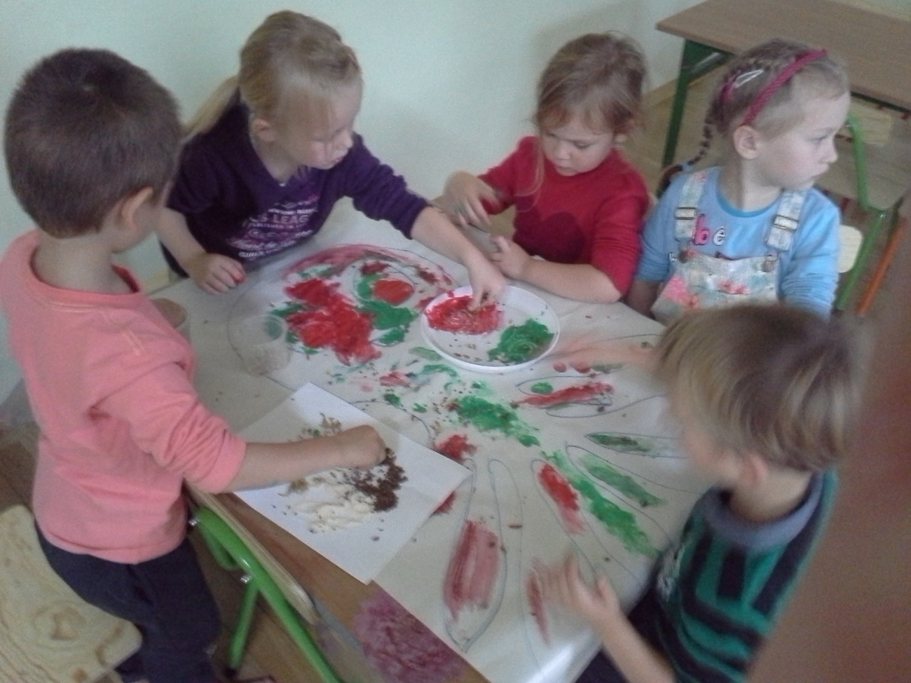 Kroczyliśmy ścieżką zmysłów, gdzie czekały na nasze stopy i dłonie ziarna pszenicy, kaszy, mięciutkie futerko, folia bąbelkowa i miękki materiał. Następnie przy użyciu naszych paluszków i farby wymieszanej z ziarnami pokolorowaliśmy portret ośmiorniczki Emmy. Ależ to była zabawa!