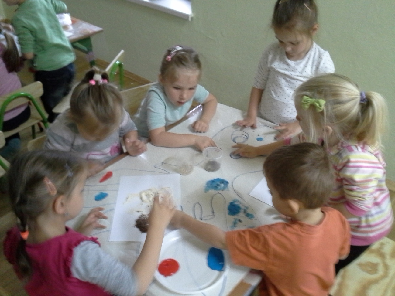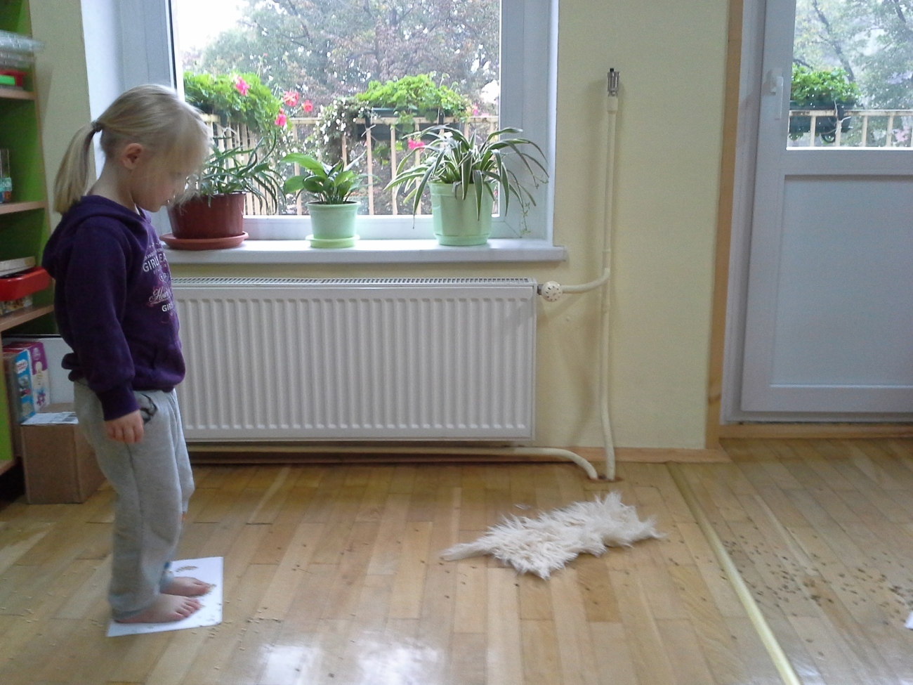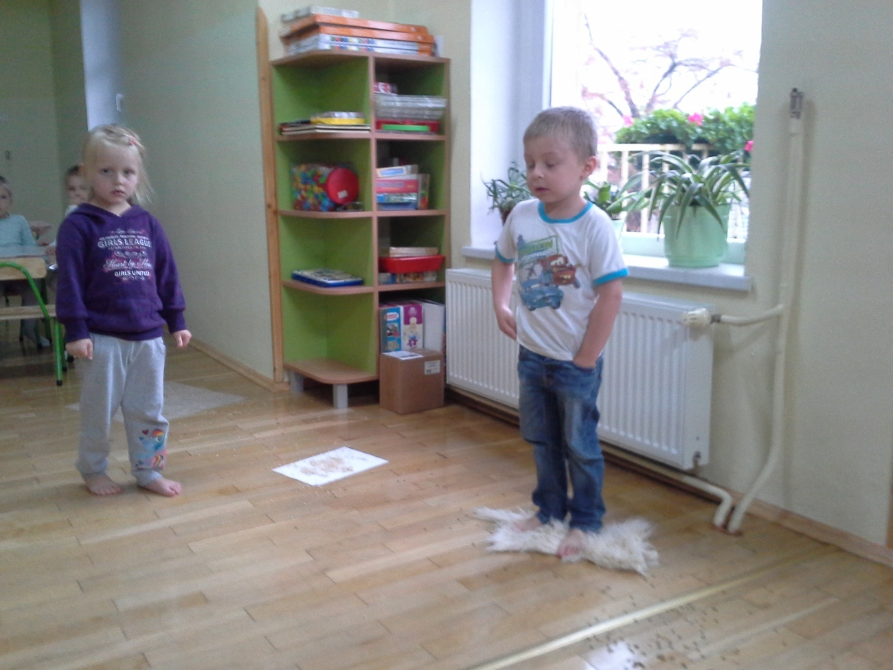 Kroczyliśmy ścieżką zmysłów, gdzie czekały na nasze stopy i dłonie ziarna pszenicy, kaszy, mięciutkie futerko, folia bąbelkowa i miękki materiał. Następnie przy użyciu naszych paluszków i farby wymieszanej z ziarnami pokolorowaliśmy portret ośmiorniczki Emmy. Ależ to była zabawa!