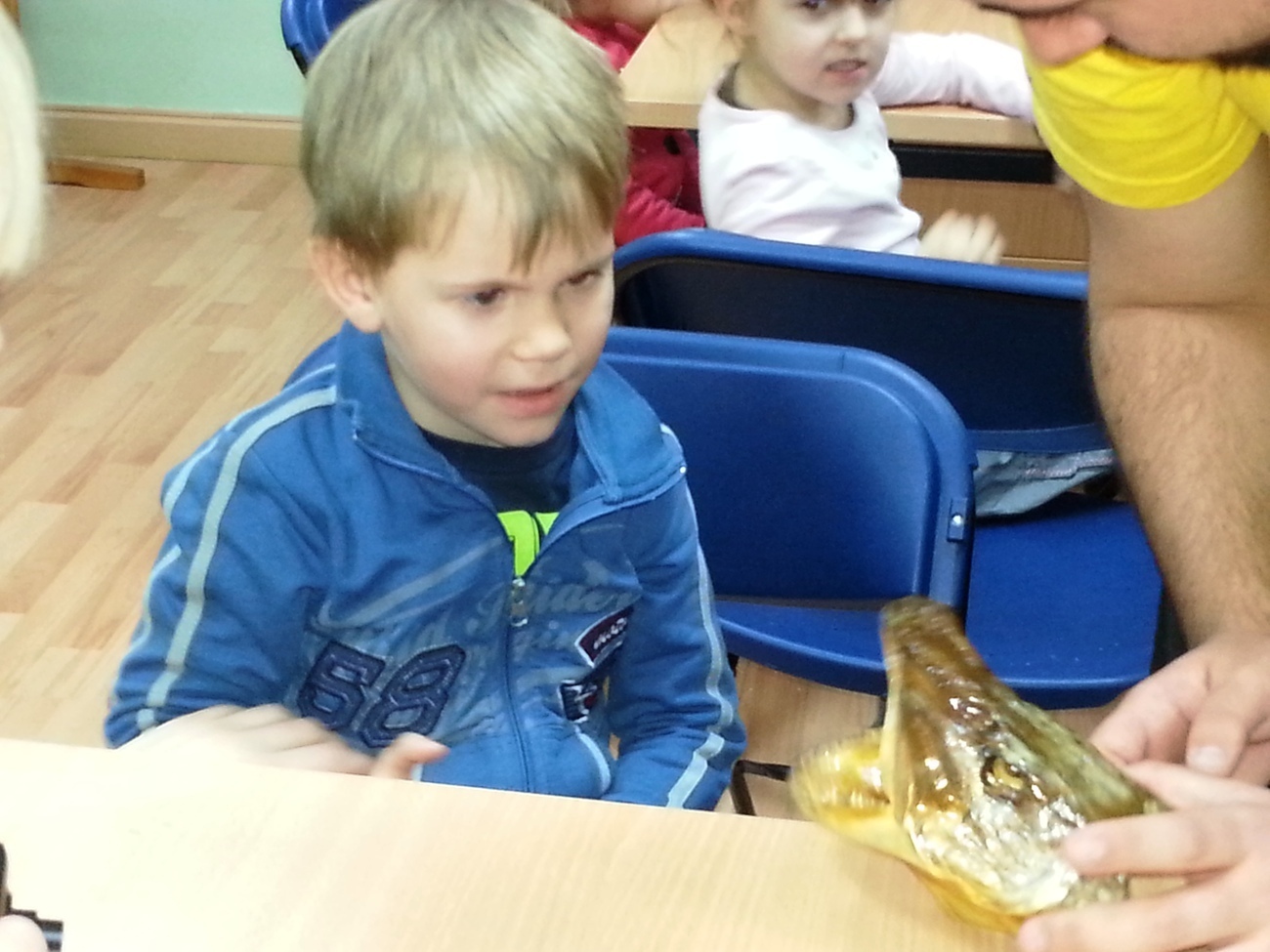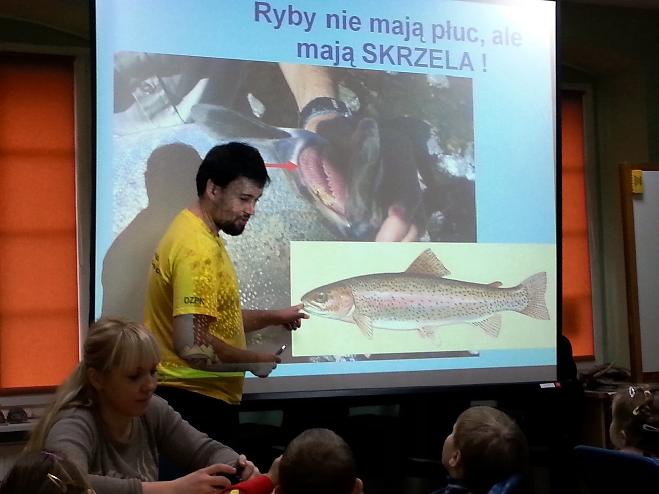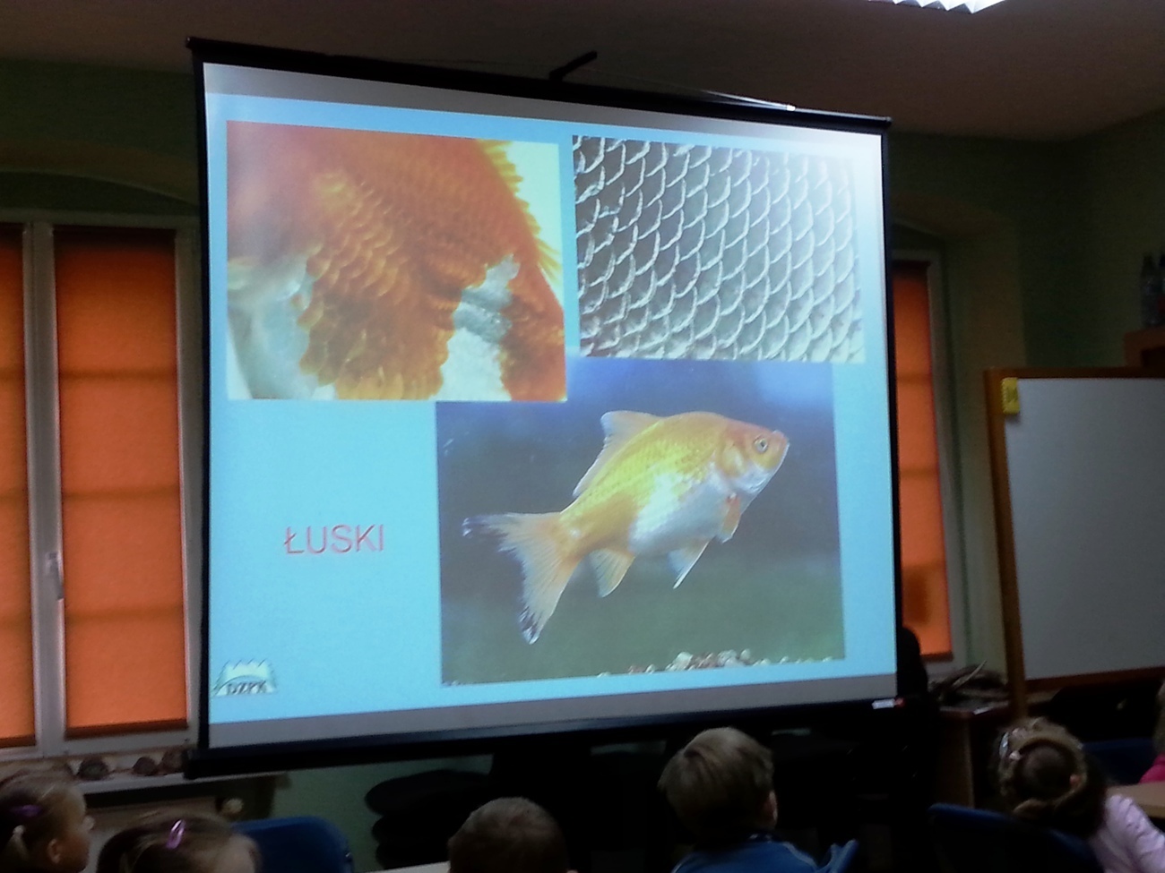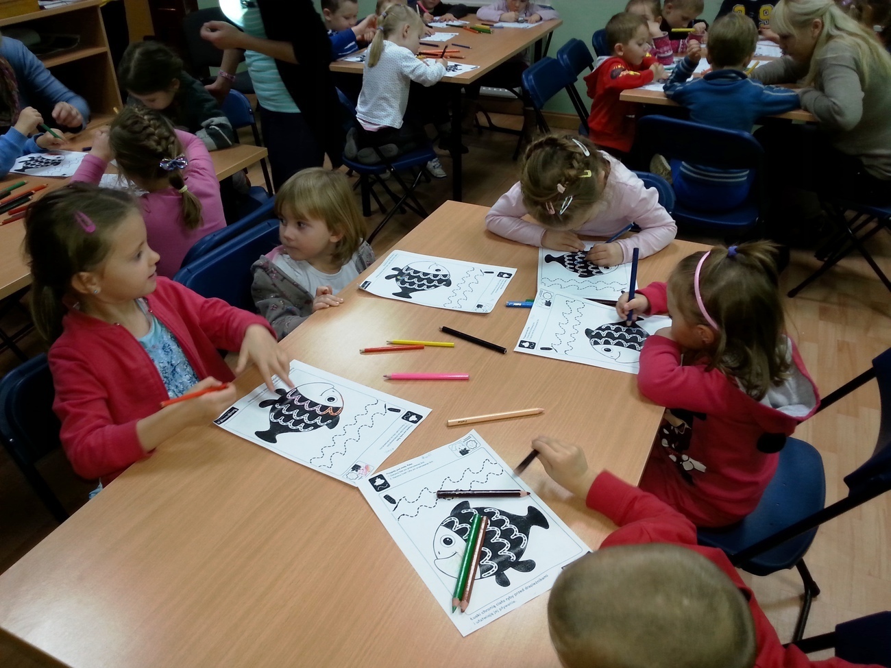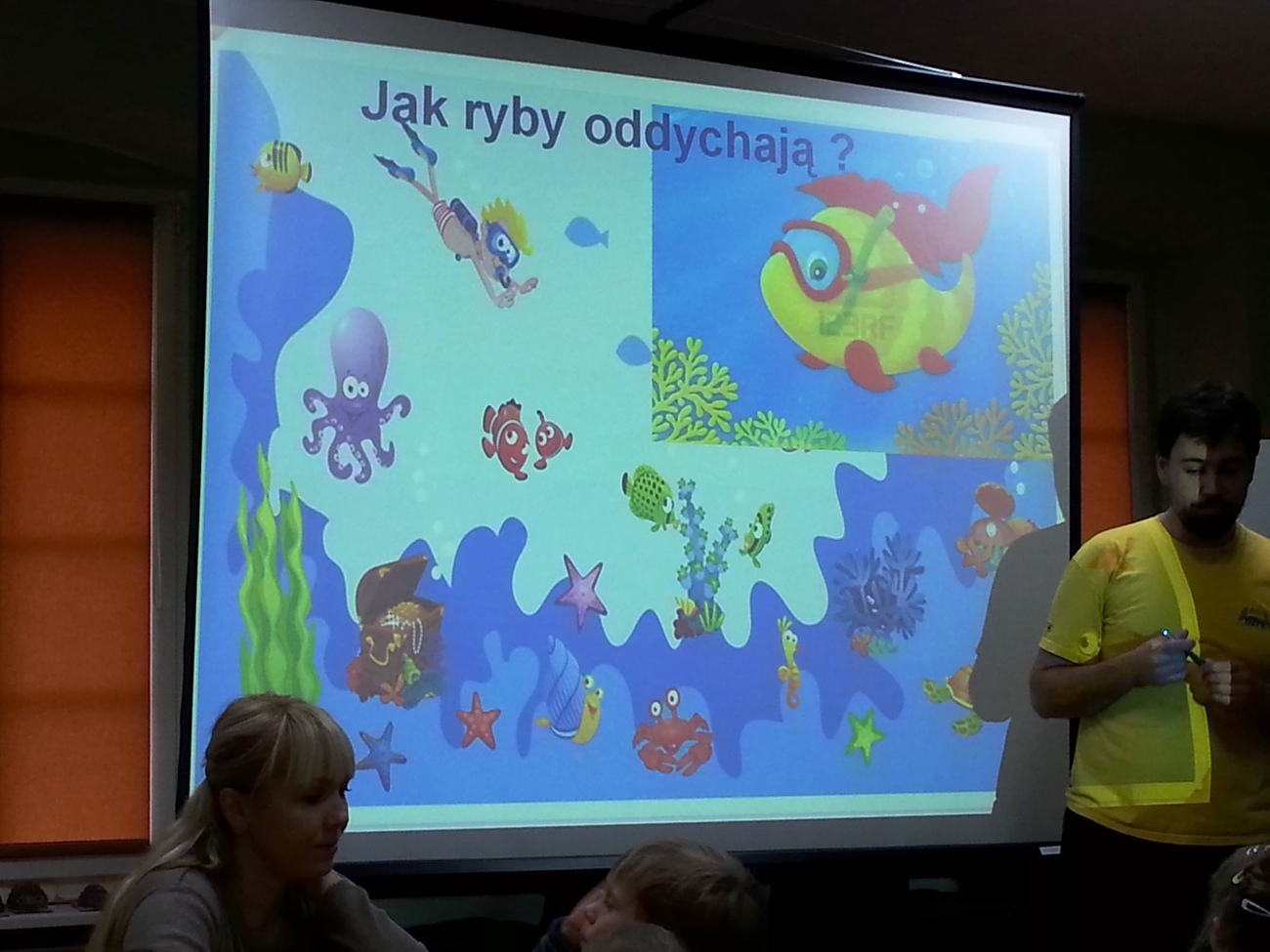 Opowieść o rybach rozpoczęła się wesołym wierszem Jana Brzechwy pt. „Ryby”, który przeczytał pan Wiktor, a my poznaliśmy dzięki temu nazwy różnych ryb: sum, okoń, leszcz, szczupak, karp i inne. Poznaliśmy bardzo trudne słowo: ICHTIOLOGIA - jest to nauka o rybach. Dowiedzieliśmy się wielu ciekawych rzeczy, na przykład, że okoń jest kuzynem "Nemo" i, że ryby nie toną dzięki płetwom i pęcherzowi pławnemu oraz, że łuski chronią skórę ryb przed otarciami i zranieniem. Pan Wiktor pokazał nam w jaki sposób oddychają ryby oraz powiedział, że mają do tego celu skrzela. Wiemy też co jedzą ryby. Oprócz wysłuchania pogadanki mieliśmy okazję dotknąć zębów szczupaka i sprawdzić jakie są ostre oraz malowaliśmy kolorowanki i rozwiązywaliśmy zagadki przygotowane przez pana Wiktora.