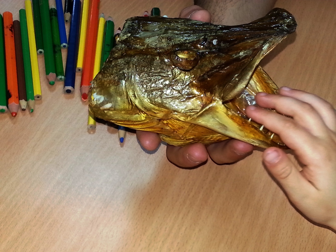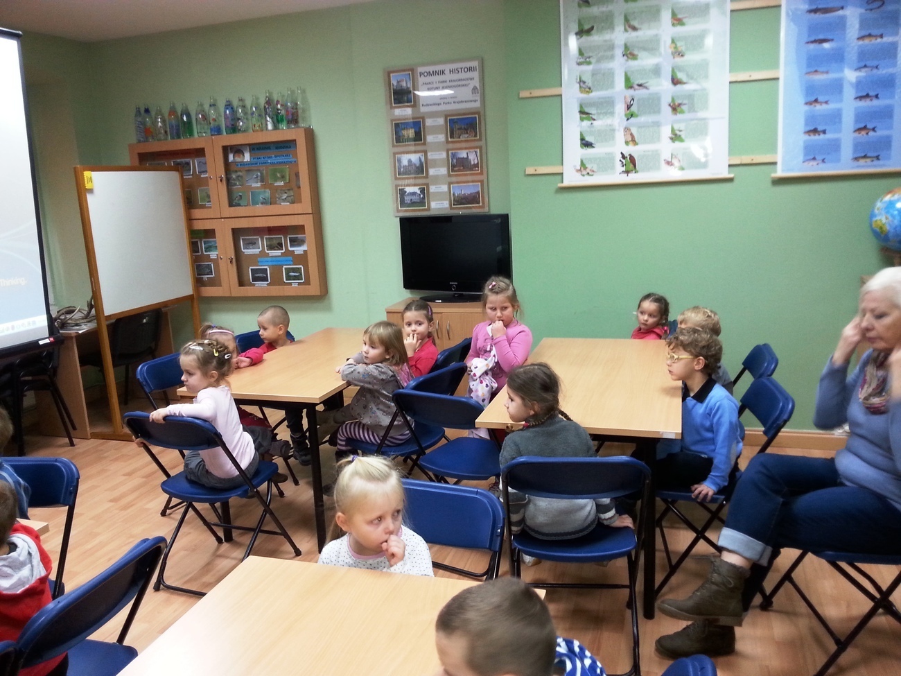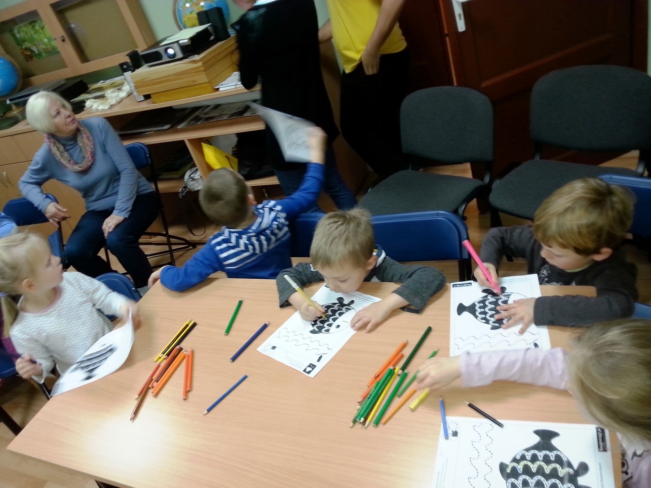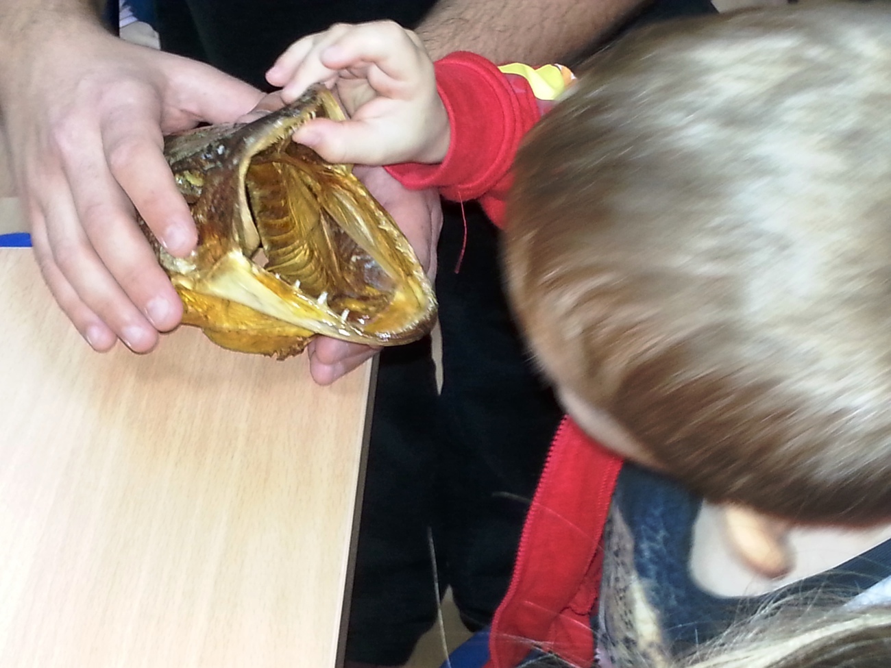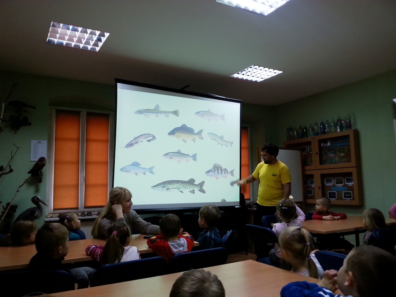 Opowieść o rybach rozpoczęła się wesołym wierszem Jana Brzechwy pt. „Ryby”, który przeczytał pan Wiktor, a my poznaliśmy dzięki temu nazwy różnych ryb: sum, okoń, leszcz, szczupak, karp i inne. Poznaliśmy bardzo trudne słowo: ICHTIOLOGIA - jest to nauka o rybach. Dowiedzieliśmy się wielu ciekawych rzeczy, na przykład, że okoń jest kuzynem "Nemo" i, że ryby nie toną dzięki płetwom i pęcherzowi pławnemu oraz, że łuski chronią skórę ryb przed otarciami i zranieniem. Pan Wiktor pokazał nam w jaki sposób oddychają ryby oraz powiedział, że mają do tego celu skrzela. Wiemy też co jedzą ryby. Oprócz wysłuchania pogadanki mieliśmy okazję dotknąć zębów szczupaka i sprawdzić jakie są ostre oraz malowaliśmy kolorowanki i rozwiązywaliśmy zagadki przygotowane przez pana Wiktora.