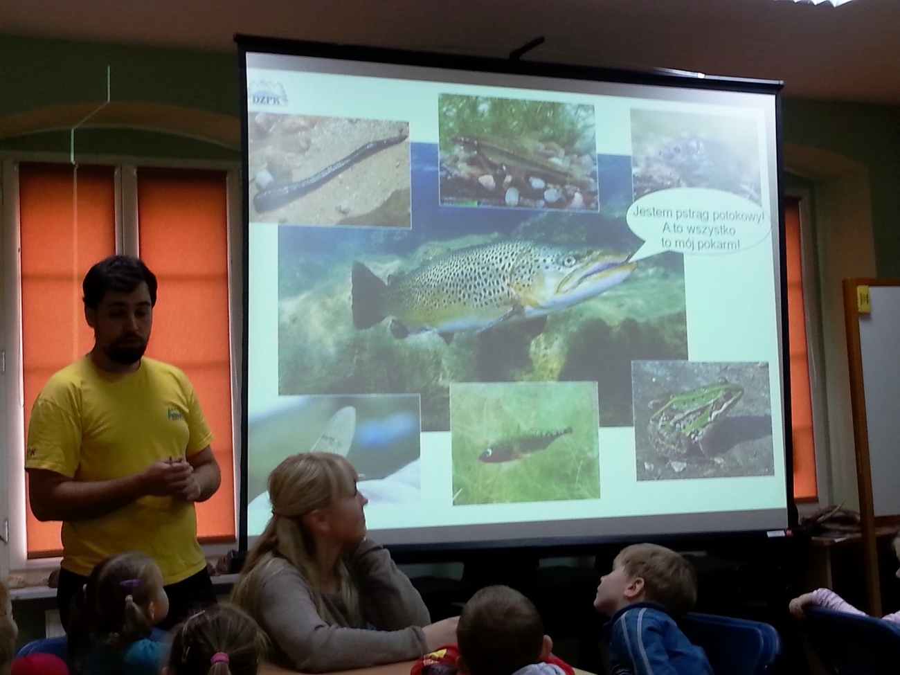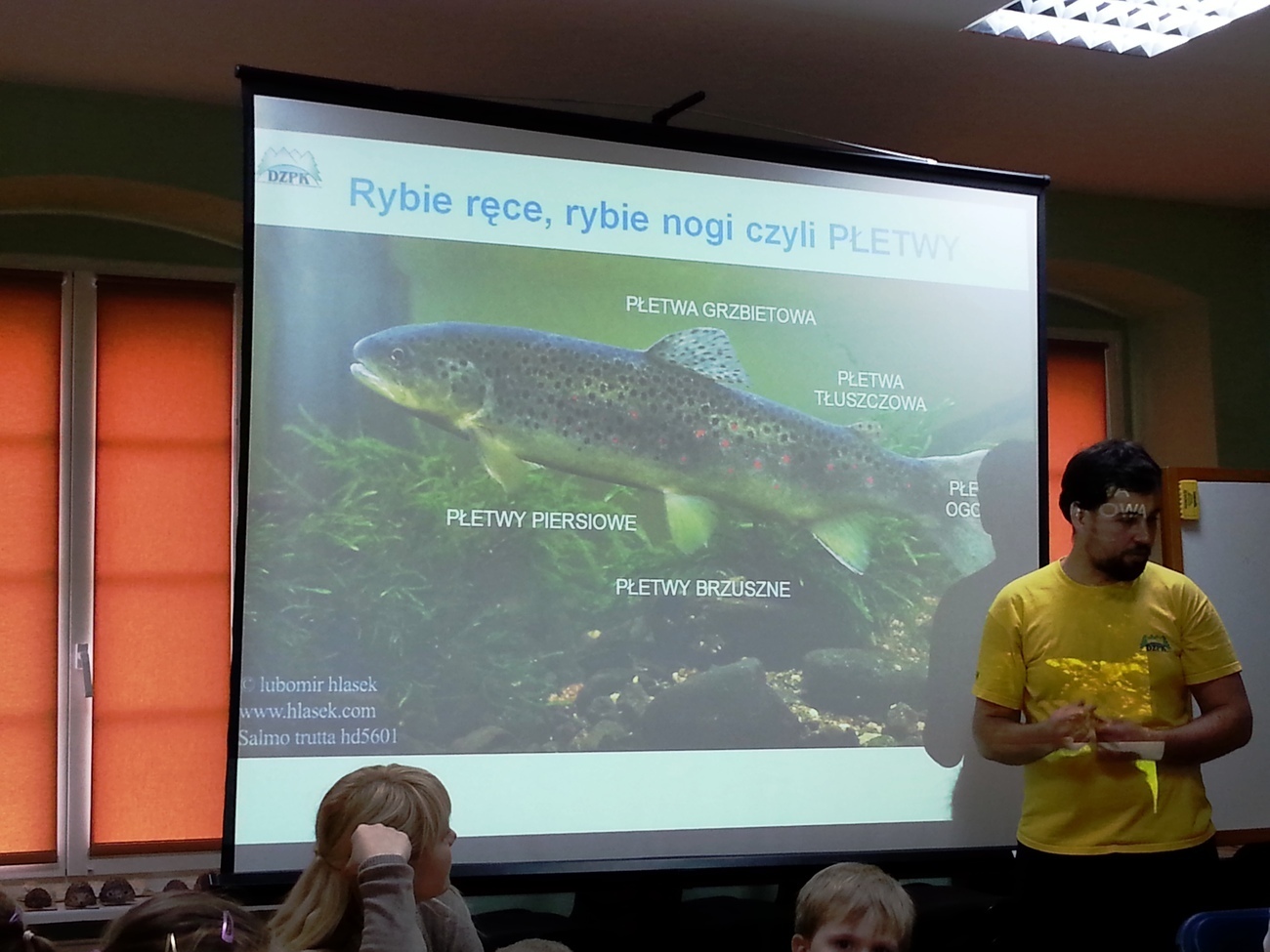 Dnia 14.11.2014 r grupa "Żabek" wybrała się do Dolnośląskiego Zespołu Parków Krajobrazowych w Sobieszowie. Najpierw odbyliśmy pierwszą wspólną podróż autobusem miejskim co było nie lada przygodą! Gdy już przybyliśmy na miejsce pan Wiktor - prowadzący zajęcia, zaprosił nas do sali i rozpoczął niezwykłą opowieść o rybkach, które żyją w polskich rzekach, jeziorach i morzu.