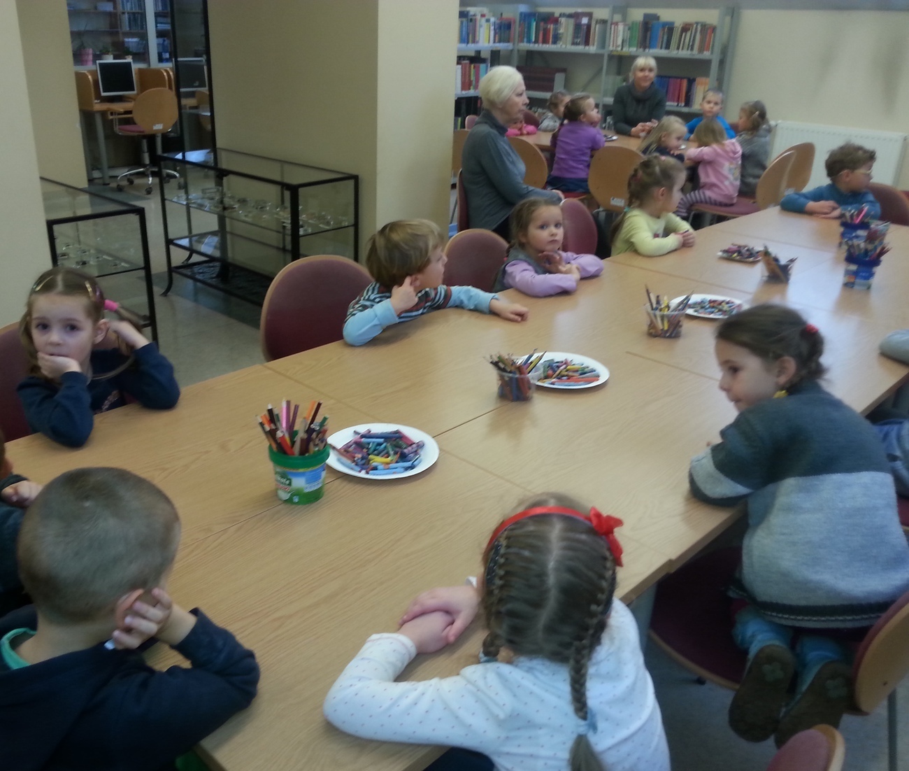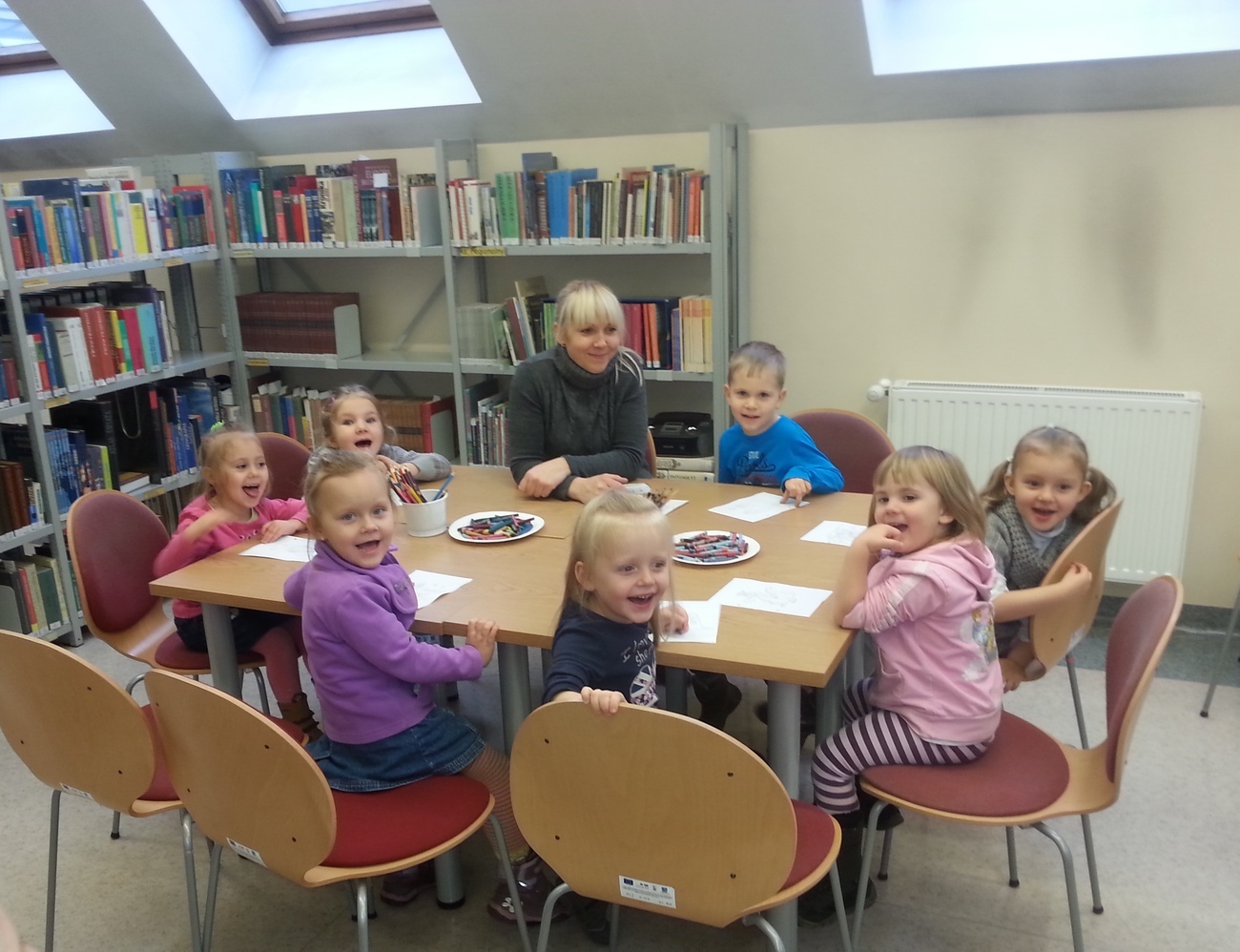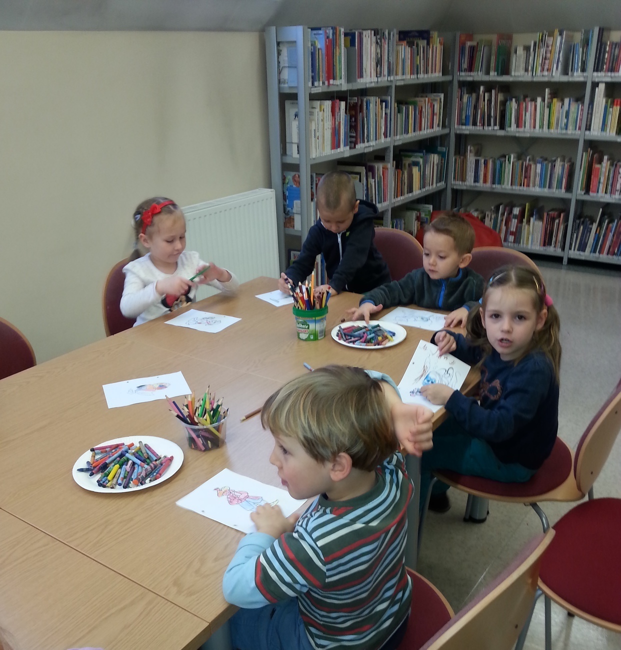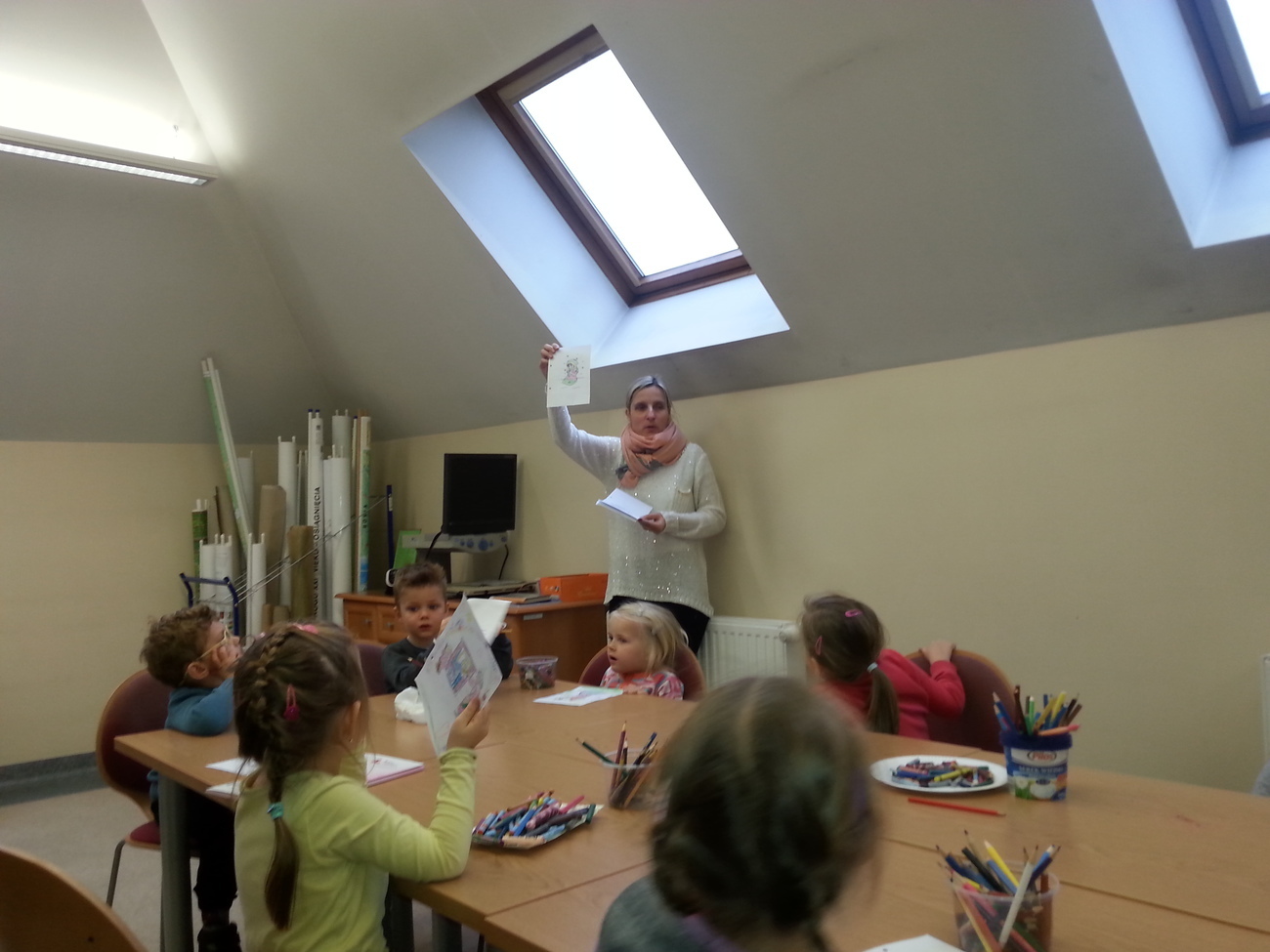 Udaliśmy się na nią do Książnicy Karkonoskiej, gdzie już nas oczekiwano. Jak zwykle specjalnie przygotowano dla nas część biblioteki dziecięco - młodzieżowej. Dzieci zapoznały się z budową książki oraz z osobami, które są odpowiedzialne za jej stworzenie. Przedszkolaki miały również niepowtarzalną możliwość samodzielnego stworzenia książeczki. W poniższej galerii prezentujemy zdjęcia z naszej wizyty oraz naszą grupową książeczkę.