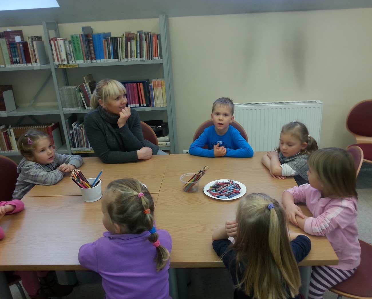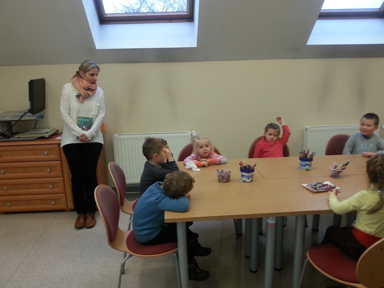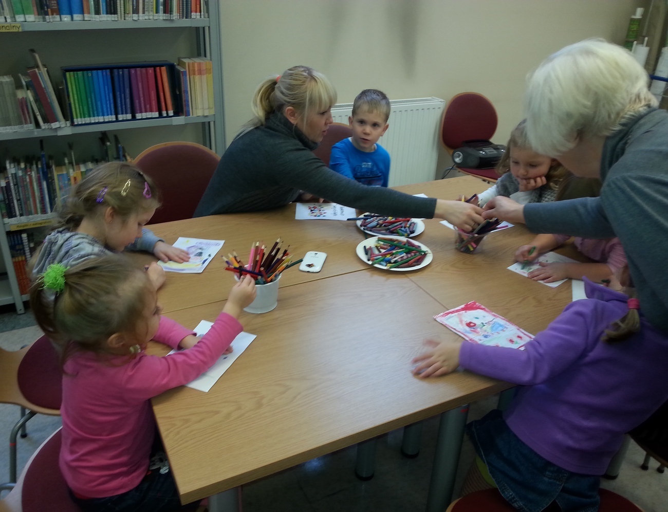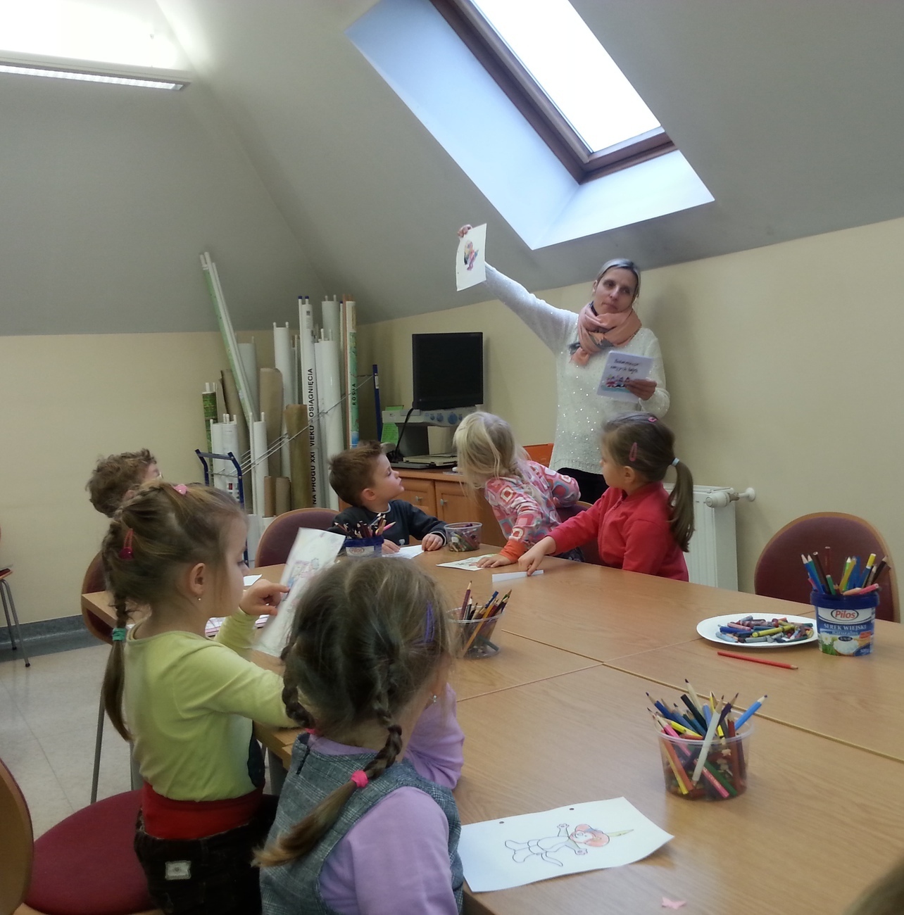 Udaliśmy się na nią do Książnicy Karkonoskiej, gdzie już nas oczekiwano. Jak zwykle specjalnie przygotowano dla nas część biblioteki dziecięco - młodzieżowej. Dzieci zapoznały się z budową książki oraz z osobami, które są odpowiedzialne za jej stworzenie. Przedszkolaki miały również niepowtarzalną możliwość samodzielnego stworzenia książeczki. W poniższej galerii prezentujemy zdjęcia z naszej wizyty oraz naszą grupową książeczkę.