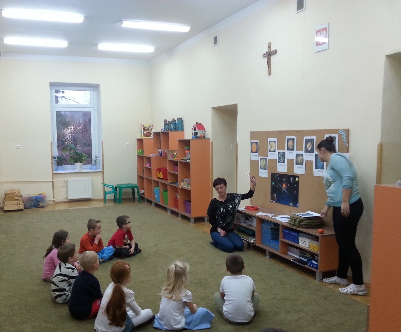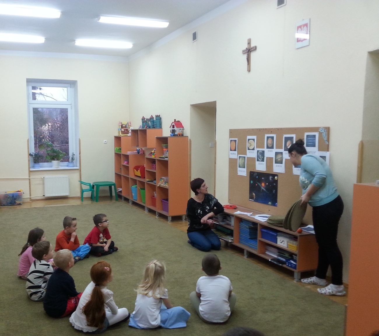 Dzieci poznały nazwy planet naszego układu słonecznego, dowiedziały się, że Ziemia krąży wokół Słońca, które jest gwiazdą. Wspólnie przeprowadziliśmy eksperyment przy użyciu balonika, który pokazał dzieciom jak to się dzieje, że mamy noc i dzień. Przedszkolaki poznały też kształt naszej galaktyki, który wspólnie odtworzyliśmy na kartonie przy pomocy kleju i brokatu.