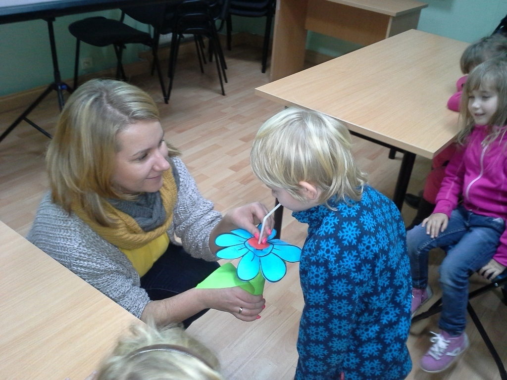 Pani prowadząca zajęcia opowiedziała nam jak zbudowany jest motyl, w jaki sposób się odżywia oraz co je. Ta informacja bardzo podobała się dzieciom, bo okazało się, że motylki mają specjalną rurkę, którą piją nektar.