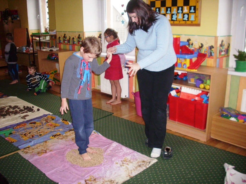 W dniu 09.02.2012 w grupie V odbyły się bardzo ciekawe zajęcia prowadzone przez panią Henię, psychologa z naszego przedszkola. Głównym celem zajęć, oprócz sprawieniu dzieciom przyjemności i radości, było pobudzenie wszystkich układów sensorycznych dziecka. Ścieżka zmysłów- bo tak nazywa się tego rodzaju aktywność polega na stworzeniu dróżki z różnych materiałów takich jak np.: kora, siano, drobna kasza czy ziarno i poprowadzeniu bosego dziecka przez kolejne etapy ścieżki. Dziecko nie tylko poznaje świat poprzez stymulację zmysłów stóp ale także poprzez zapach czy smak, bo każdą z tych rzeczy może dotknąć , powąchać czy nawet spróbować. Ścieżka stworzona w naszej grupie składała się z siedmiu pól. Początek drogi zaczynał się od pola z sianem, następnie była kora drzew, gruby sznur, ziarno, koc, w którym dzieci były bujane przez panią Monikę i panią psycholog, na końcowym etapie ścieżki rozsypana sól i ziarno kukurydzy.