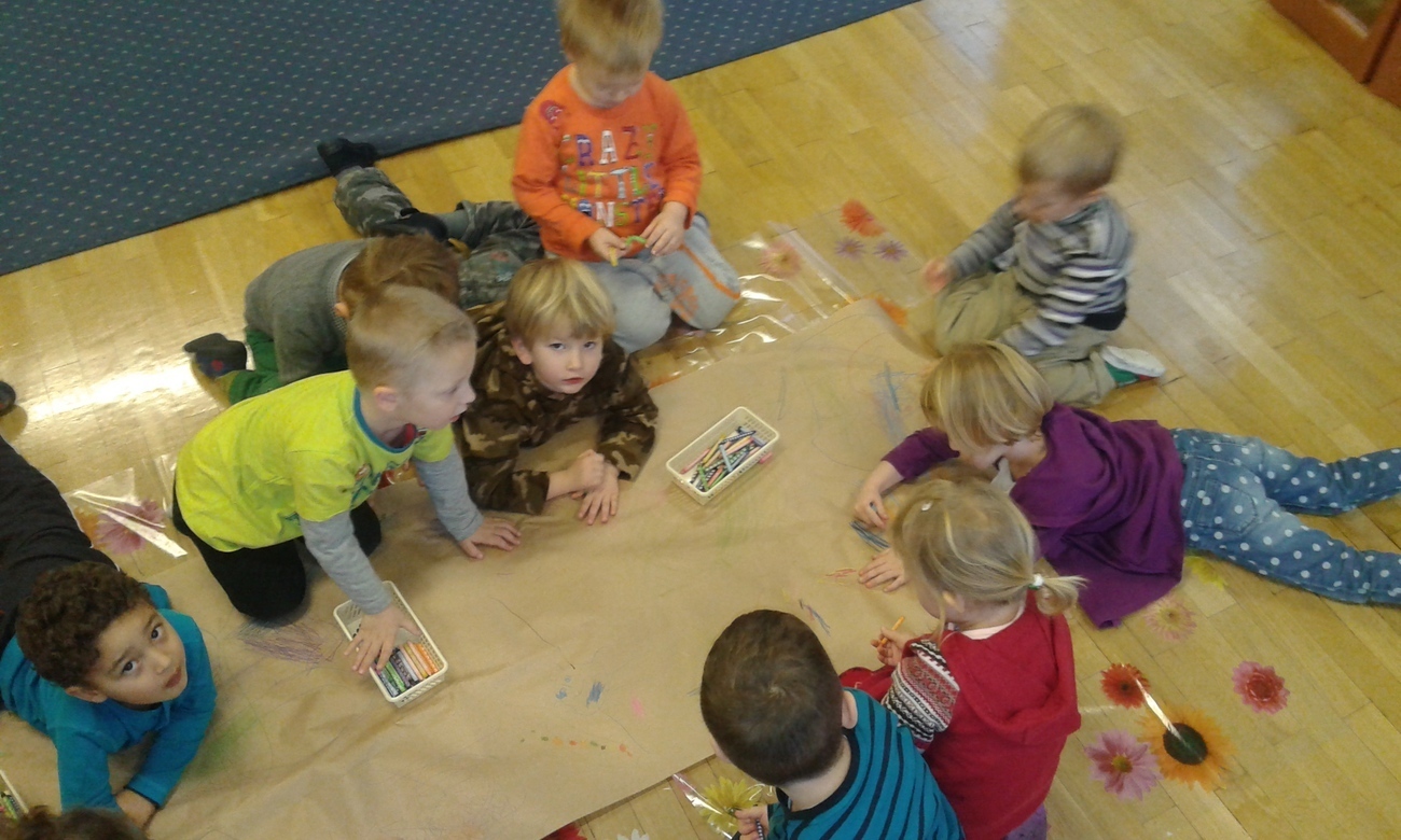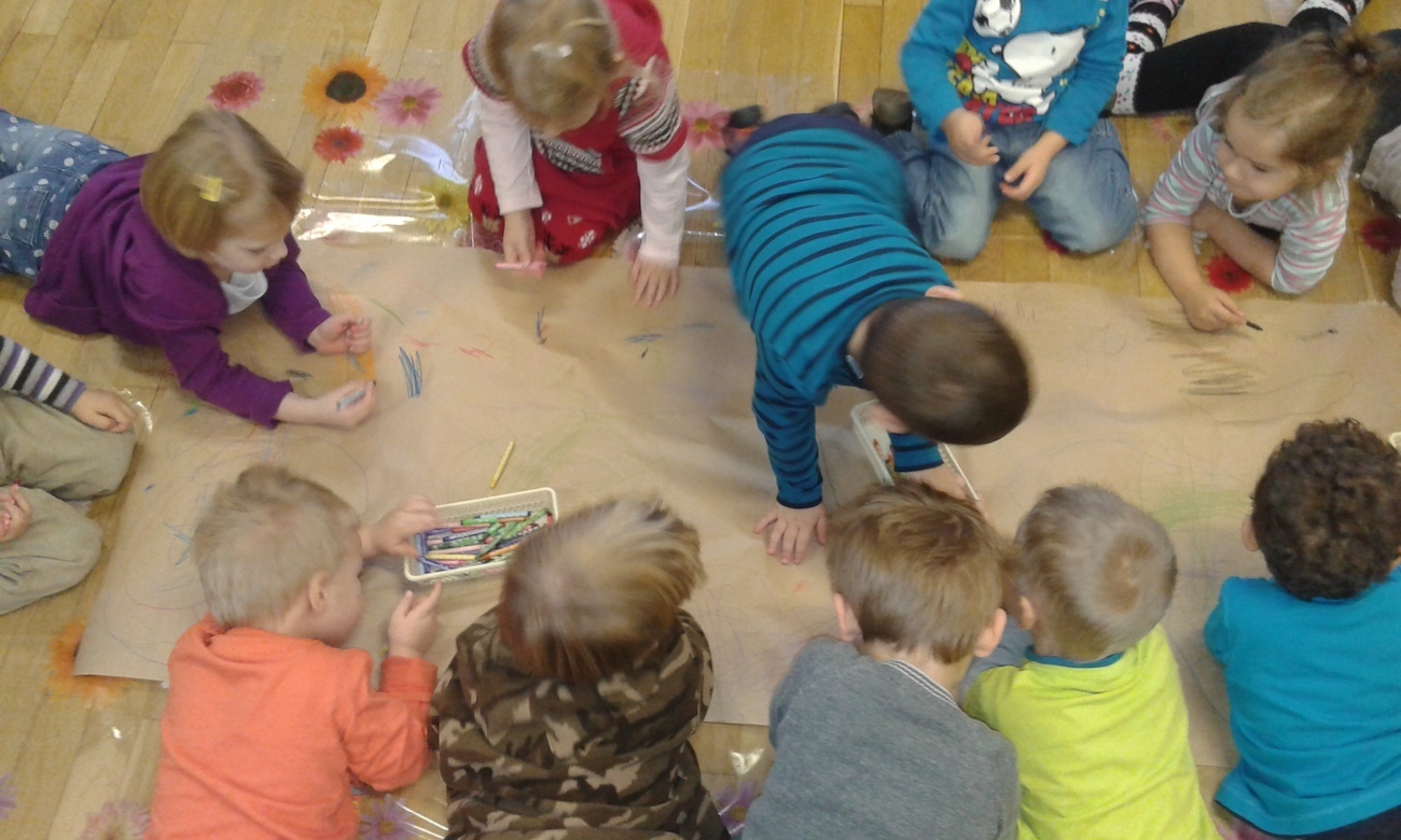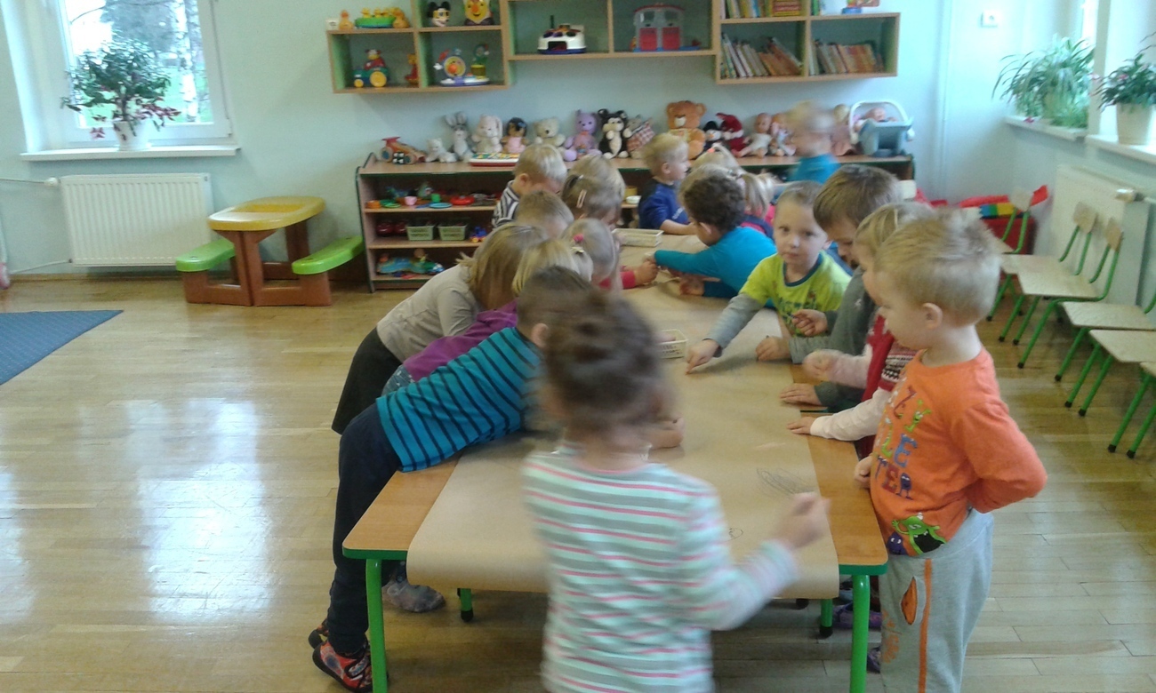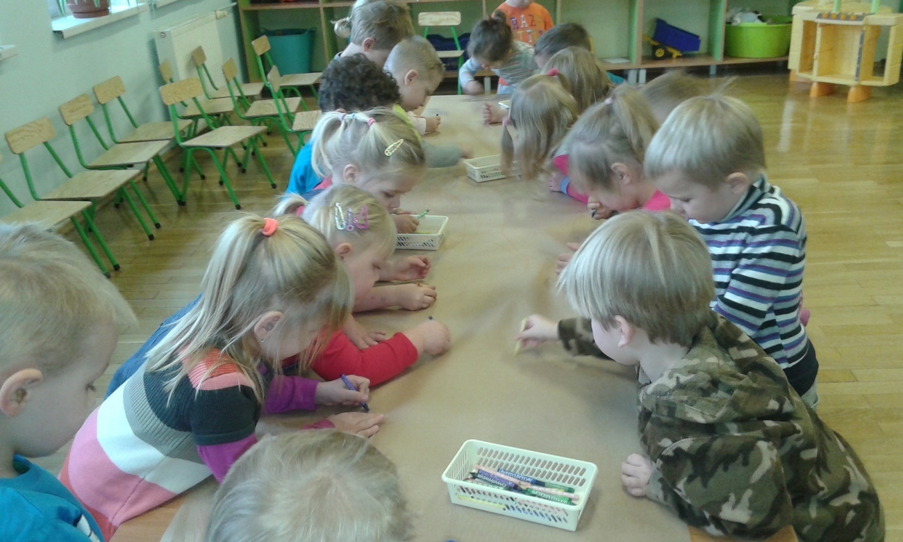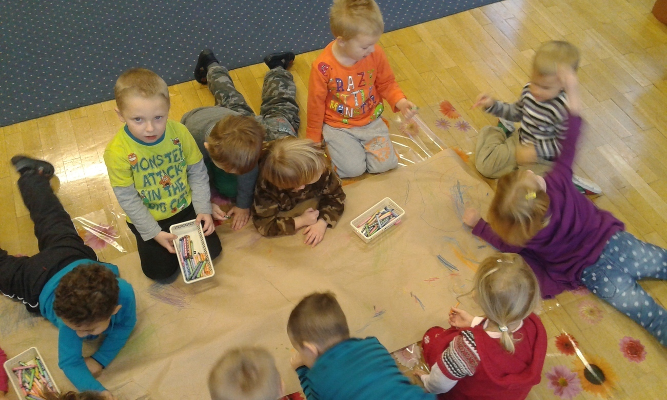 Przedszkolne Tygryski bardzo nudzą rzeczy, które powtarzają się wiele razy, wiec postanowiły to natychmiast zmienić. Przedszkolaki uwielbiają rysować kredkami, ale tym razem rysowaliśmy leżąc na podłodze, albo stojąc przy stolikach. Zmieniliśmy też formę ponieważ, nie każdy dostał swoją kartkę, a rysowaliśmy na jednej wspólnej.