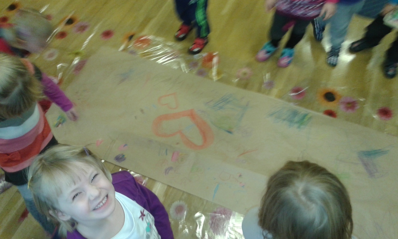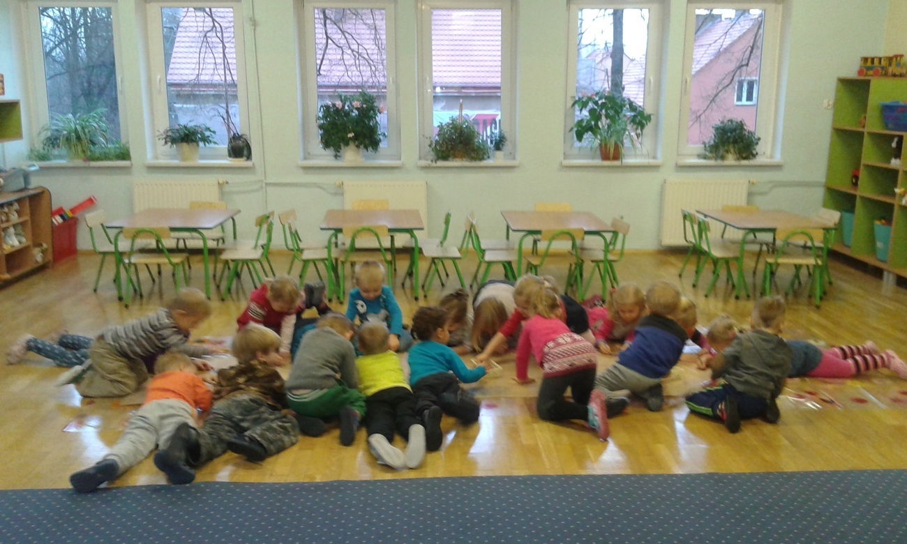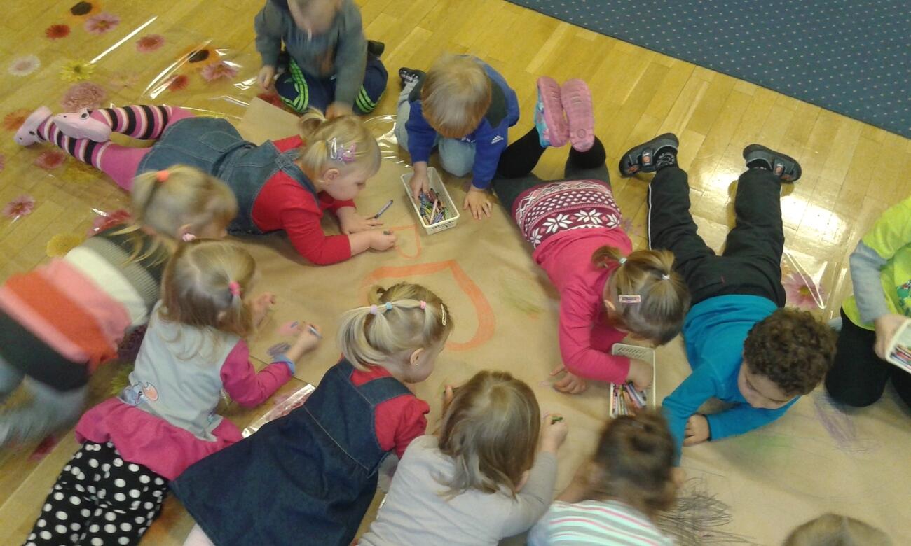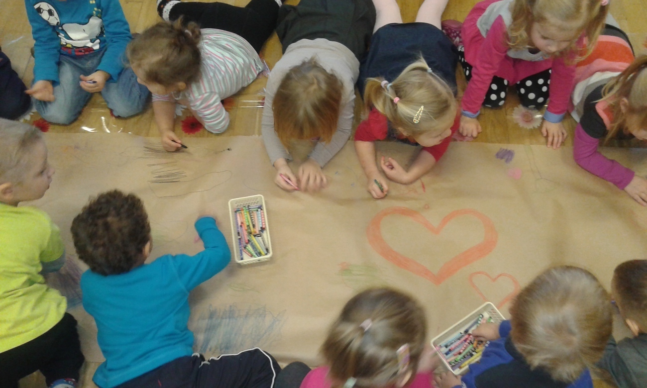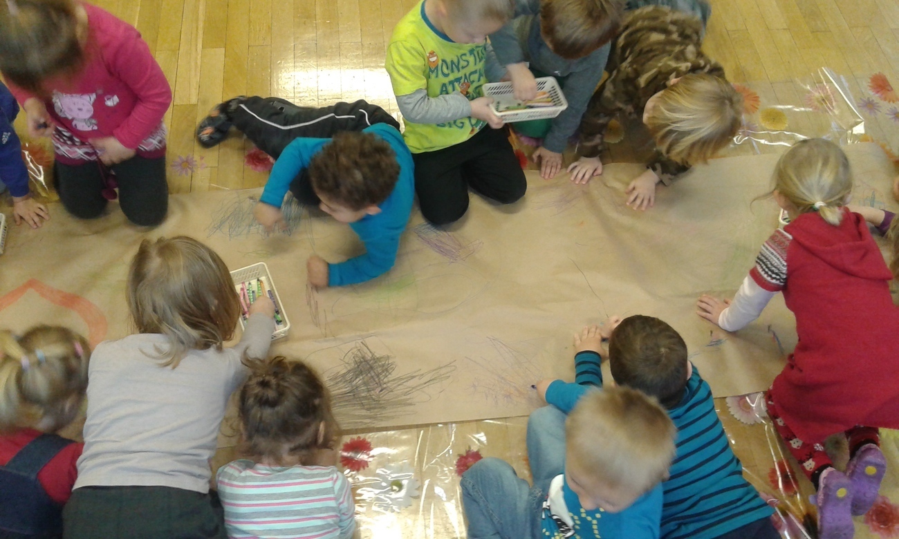Przedszkolne Tygryski bardzo nudzą rzeczy, które powtarzają się wiele razy, wiec postanowiły to natychmiast zmienić. Przedszkolaki uwielbiają rysować kredkami, ale tym razem rysowaliśmy leżąc na podłodze, albo stojąc przy stolikach. Zmieniliśmy też formę ponieważ, nie każdy dostał swoją kartkę, a rysowaliśmy na jednej wspólnej.