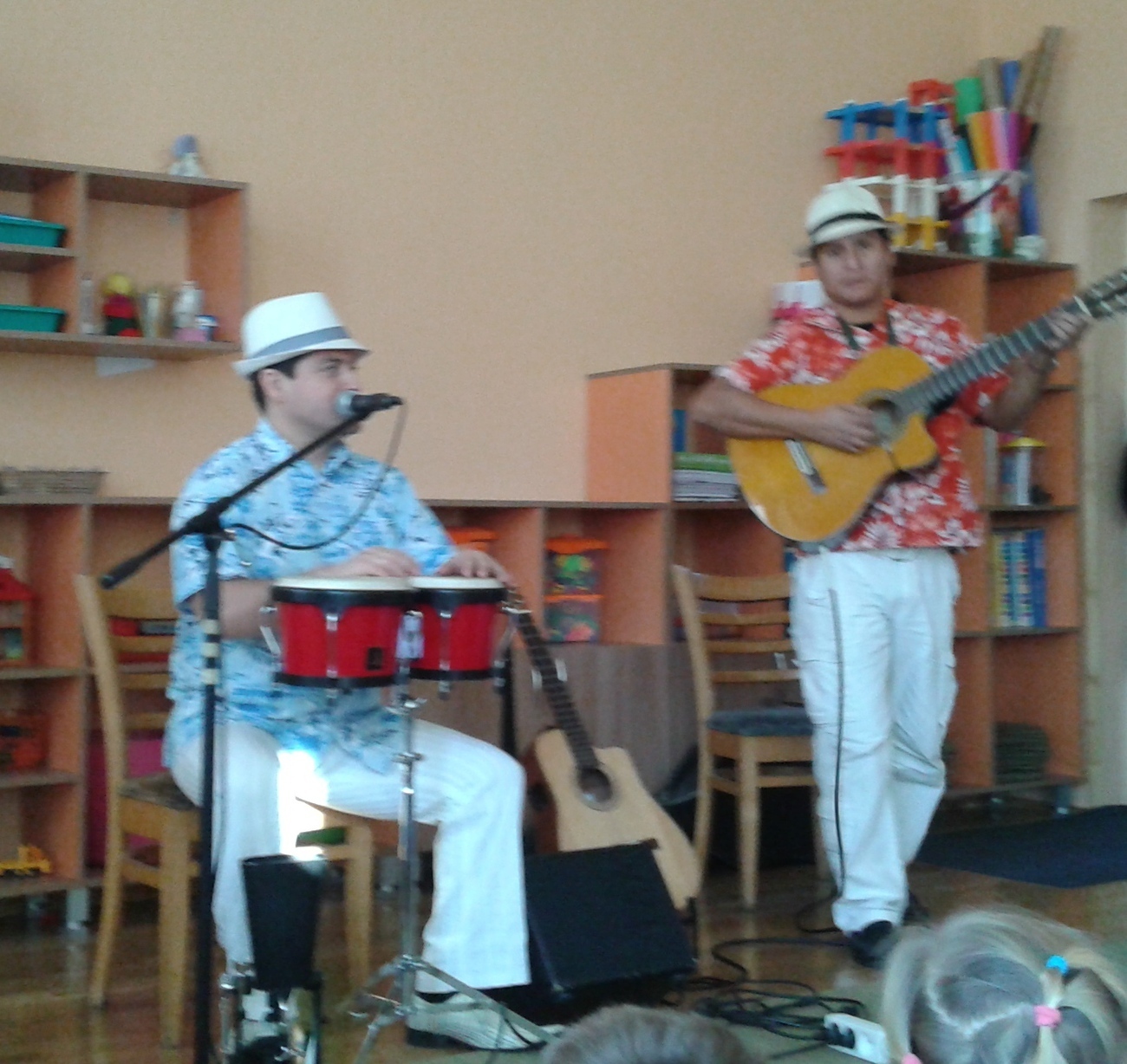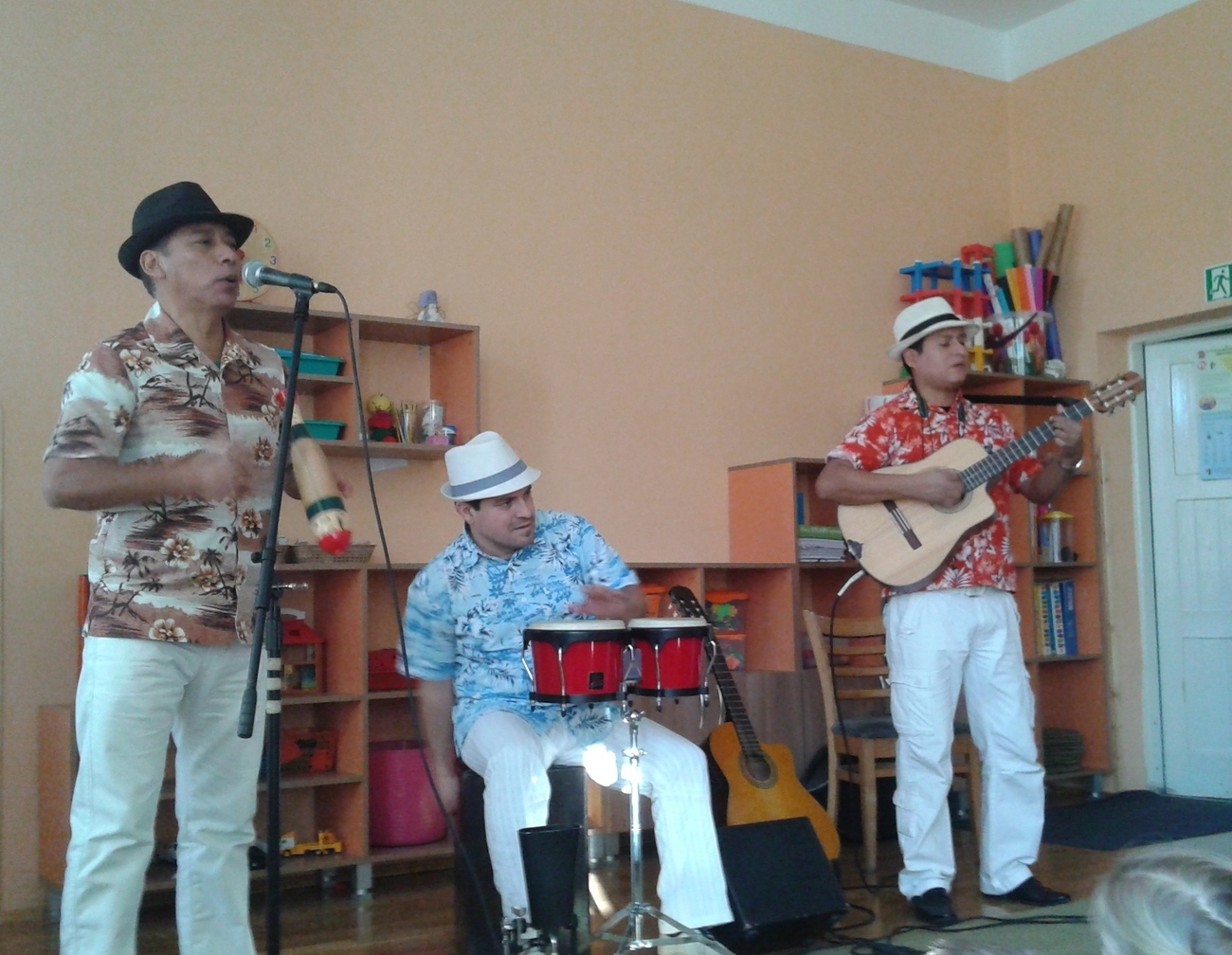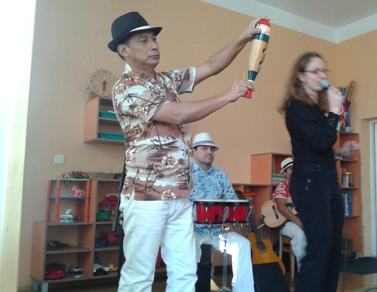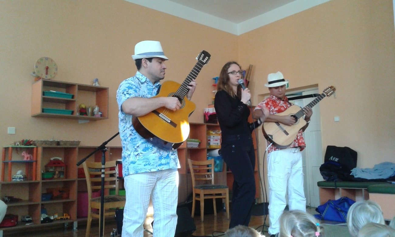 Dziś w naszym przedszkolu zagościli egzotyczni goście prosto zza oceanu pan Rolando Escalante, Alfaro Alvarado oraz Victor Martinez . Przybyli muzycy przybliżyli nam w ten zimowy dzień muzykę prosto z Kuby i Brazylii. Wszyscy bardzo chętnie ruszyliśmy do tańca, do którego zaprosiła nas muzyka. Każdy słuchał jak zaczarowany, a nogi i ręce same ciągnęły nas do tańca. Wspólnie bawiliśmy się przy Macarenie, Lambadzie i wielu innych utworach porywających do zabawy. Dzieci zaskakiwały muzyków znajomością słów do piosenki Nosa nosa Asi voce Me mata. Poznając kulturę latynoską dowiedzieliśmy się co nieco o instrumentach przywiezionych z bardzo daleka takich jak cajon. Nauczyliśmy się również rozróżniać tres od gitary akustycznej ale najważniejsze poznaliśmy krok samby – w sam raz na karnawałowe szaleństwo.