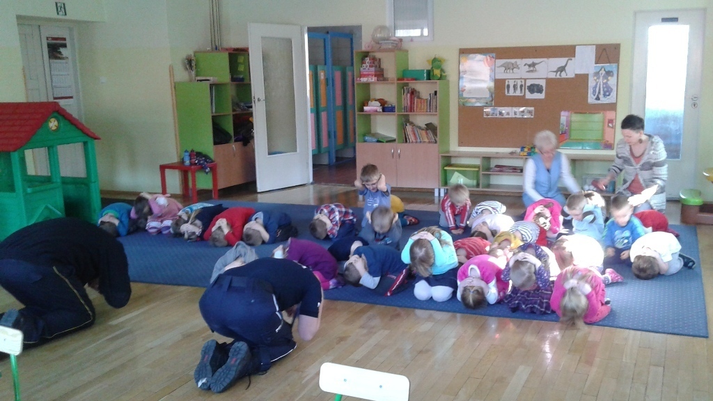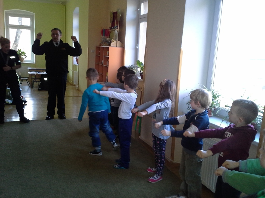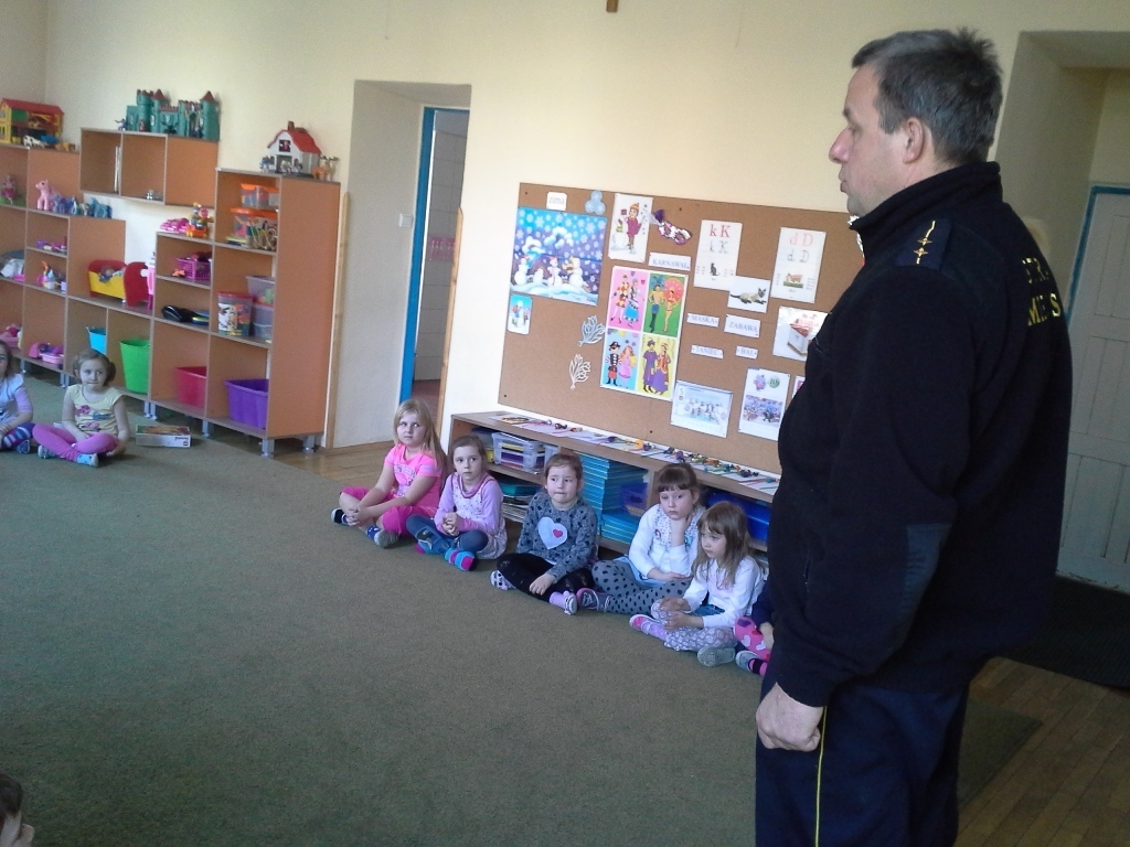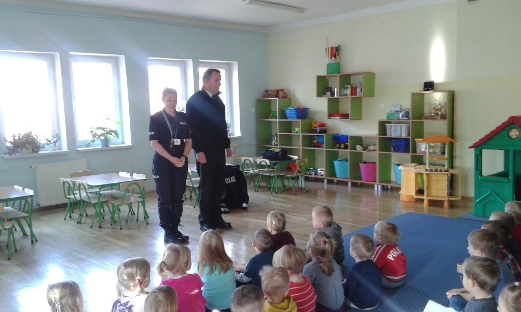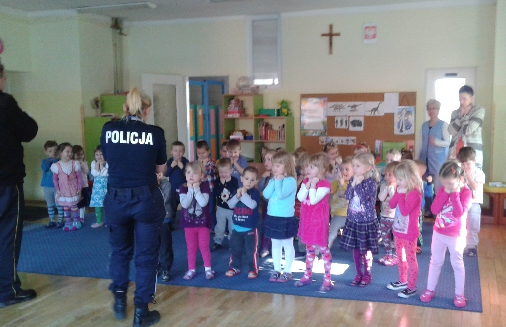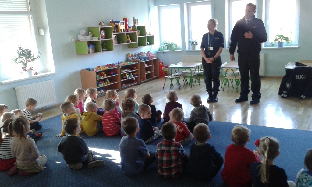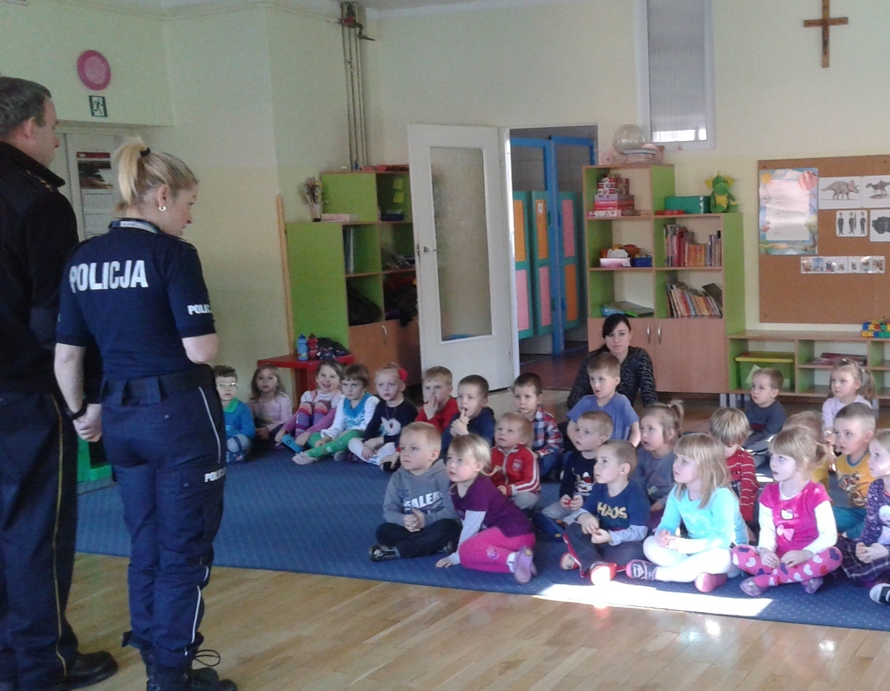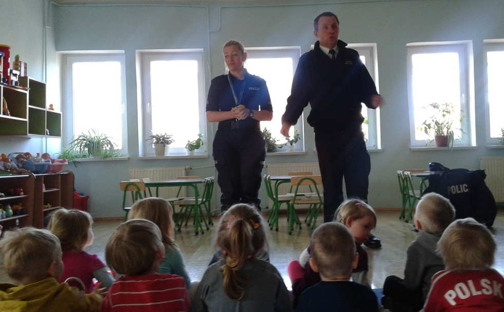 W piątek 20.02.2015 do naszego przedszkola przyjechali goście: pani policjantka i pan ze Straży Miejskiej. Opowiadali nam o tym jak dzieci powinny się zachowywać, żeby były bezpieczne podczas spacerów i na placu zabaw. Dowiedzieliśmy się, że nie należy rozmawiać z nieznajomymi ani samemu oddalać się od opiekunów, bo może to się bardzo źle skończyć. Nasi goście pokazali również, jaką pozycję przyjąć gdy zaatakuje nas pies. Na koniec zajęć każde dziecko dostało odblask, by było dobrze widoczne na drodze po zapadnięciu zmroku.Wszystkie rady były bardzo pouczające i słuchaliśmy ich z wielką uwagą.