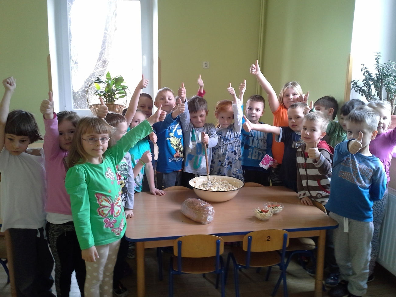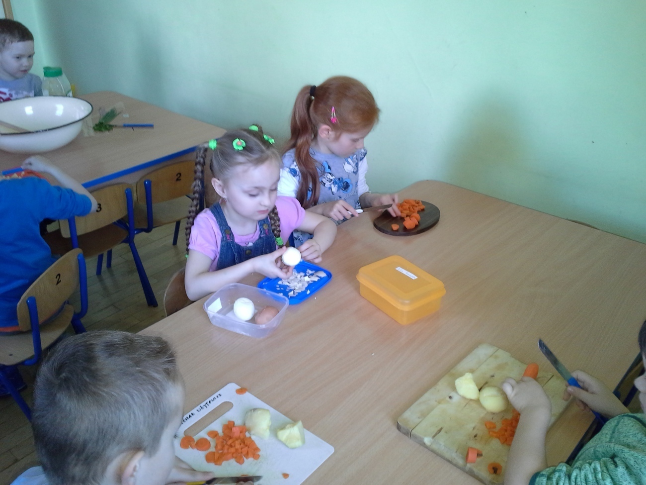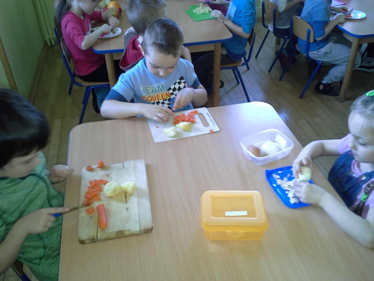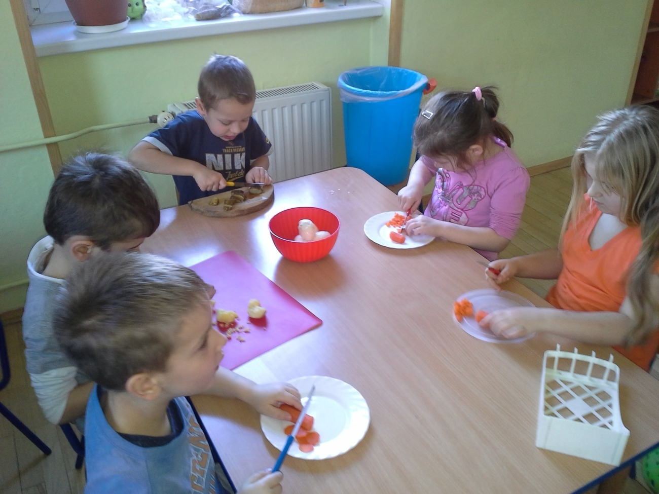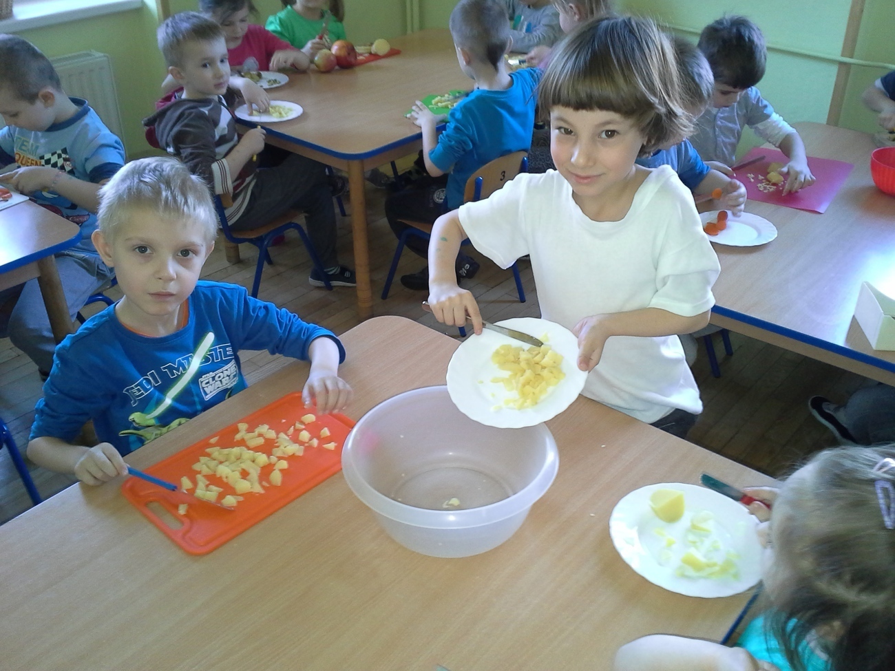 Zabawy przy krojeniu było co nie miara. Wprawdzie nie każdy miał ochotę skosztować sałatki - zapewne z powodu niektórych warzyw - ale wszyscy byli bardzo zaangażowani w przygotowanie i mieszanie wszystkich składników.