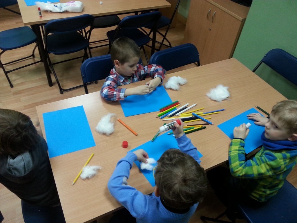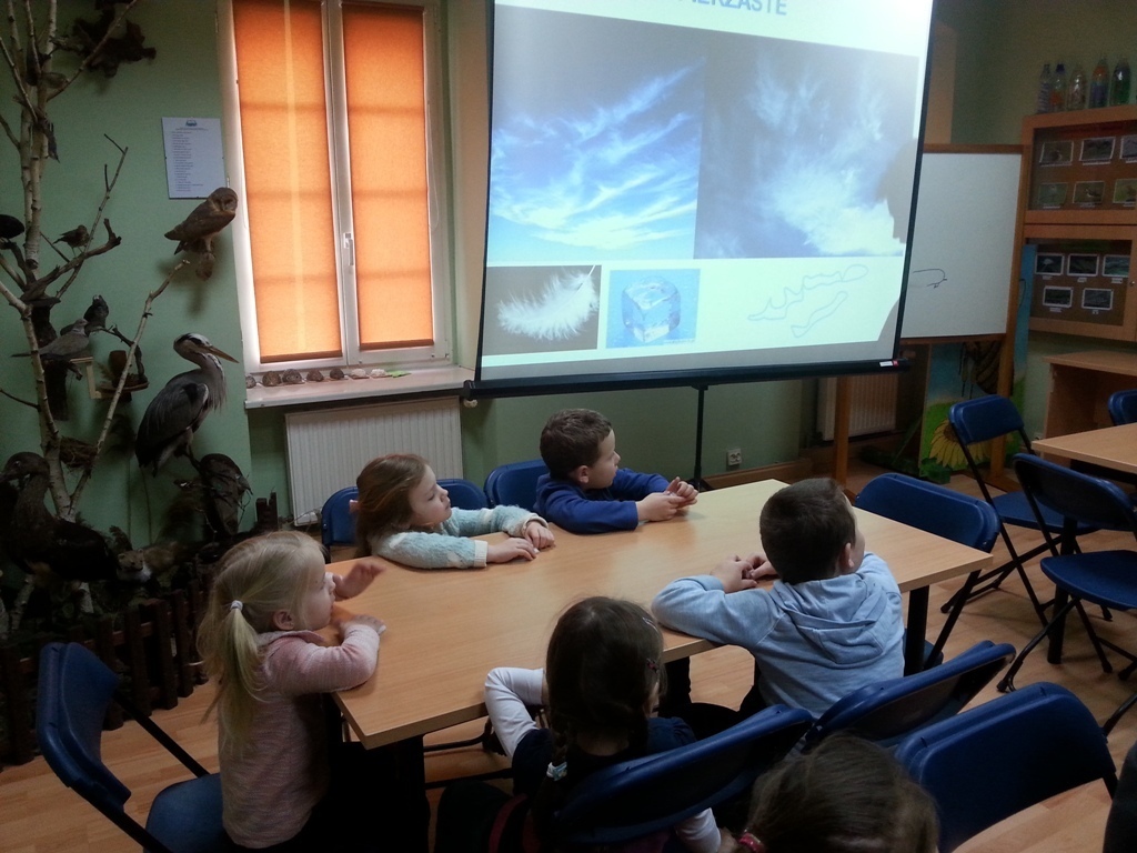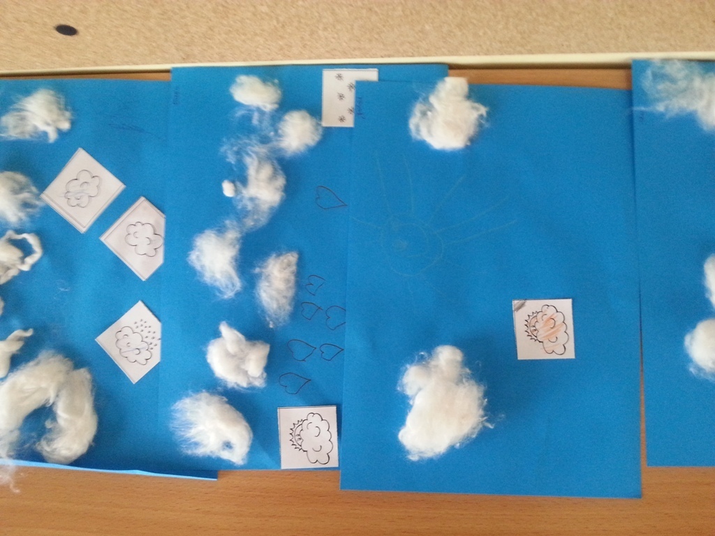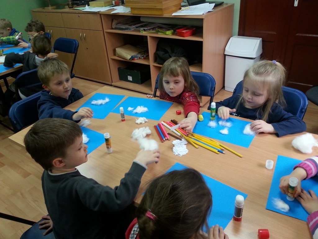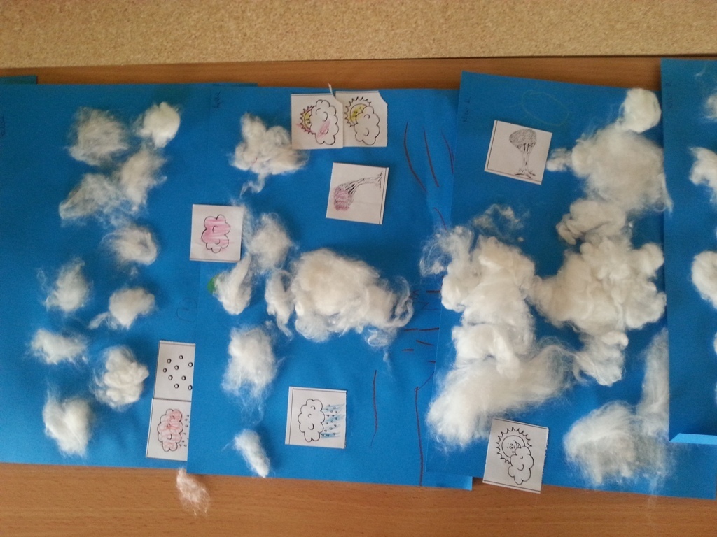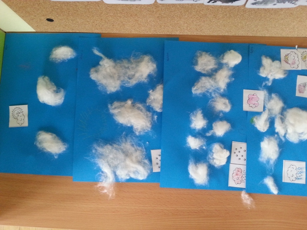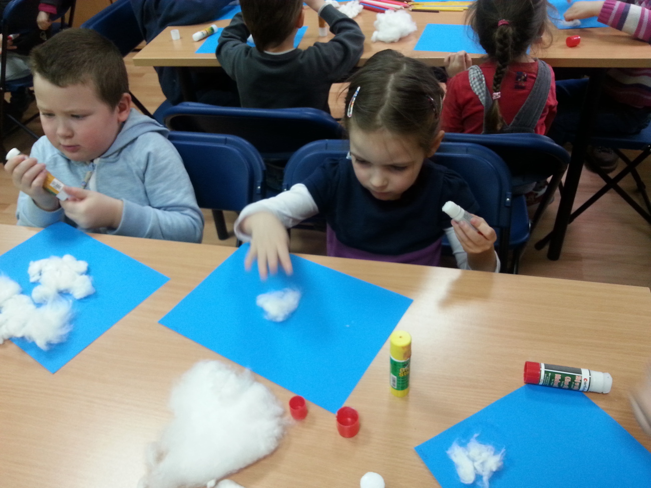 Opowiedział skąd się bierze grad. Przygotował też dla dzieci chmuro-zagadki czyli slajdy chmur, które przedstawiały ich różne kształty np. konia, zająca czy słonia. Nasze przedszkolaki nauczyły się wymawiać trudne nazwy, jak np.: cumulonimbus. Na zakończenie zajęć, każdy wykonał swój „kawałek nieba”.