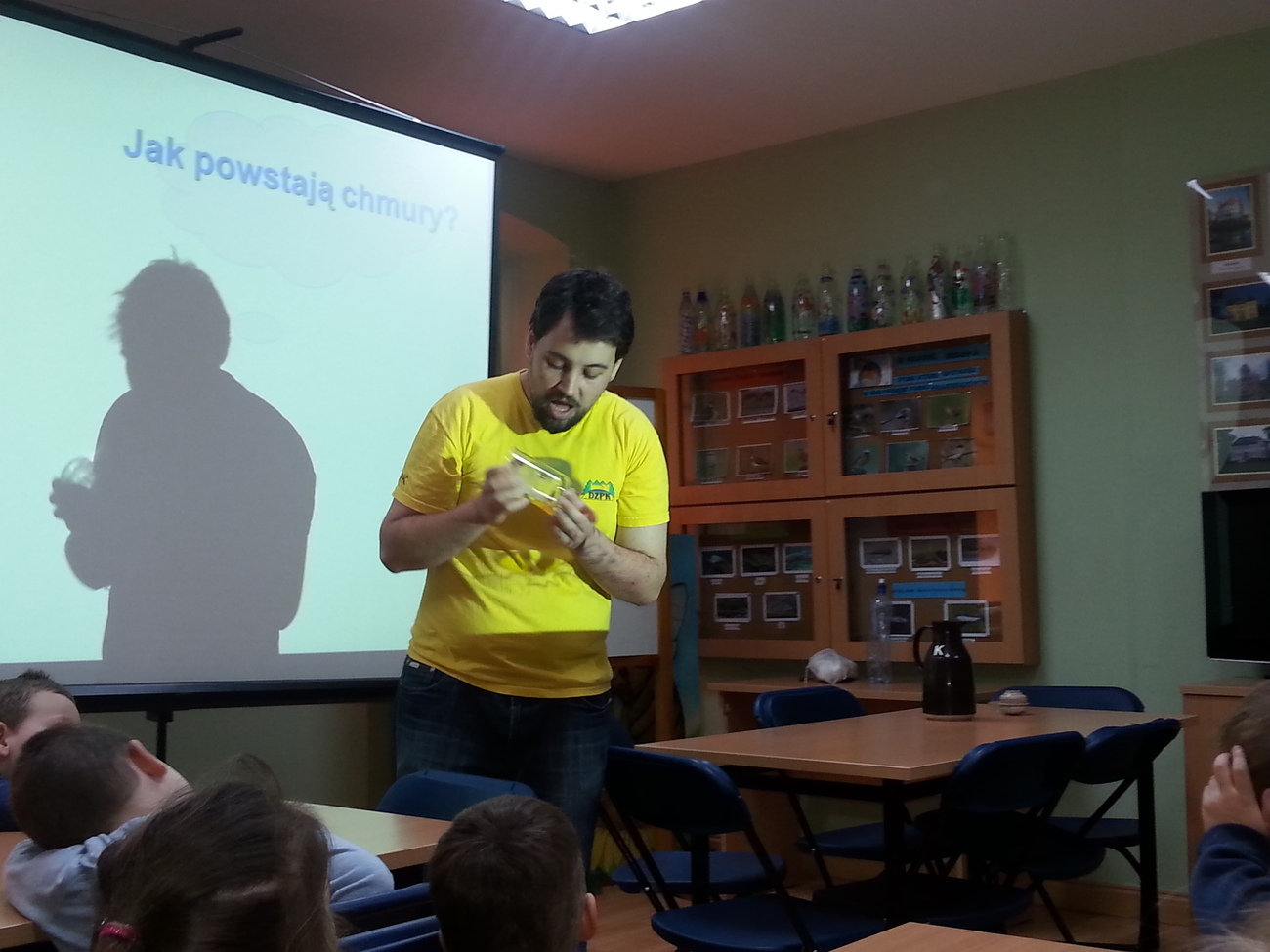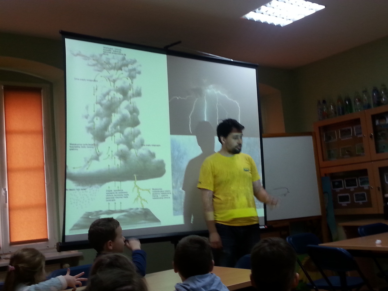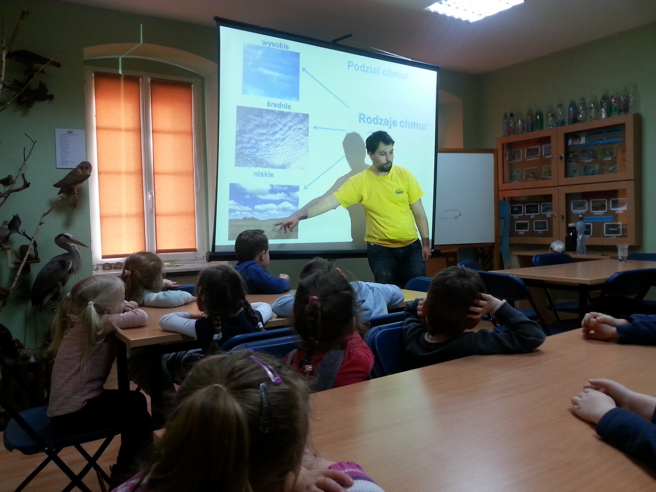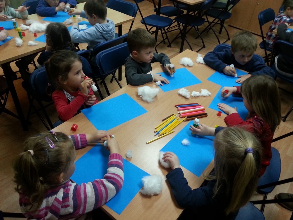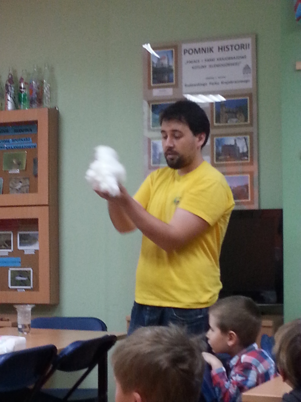Opowiedział skąd się bierze grad. Przygotował też dla dzieci chmuro-zagadki czyli slajdy chmur, które przedstawiały ich różne kształty np. konia, zająca czy słonia. Nasze przedszkolaki nauczyły się wymawiać trudne nazwy, jak np.: cumulonimbus. Na zakończenie zajęć, każdy wykonał swój „kawałek nieba”.
