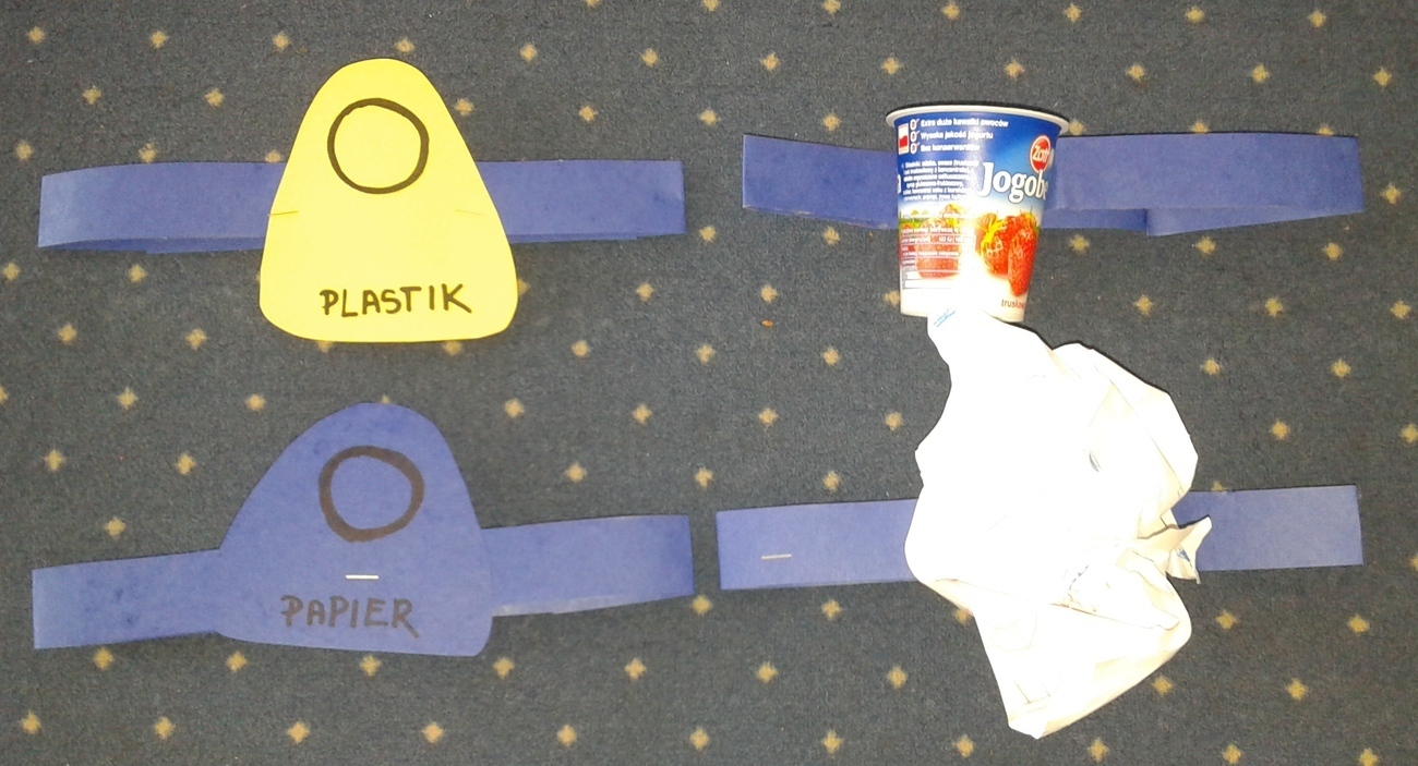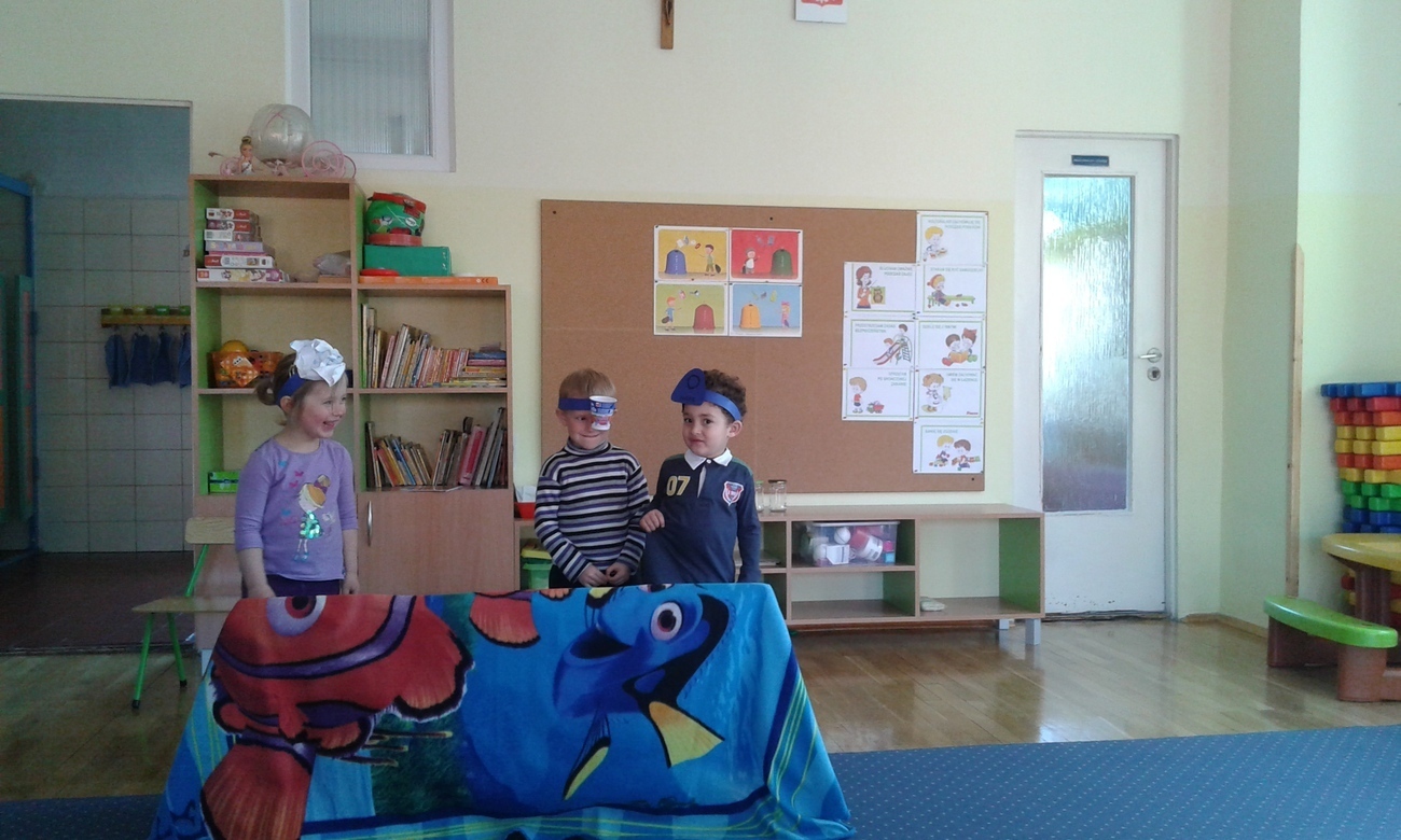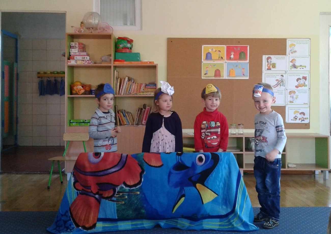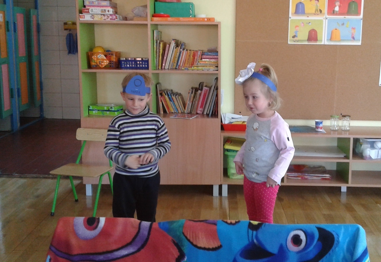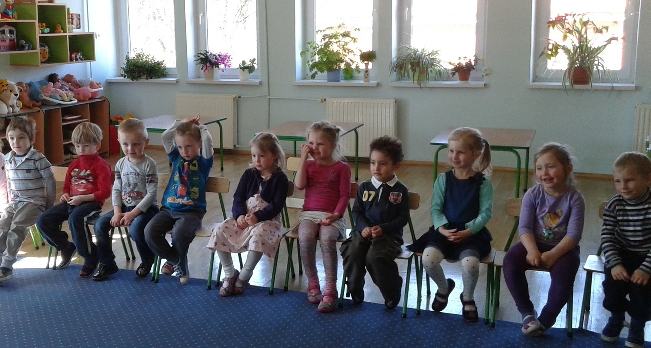 Naszą widownią byli koledzy i koleżanki z grupy, a scena też była, stworzona z krzeseł i koca wg własnych pomysłów. Pomimo tego udało się, stworzyliśmy swój własny spektakl „Śmietnikowe kłopoty”.