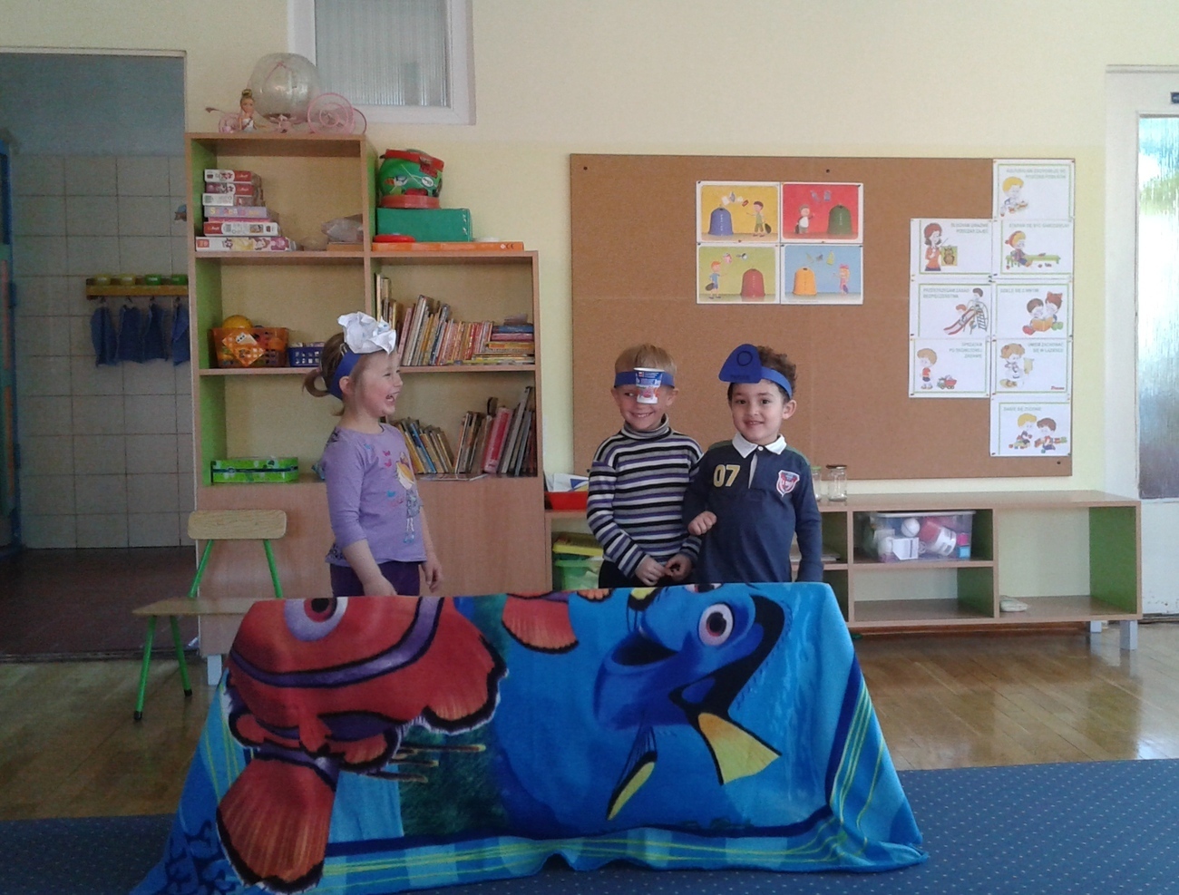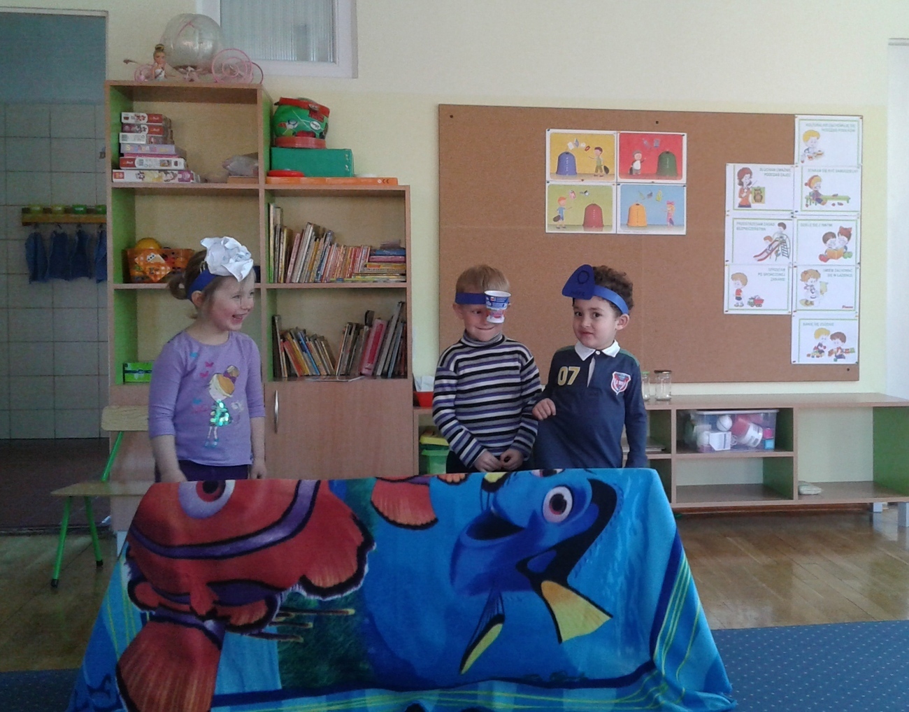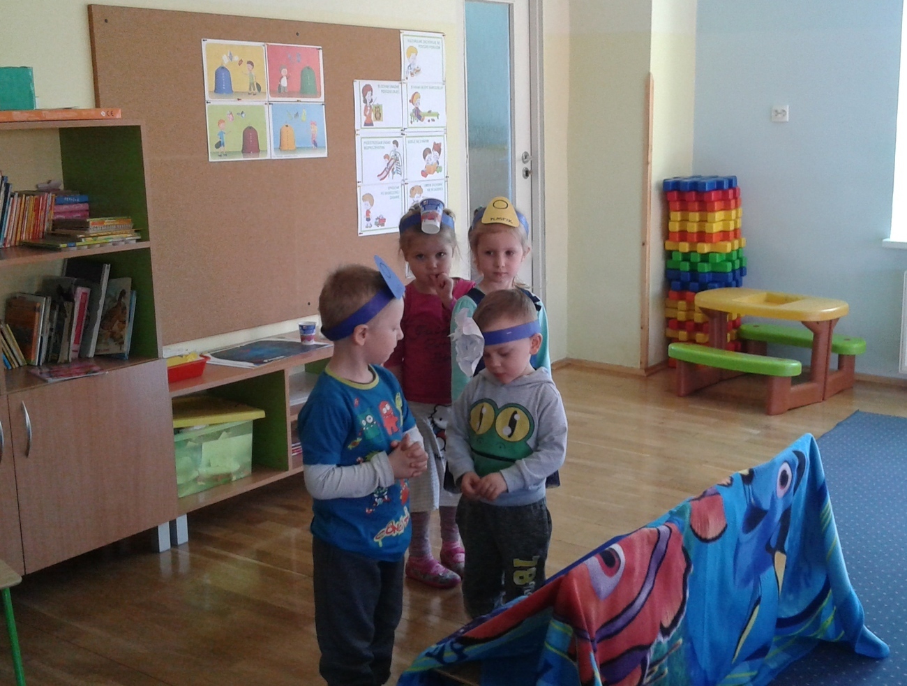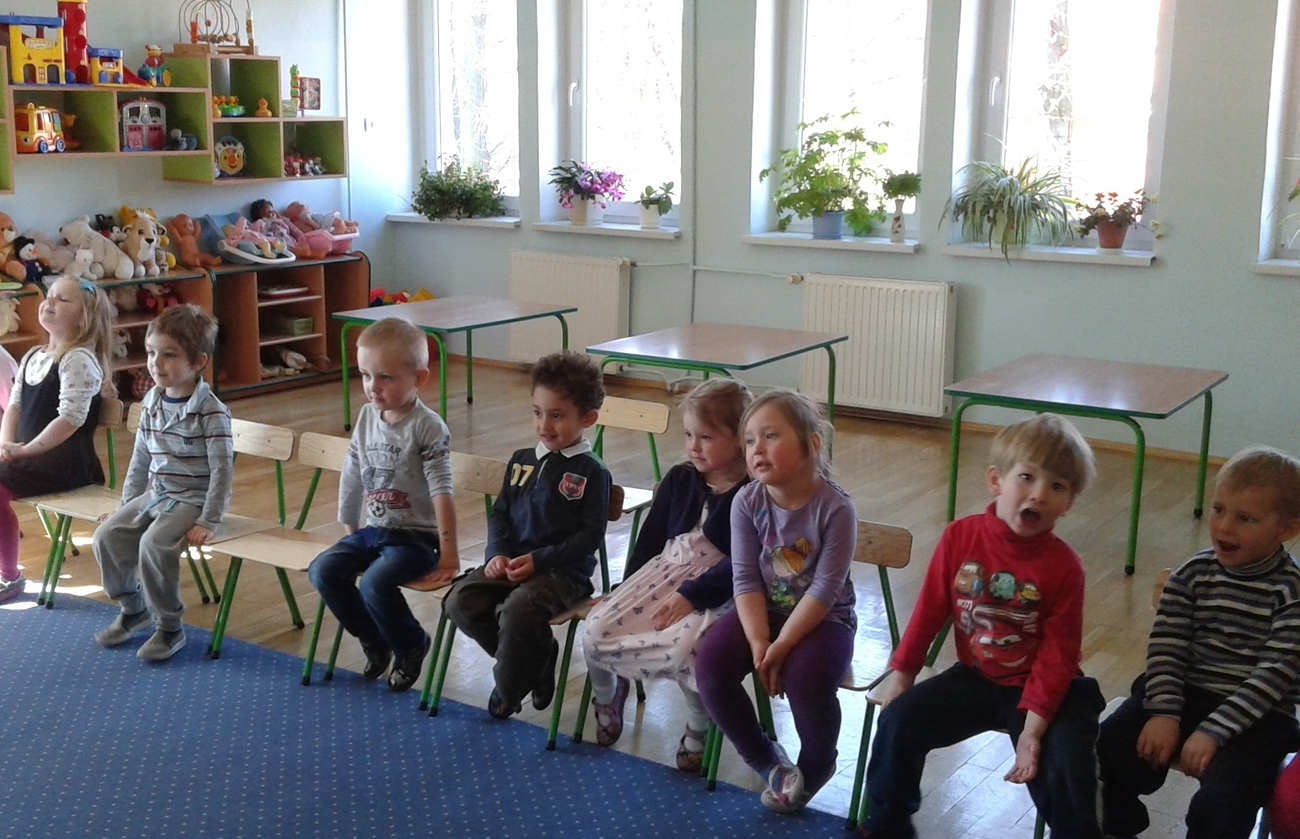 Naszą widownią byli koledzy i koleżanki z grupy, a scena też była, stworzona z krzeseł i koca wg własnych pomysłów. Pomimo tego udało się, stworzyliśmy swój własny spektakl „Śmietnikowe kłopoty”.