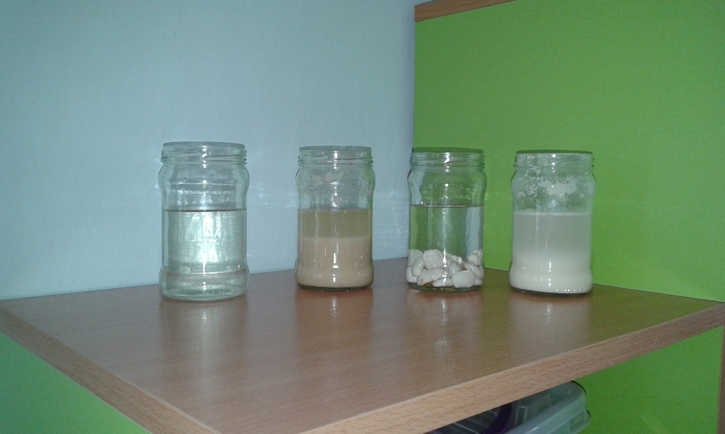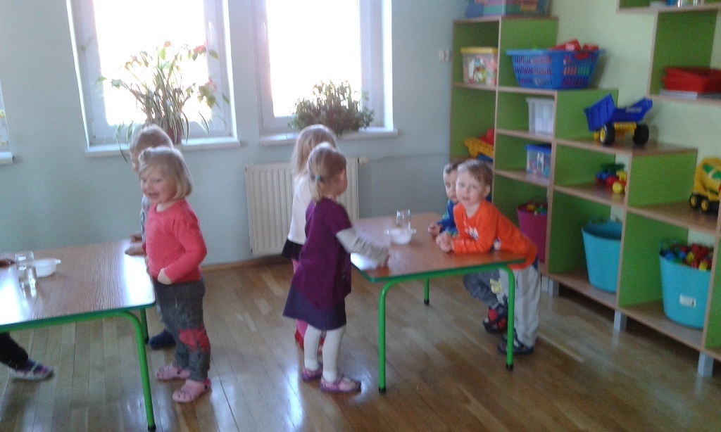 Podzieliliśmy się na drużyny i każda z ich miała wieszać różne substancje z wodą, a były to mąka, bułka tarta, sól, fasola.