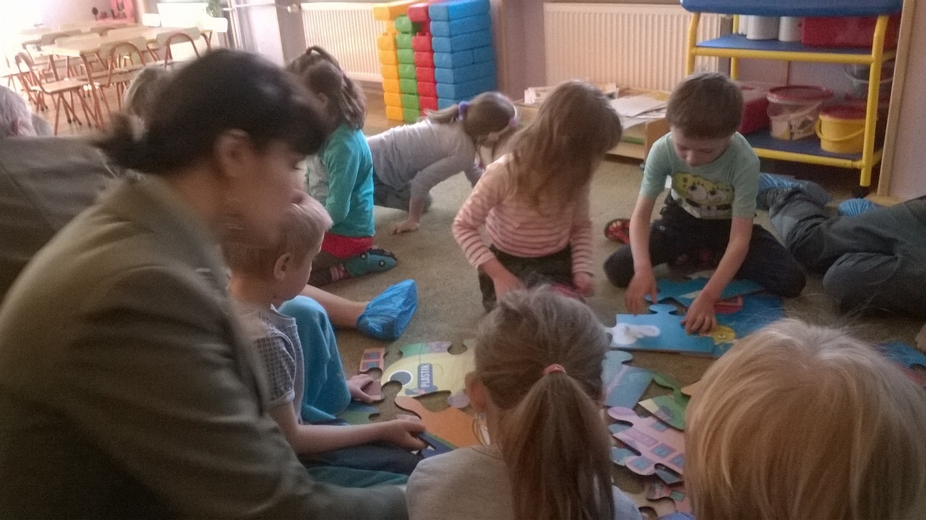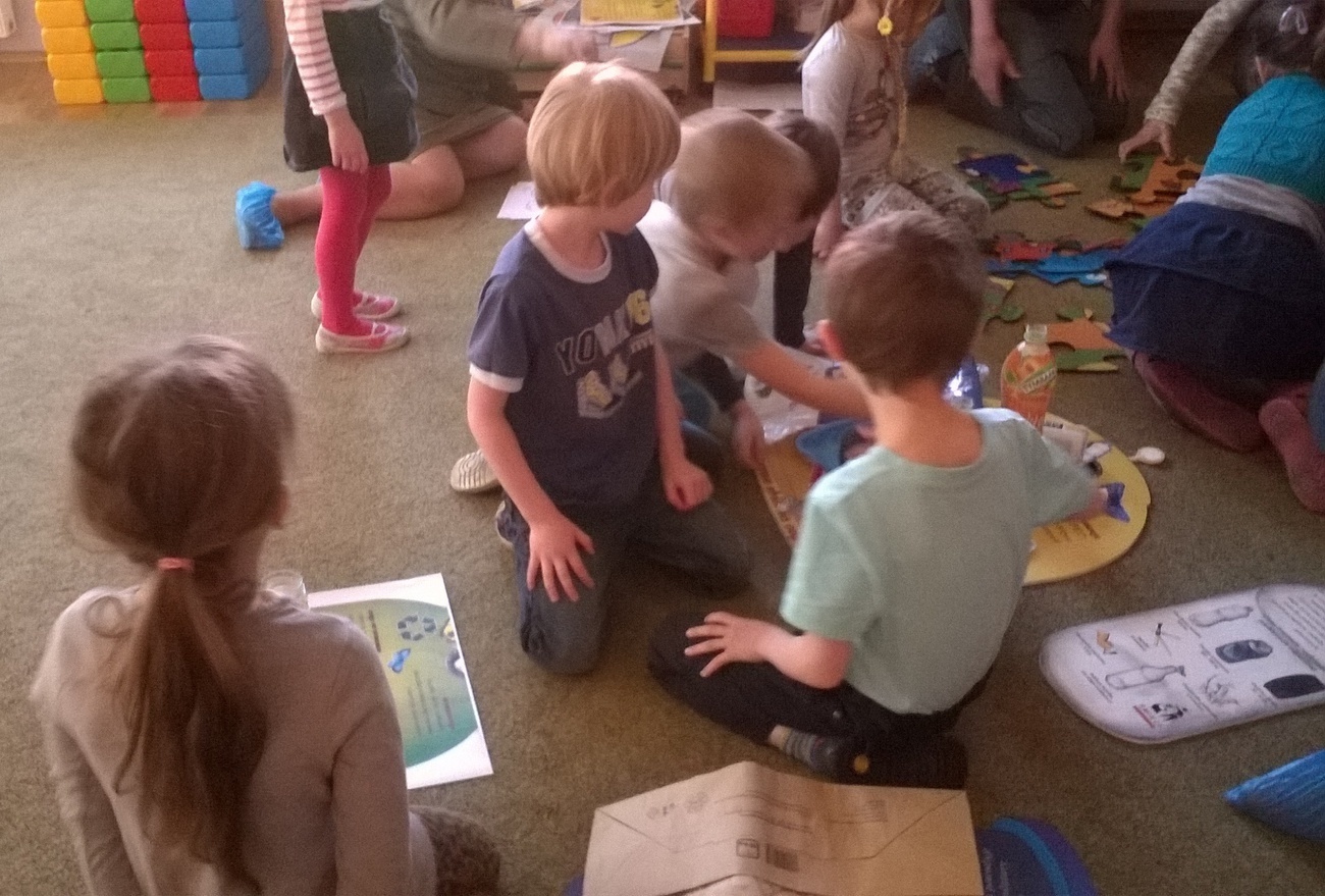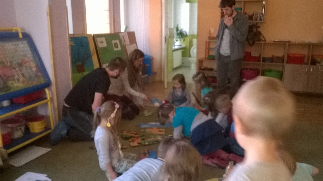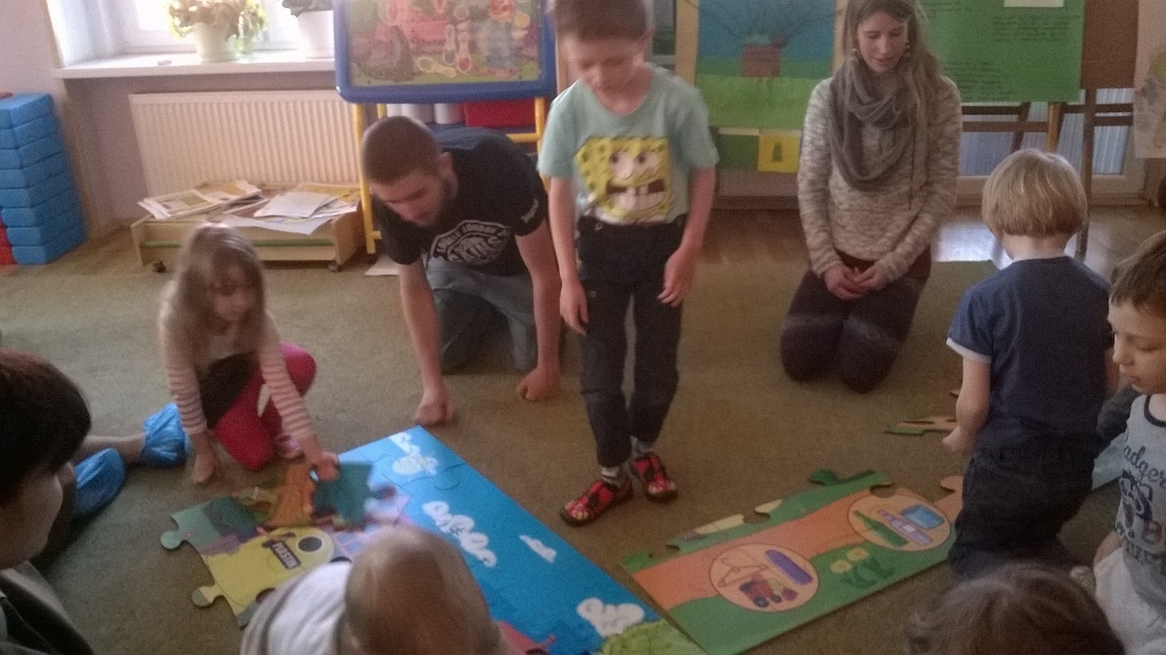 Nasi gości przynieśli ze sobą mnóstwo ciekawych rzeczy tj. ogromne ekologiczne puzzle, wizerunki koszy na śmieci, różne śmieci, ciekawe okazy śmieci w terrariach z ziemią oraz karty do pokolorowania. Wspólnie segregowaliśmy śmieci do odpowiednich pojemników oraz układaliśmy wielkie puzzle przedstawiające kontenery do segregacji śmieci. Bariera językowa nie stanowiła problemów, ponieważ wspólna praca i zaangażowanie w zupełności wystarczyły.