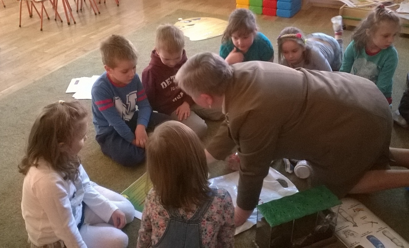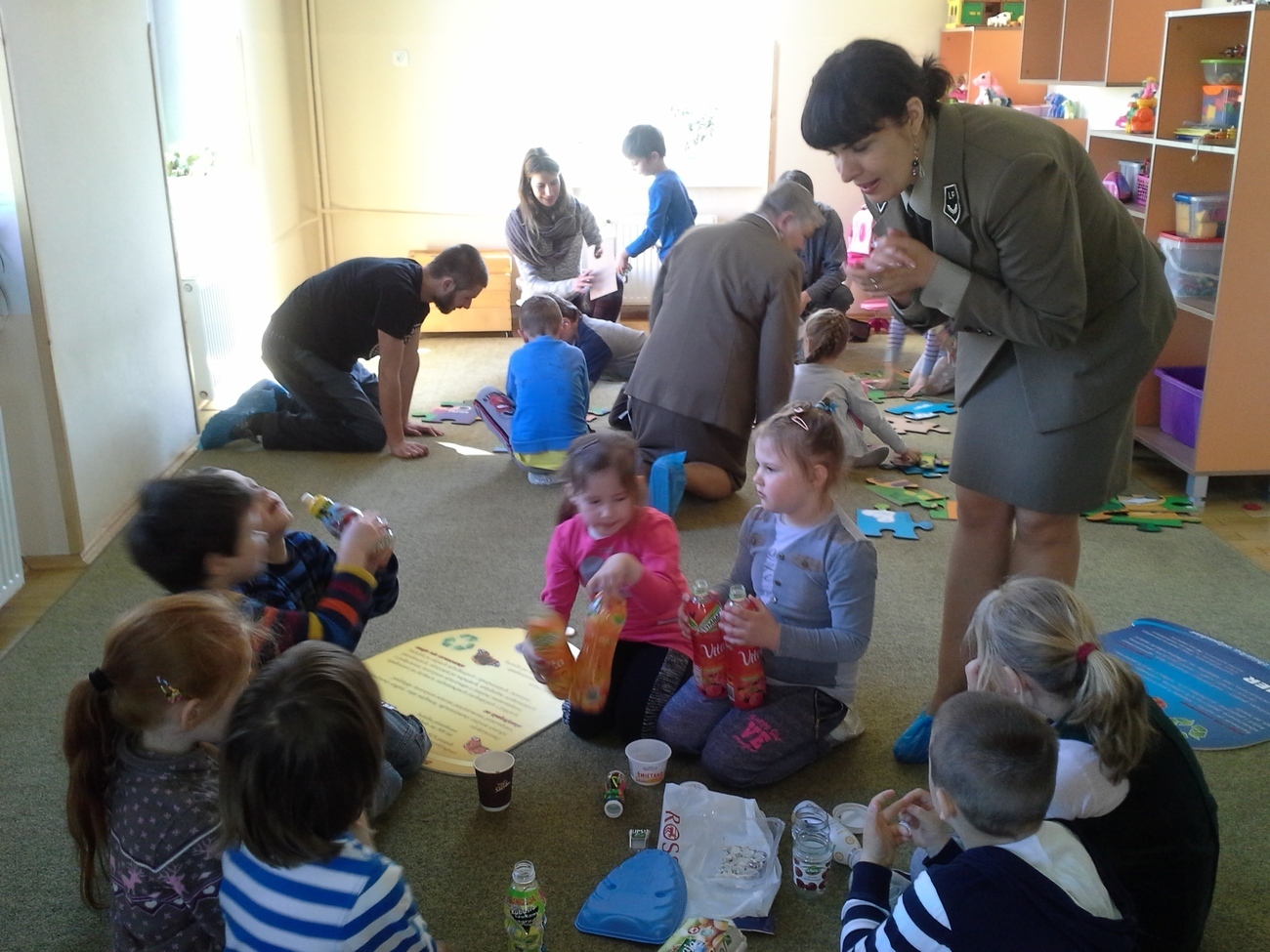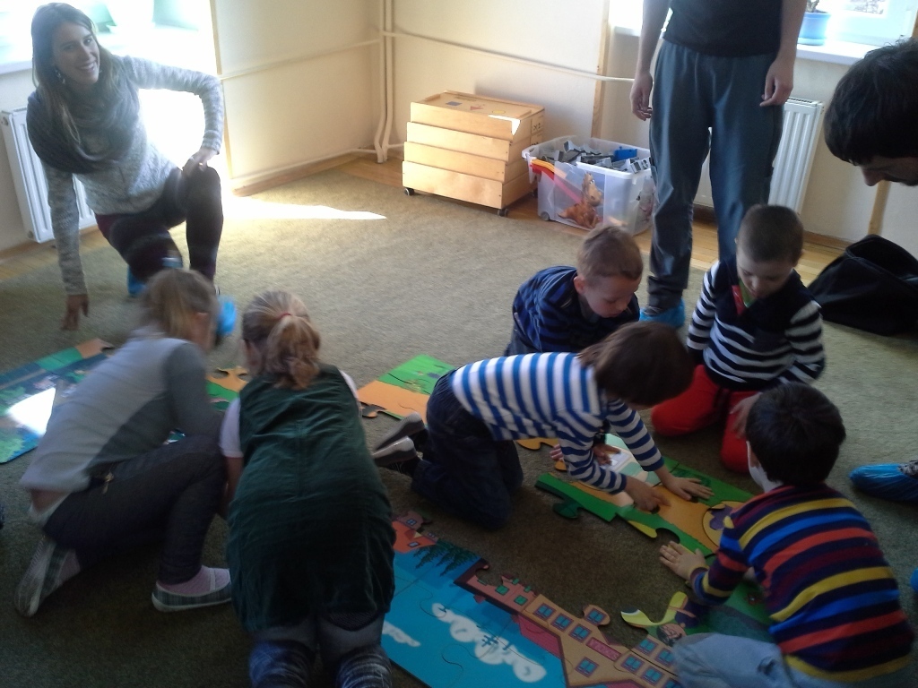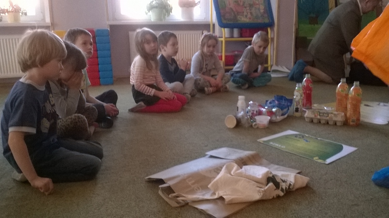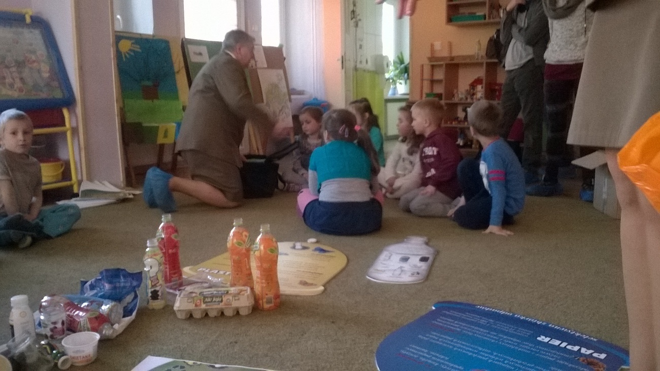 Nasi gości przynieśli ze sobą mnóstwo ciekawych rzeczy tj. ogromne ekologiczne puzzle, wizerunki koszy na śmieci, różne śmieci, ciekawe okazy śmieci w terrariach z ziemią oraz karty do pokolorowania. Wspólnie segregowaliśmy śmieci do odpowiednich pojemników oraz układaliśmy wielkie puzzle przedstawiające kontenery do segregacji śmieci. Bariera językowa nie stanowiła problemów, ponieważ wspólna praca i zaangażowanie w zupełności wystarczyły.