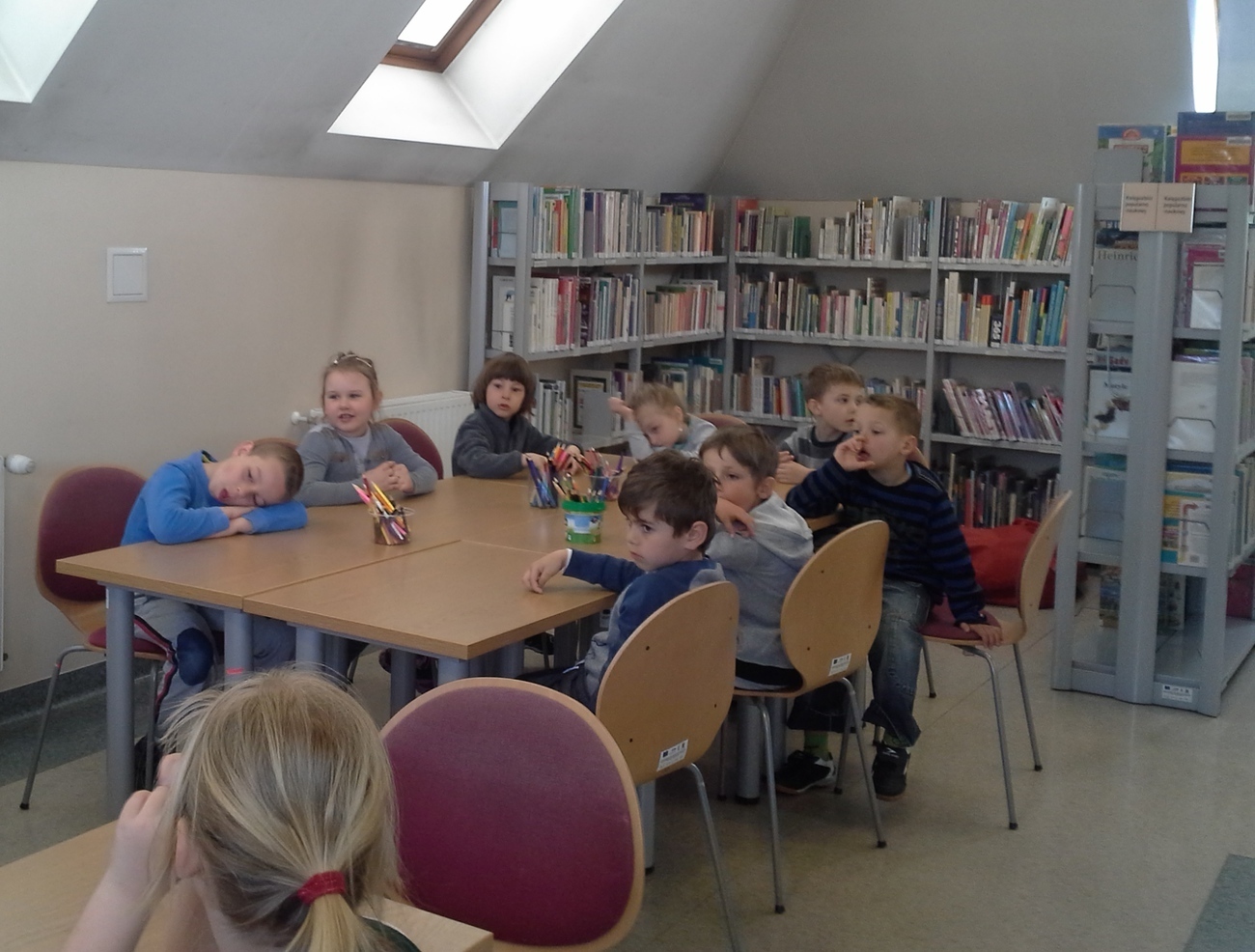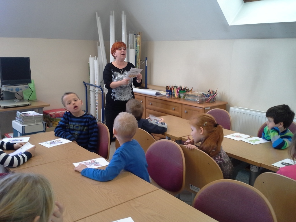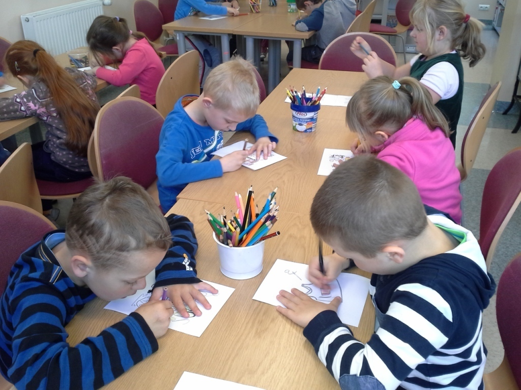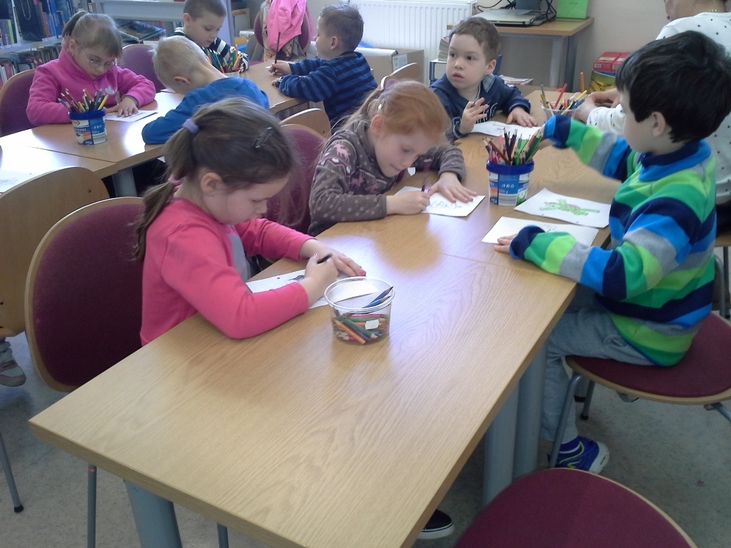 Po śniadaniu i porannych zajęciach żwawym krokiem ruszyliśmy na warsztaty do Książnicy Karkonoskiej. Dziś mieliśmy się dowiedzieć jak powstają książki. Najpierw pani bibliotekarka pokazała nam kilka książek, a my na podstawie ilustracji na okładkach bez problemu odgadywaliśmy tytuły. To ćwiczenie pokazało nam jak ważne w książkach dla dzieci są obrazki czyli ilustracje. Dzięki nim nawet nie umiejąc czytać możemy obejrzeć bajkę i poznać historię zawartą w książce. Następnie każdy z nas dostał do pokolorowania jedną stronę z książki, którą pani z biblioteki złożyła w całość w odpowiedniej kolejności. Odgazdywaliśmy również zagadki dotyczące bohaterów różnych bajek. Wróciliśmy do przedszkola zadowoleni, ponieważ wspólnie stworzyliśmy naszą własną książeczkę.