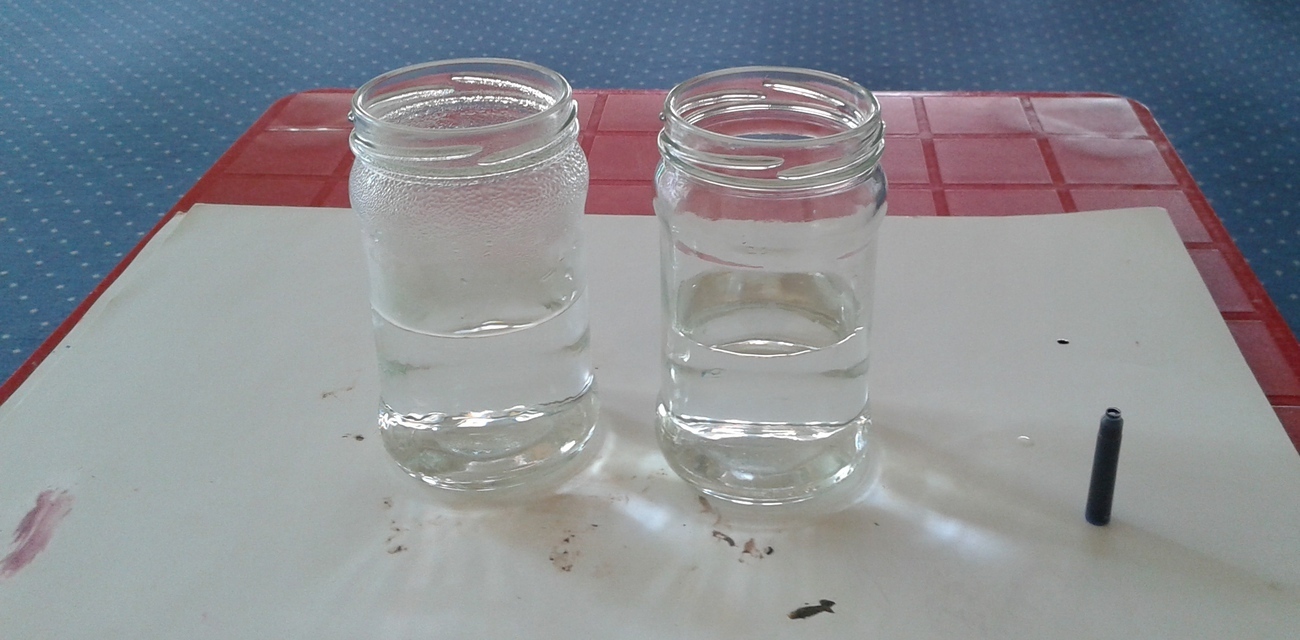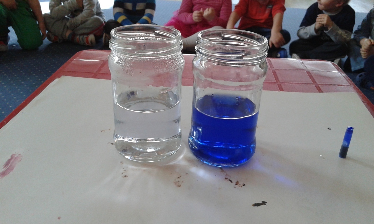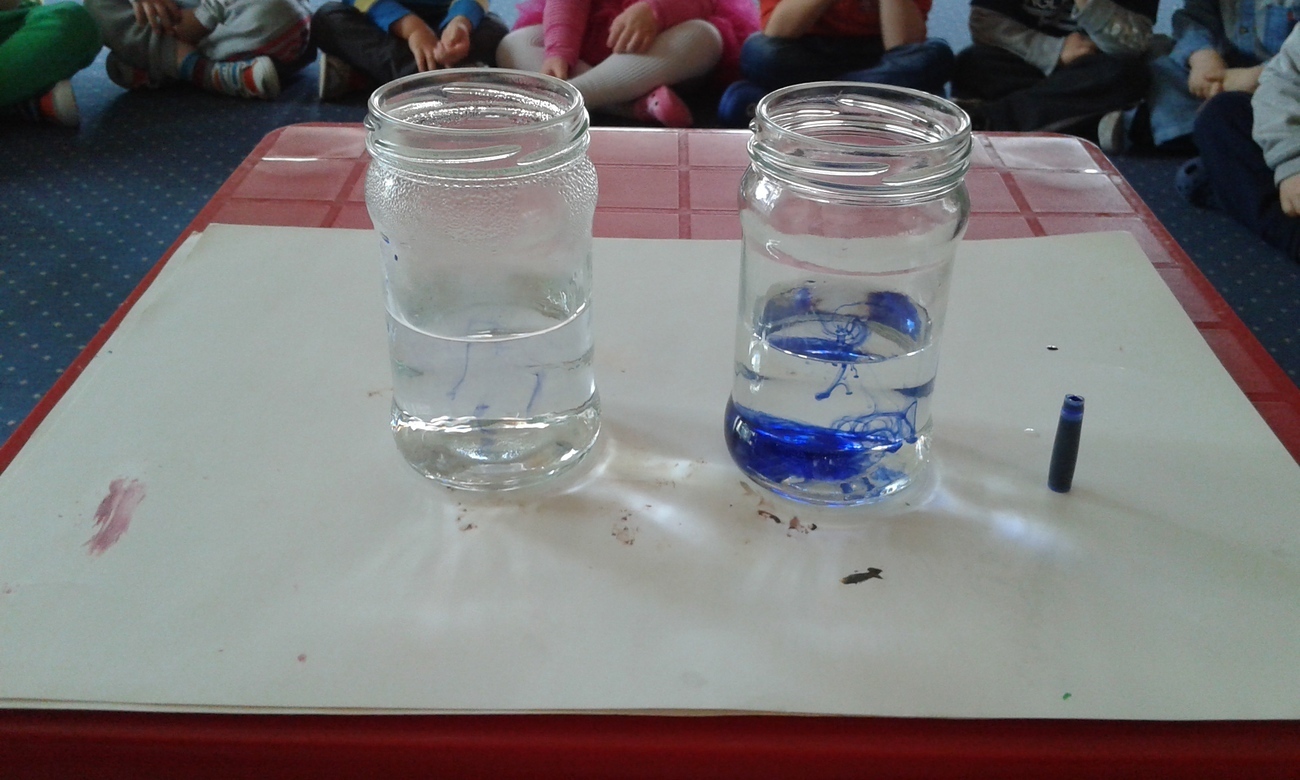 Kolejnym naszym eksperymentem było sprawdzenie co się stanie, gdy wlejemy niebieski tusz do pojemnika z ciepłą i do pojemnika z zimną wodą. Ku naszemu zdziwieniu stały się prawdziwe czary. W gorącej wodzie tusz zniknął, a w zimniej zabarwił całą wodę. Potem wypełnialiśmy formularz obserwacji jak prawdziwi badacze.