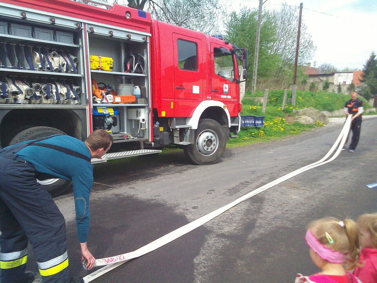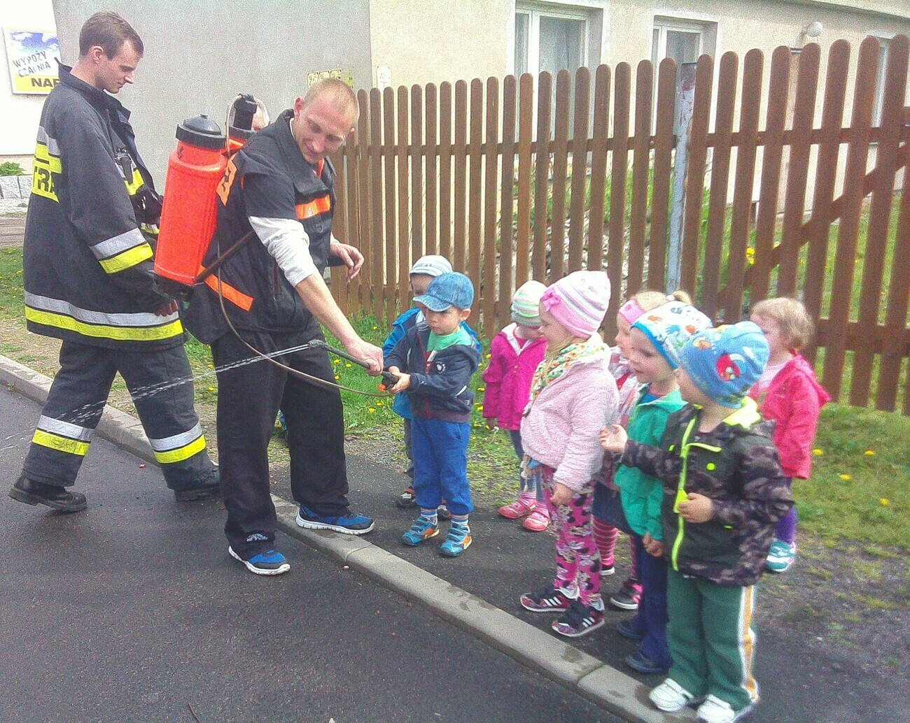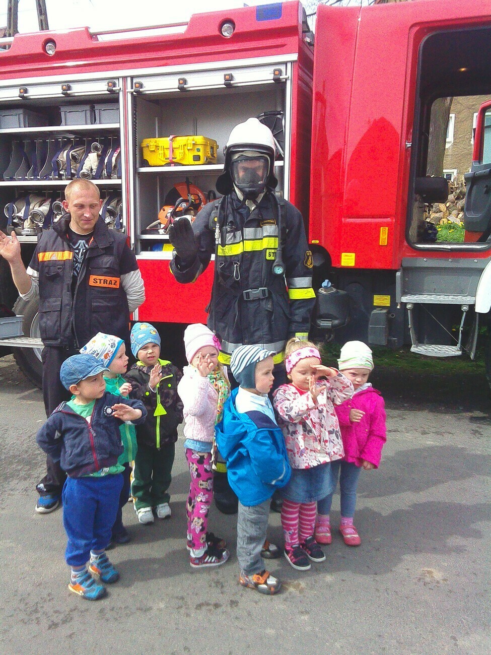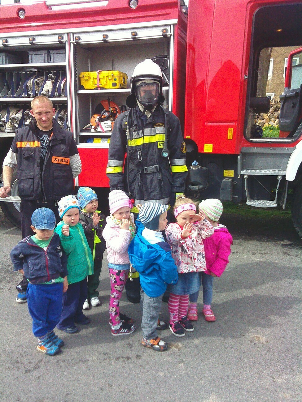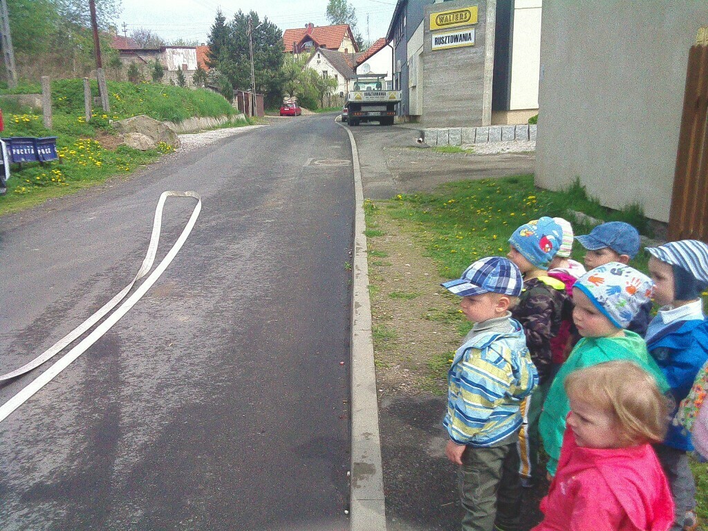 W dniu 05.05.2015 r gościliśmy w remizie Ochotniczej Straży Pożarnej mieszczącej się przy ul. Wiejskiej. Mieliśmy okazję zobaczyć nowy wóz strażacki razem z wyposażeniem. Panowie strażacy opowiedzieli nam na czym polegają wykonywane przez nich czynności, pokazali jak szybko trzeba rozwinąć wąż strażacki i jak go potem sprawnie zwinąć. Wzięliśmy również udział w małej scence i „gasiliśmy” oczywiście wymyślony ogień. Strażacy pozwolili na wejść wszystkim do wozu strażackiego, a następnie zaprezentowali różne dźwięki syreny. Na zakończenie wykonaliśmy pamiątkowe zdjęcia. Zmęczeni ale zadowoleni z udanej wycieczki wróciliśmy do przedszkola.