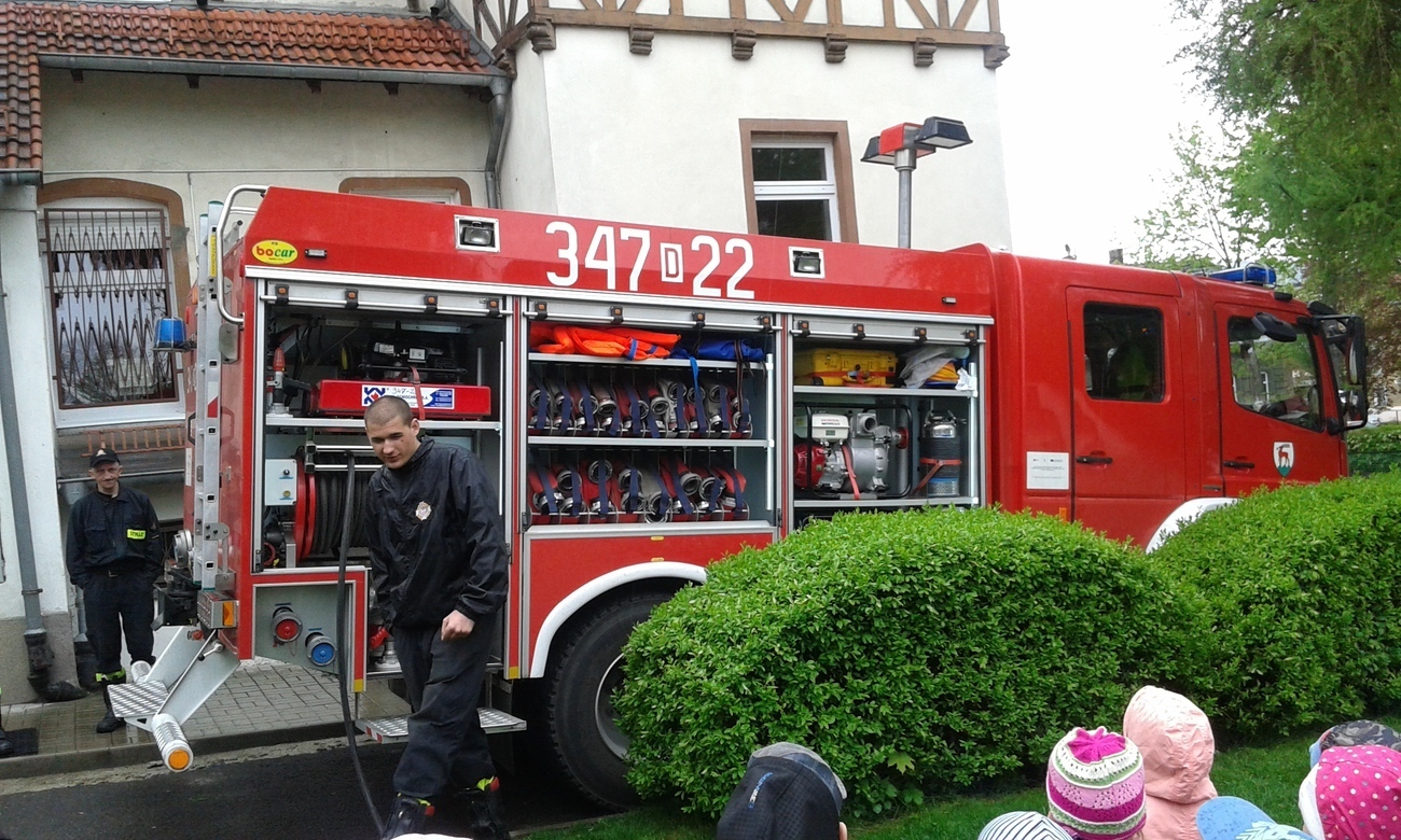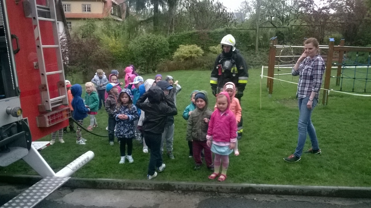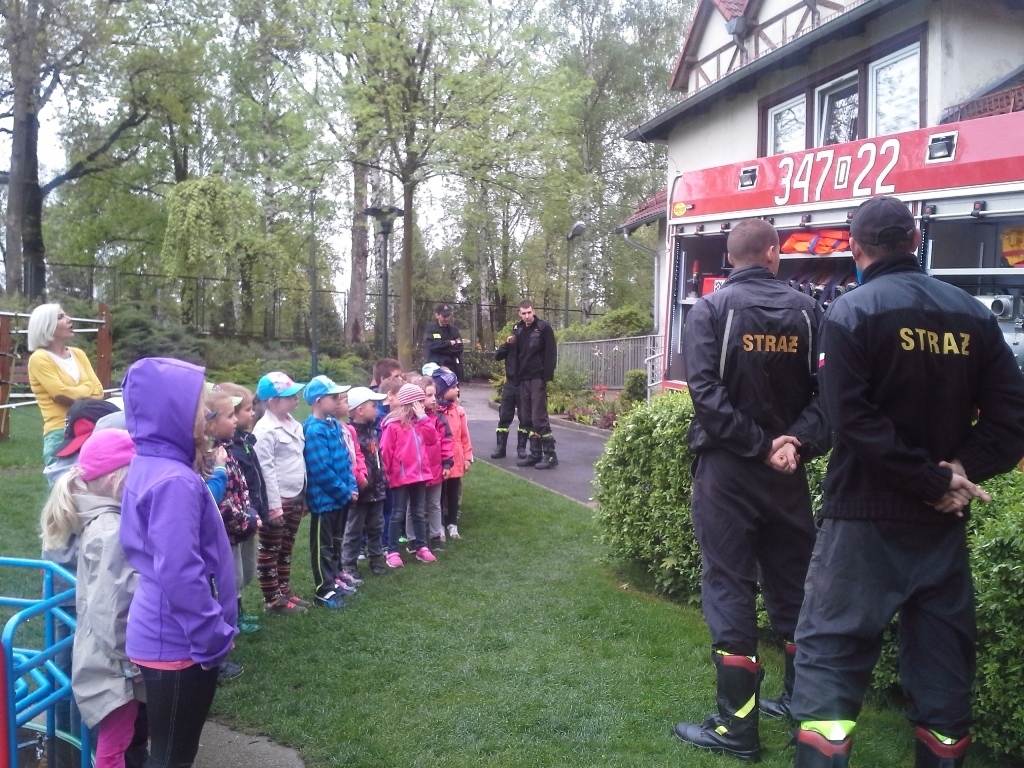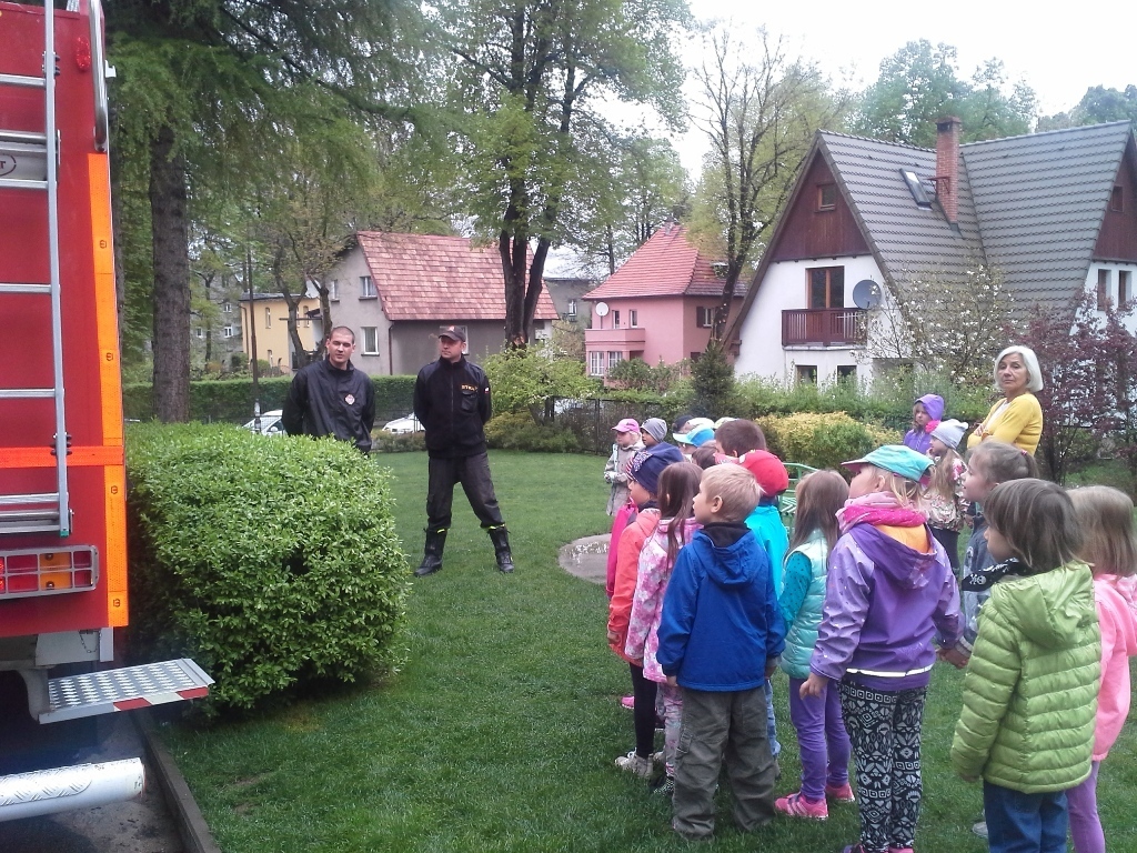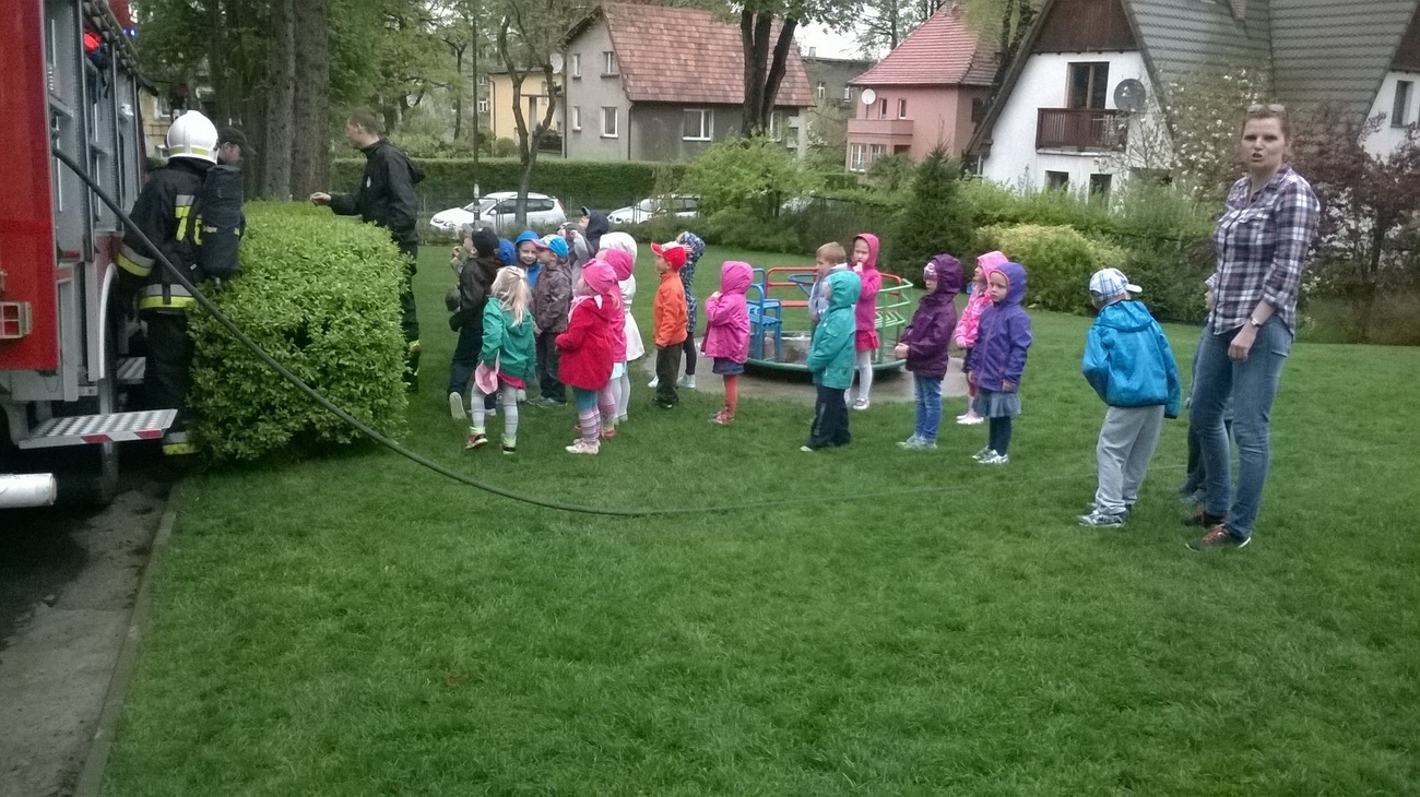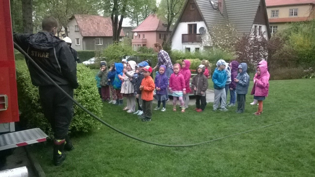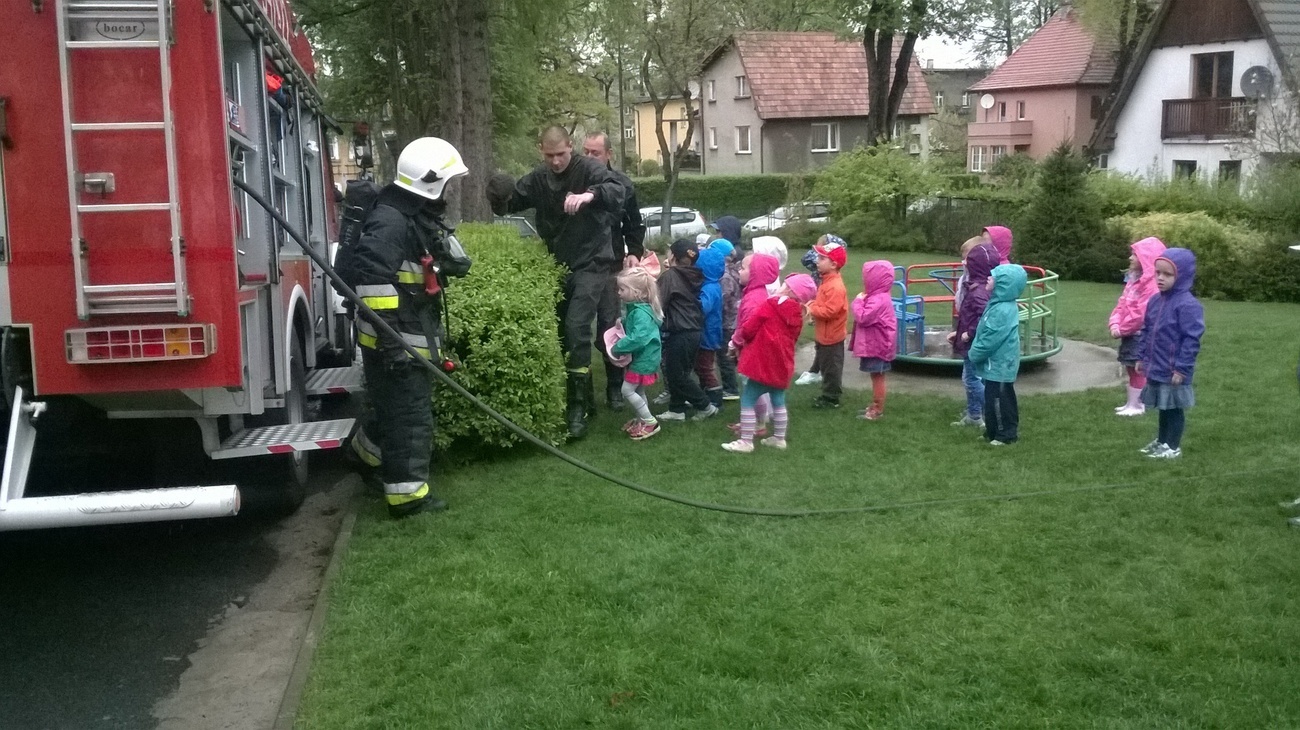06.05.2015 r. to data, która na długo zapadnie nam w pamięć, gdyż tego dnia pomimo złej pogody zawitali do nas strażacy z Ochotniczej Straży Pożarnej w Sobieszowie. Dzieci już od rana z niecierpliwością wyczekiwały momentu kiedy to na naszym podwórku pojawi się upragniony wóz strażaków. Panowie przygotowali dla nas wspaniały pokaz swoich możliwości i sprzętu jakim dysponują. Widzieliśmy jak daleko może sięgać strażacki wąż oraz jak wysoko może sięgać strumień wody. Mieliśmy też możliwość zajrzeć do wnętrza samochodu i choć trochę poczuć się jak strażacy jadący na akcje. Wszystkie dzieci były zachwycone naszymi gośćmi.