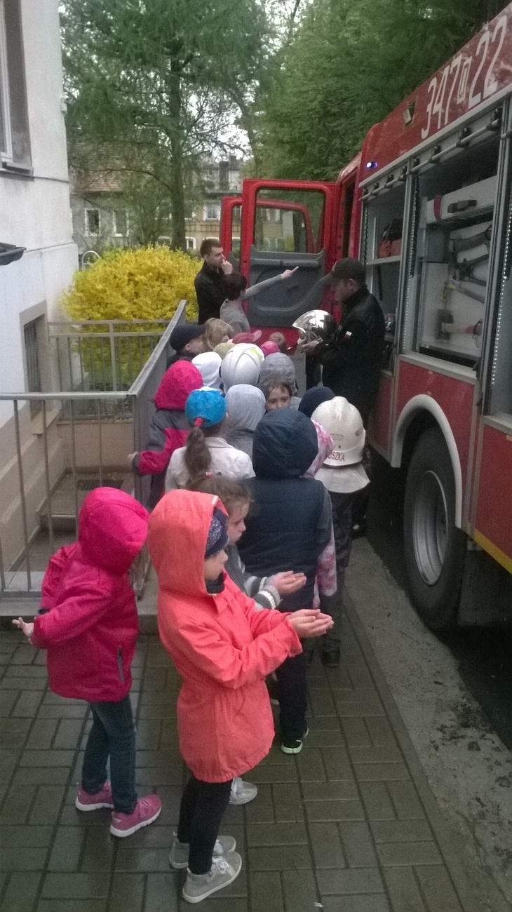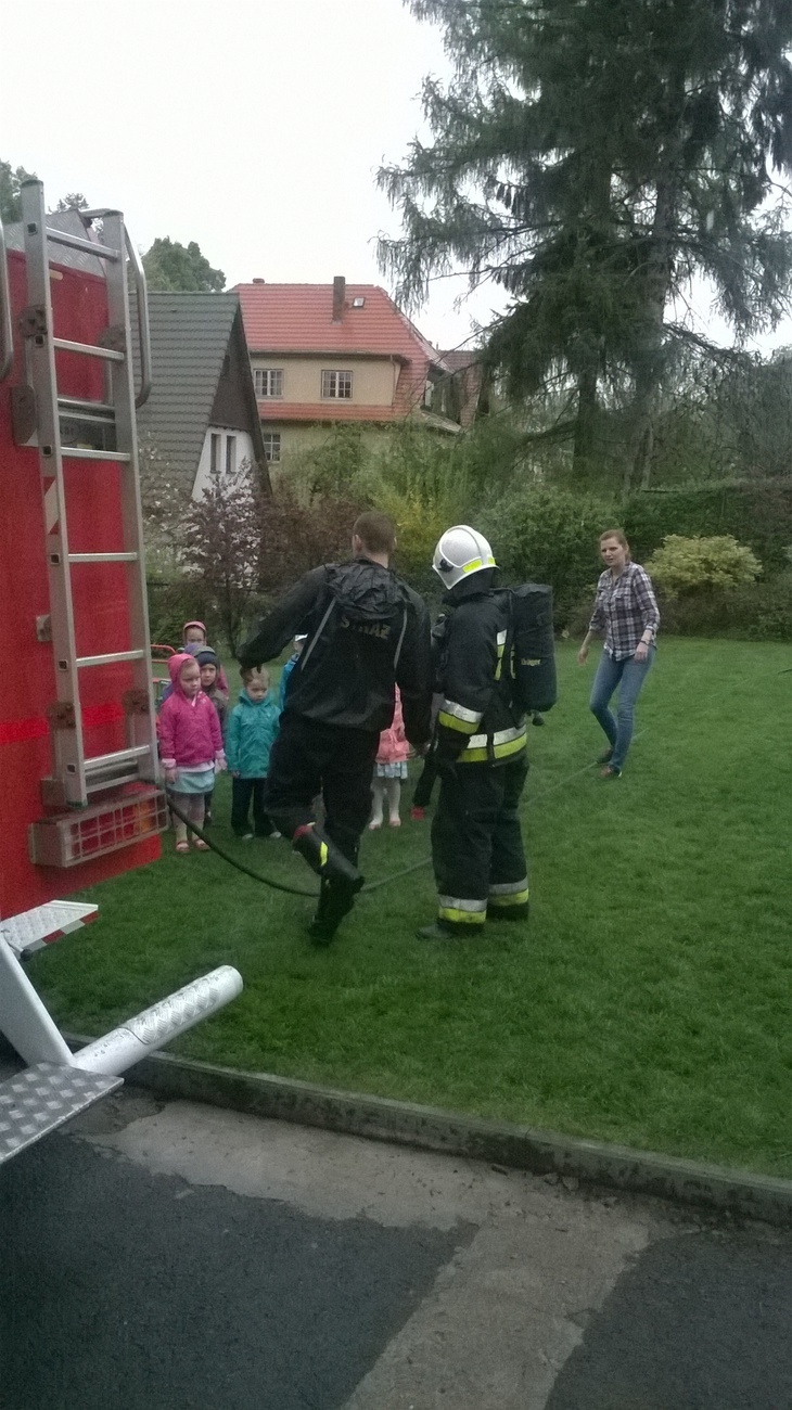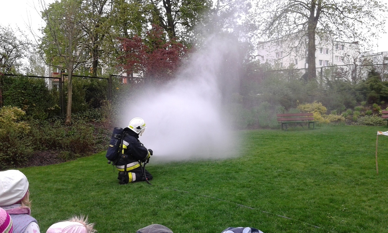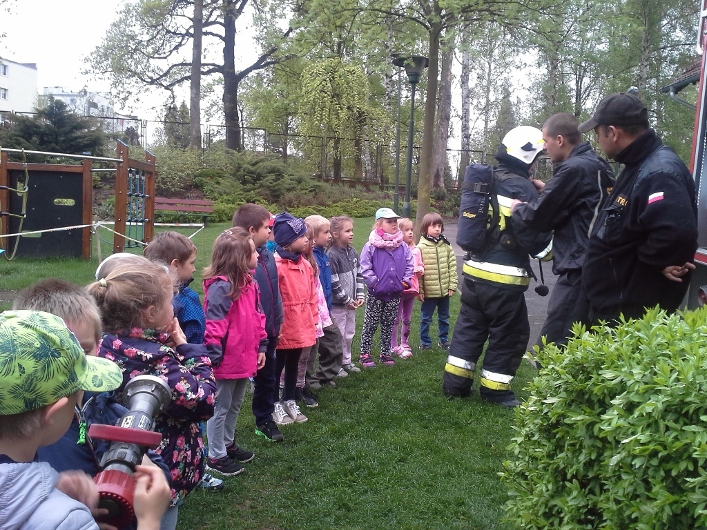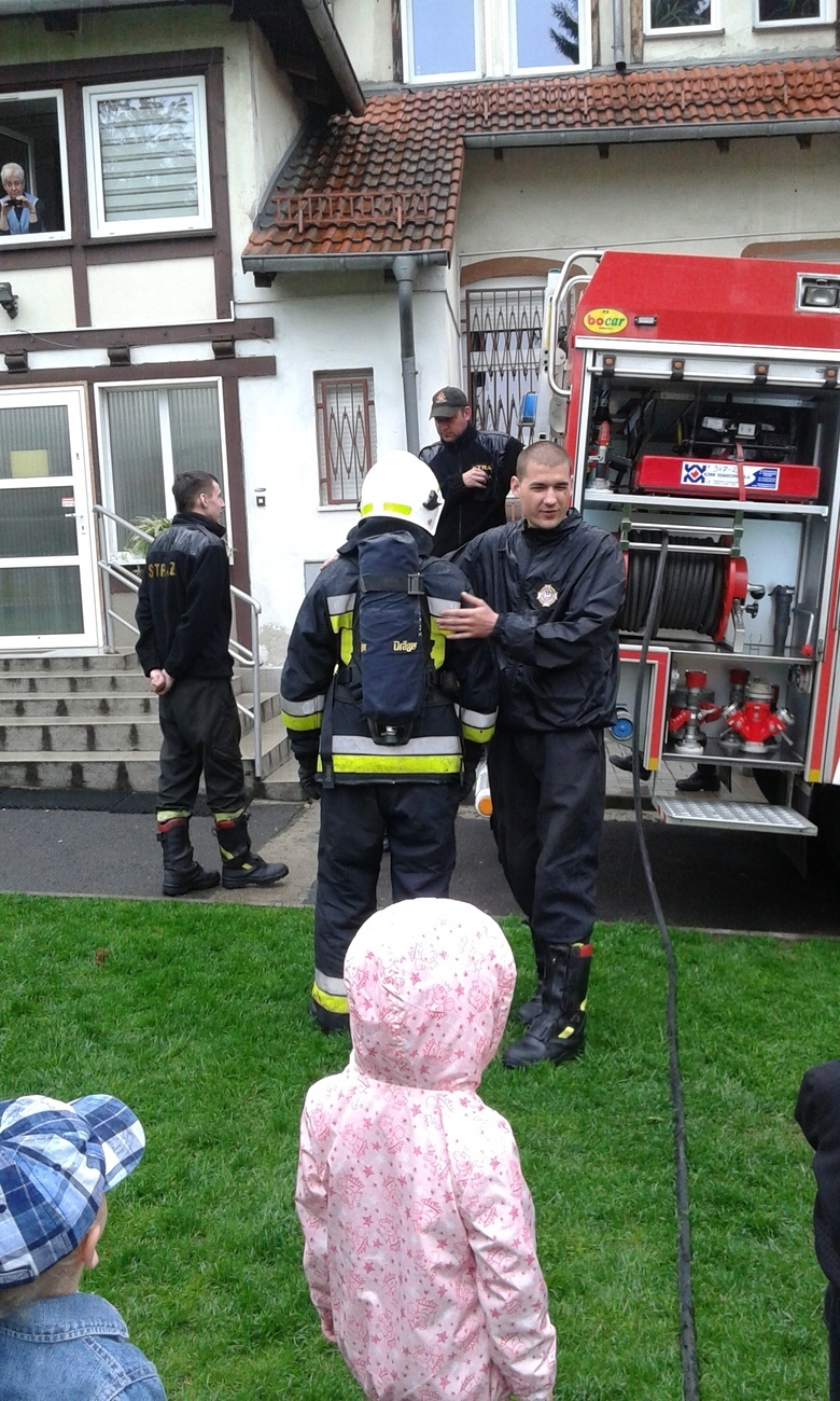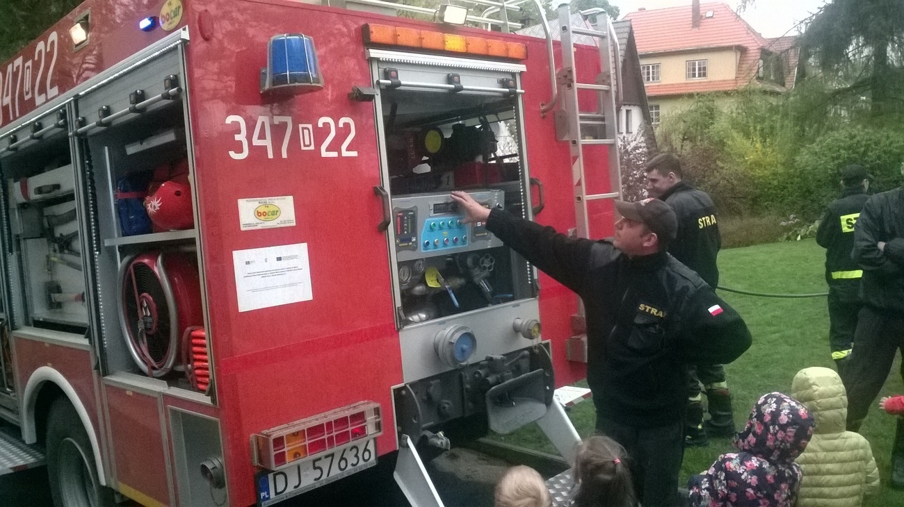 06.05.2015 r. to data, która na długo zapadnie nam w pamięć, gdyż tego dnia pomimo złej pogody zawitali do nas strażacy z Ochotniczej Straży Pożarnej w Sobieszowie. Dzieci już od rana z niecierpliwością wyczekiwały momentu kiedy to na naszym podwórku pojawi się upragniony wóz strażaków. Panowie przygotowali dla nas wspaniały pokaz swoich możliwości i sprzętu jakim dysponują. Widzieliśmy jak daleko może sięgać strażacki wąż oraz jak wysoko może sięgać strumień wody. Mieliśmy też możliwość zajrzeć do wnętrza samochodu i choć trochę poczuć się jak strażacy jadący na akcje. Wszystkie dzieci były zachwycone naszymi gośćmi.