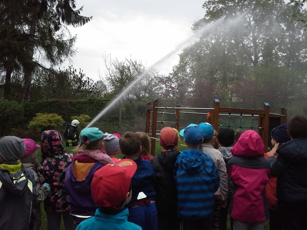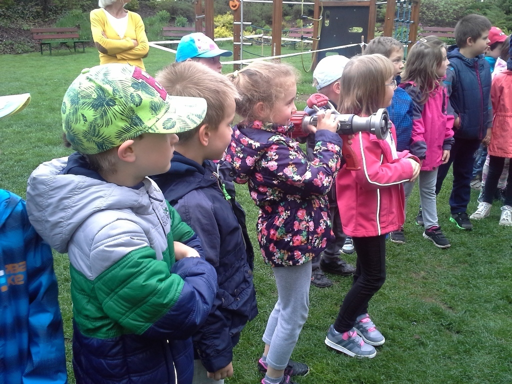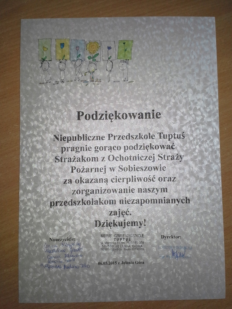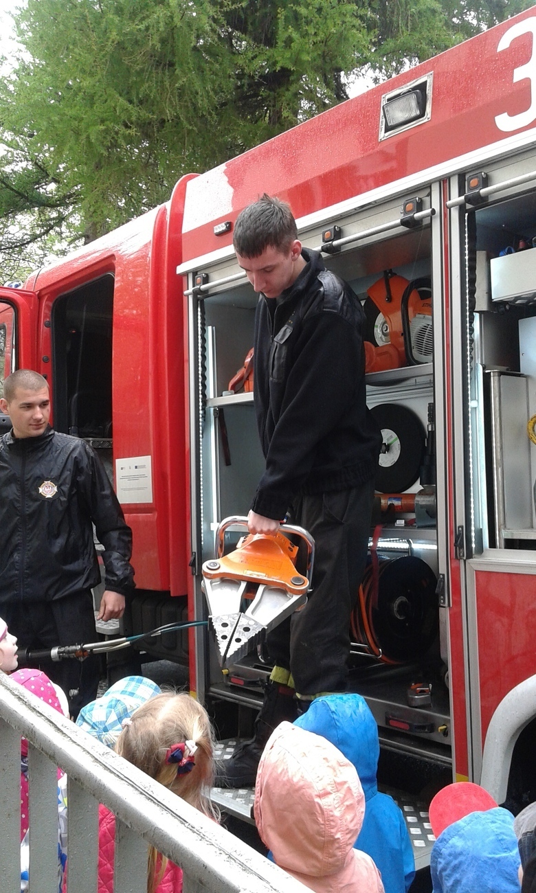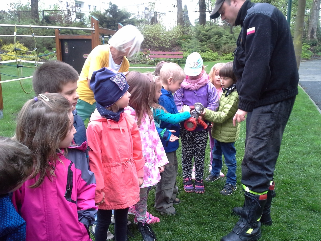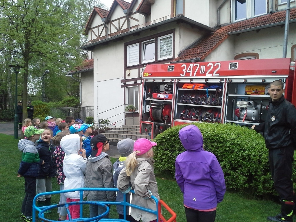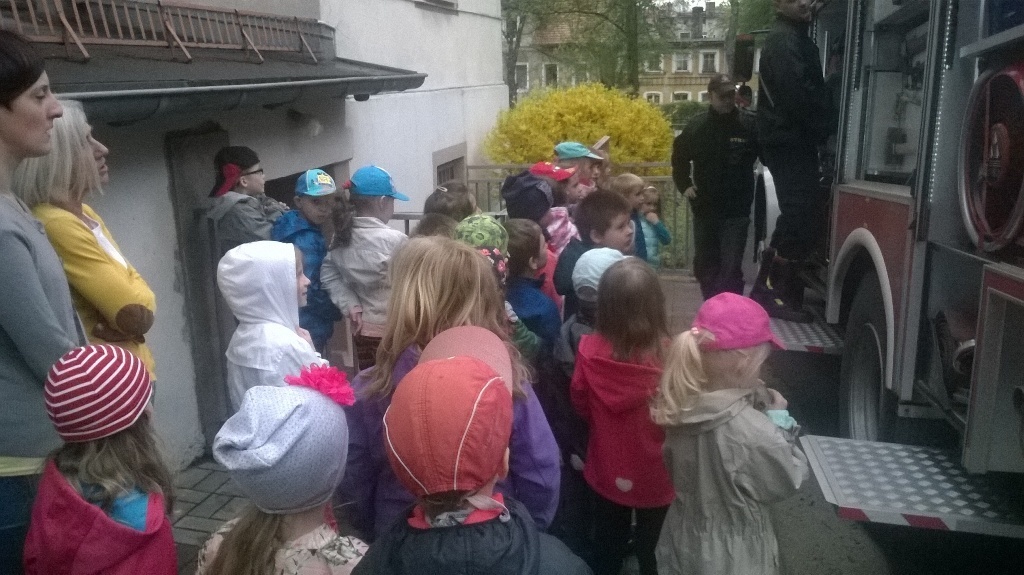 06.05.2015 r. to data, która na długo zapadnie nam w pamięć, gdyż tego dnia pomimo złej pogody zawitali do nas strażacy z Ochotniczej Straży Pożarnej w Sobieszowie. Dzieci już od rana z niecierpliwością wyczekiwały momentu kiedy to na naszym podwórku pojawi się upragniony wóz strażaków. Panowie przygotowali dla nas wspaniały pokaz swoich możliwości i sprzętu jakim dysponują. Widzieliśmy jak daleko może sięgać strażacki wąż oraz jak wysoko może sięgać strumień wody. Mieliśmy też możliwość zajrzeć do wnętrza samochodu i choć trochę poczuć się jak strażacy jadący na akcje. Wszystkie dzieci były zachwycone naszymi gośćmi.