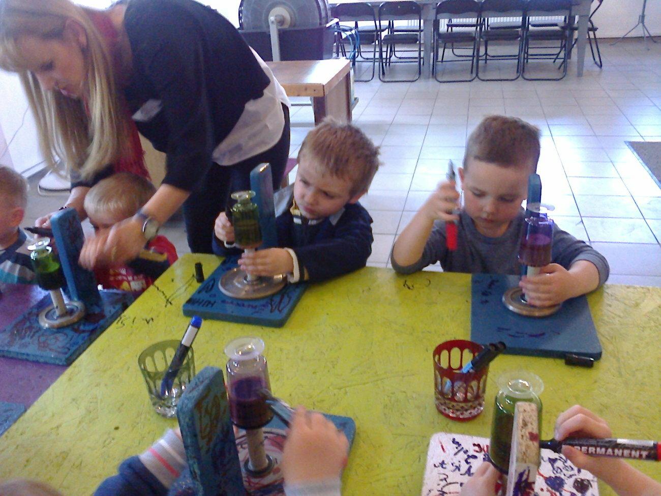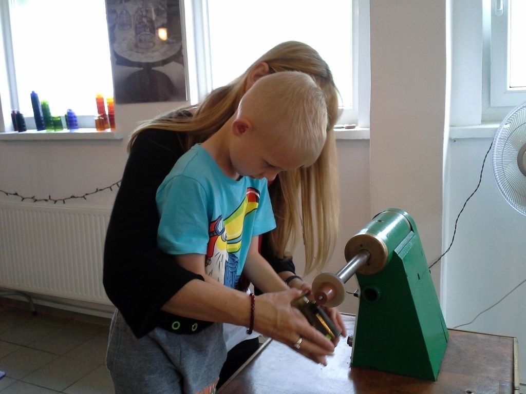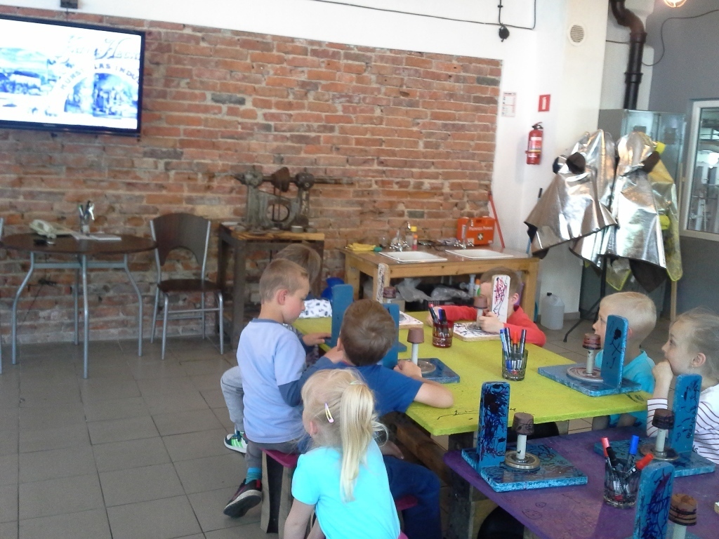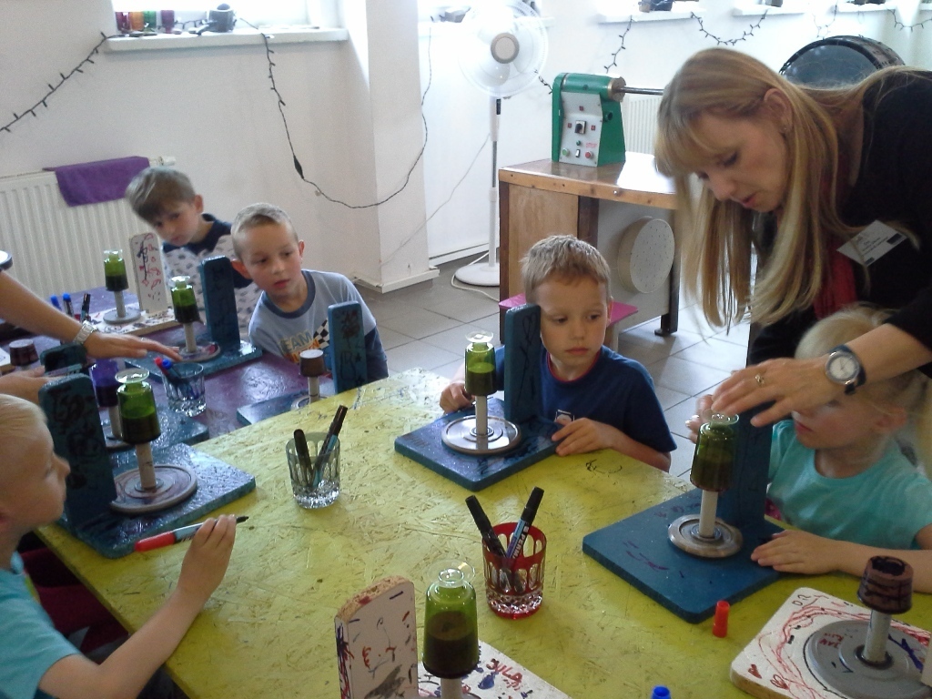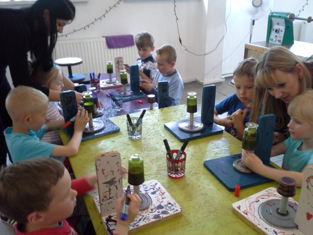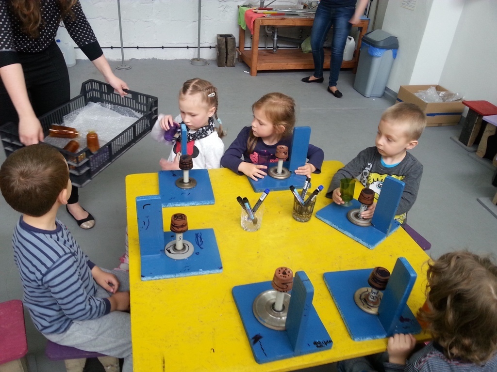 Zostaliśmy podzieleni na kilka małych grup i w takim gronie podążyliśmy na warsztaty. Tam dmuchaliśmy bańki mydlane, a potem wykonaliśmy własne kubeczki, które mogliśmy zabrać do domu.