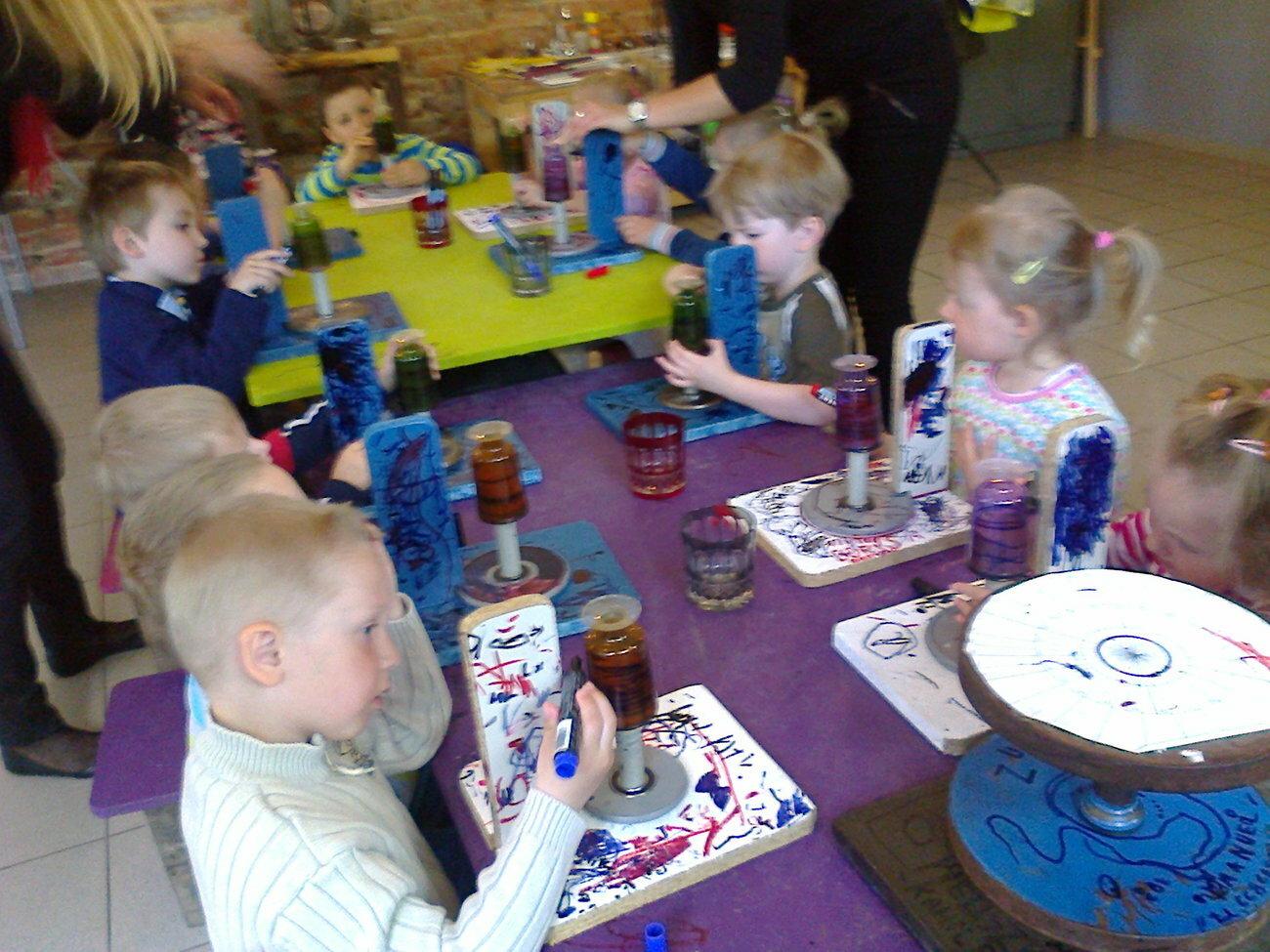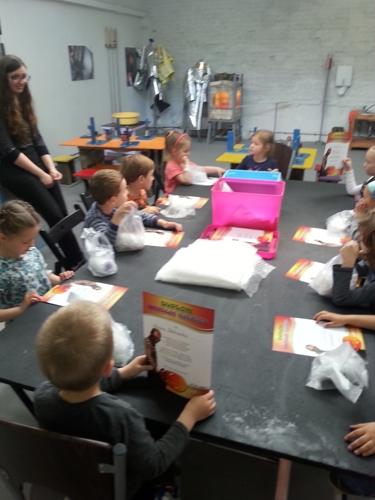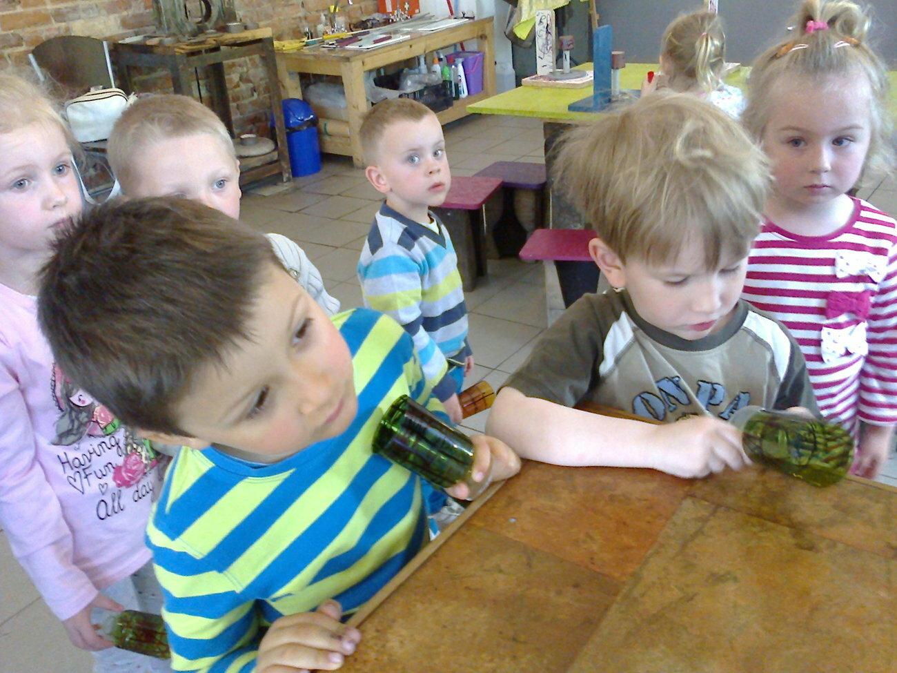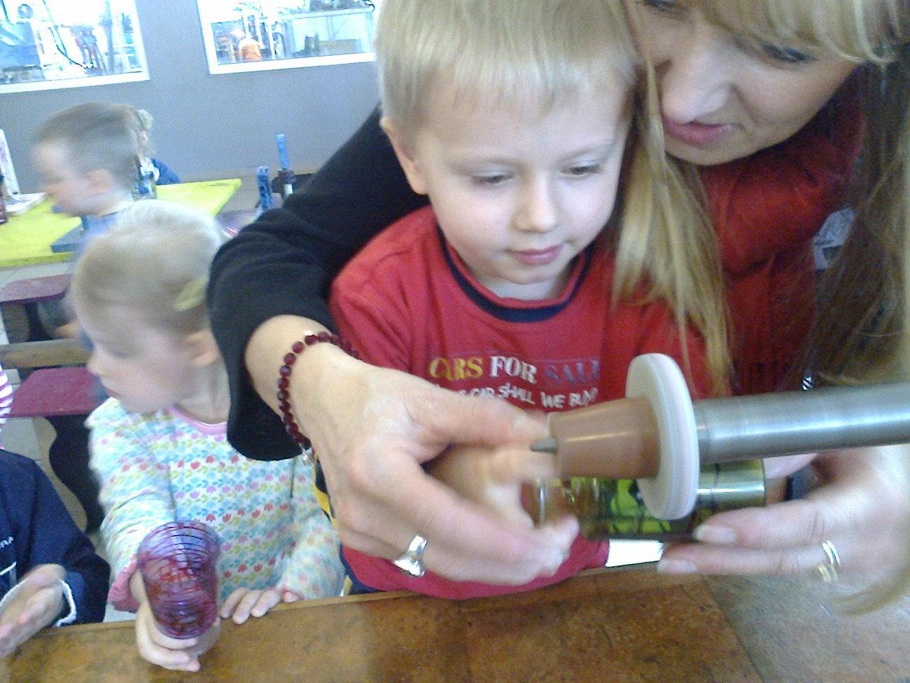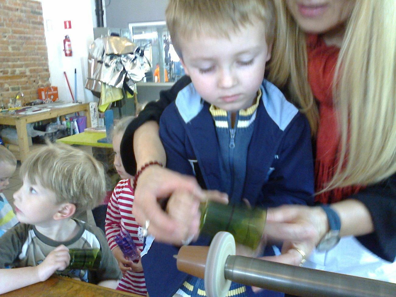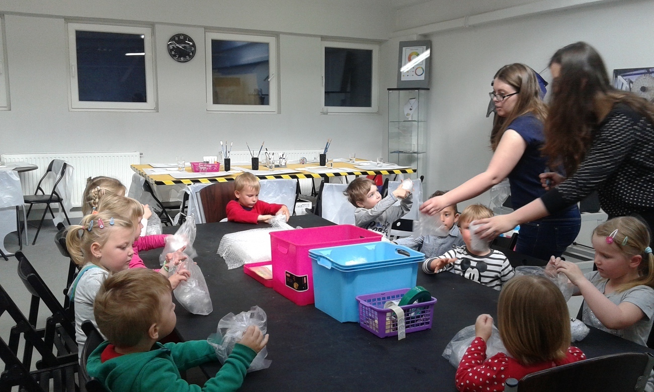 Zostaliśmy podzieleni na kilka małych grup i w takim gronie podążyliśmy na warsztaty. Tam dmuchaliśmy bańki mydlane, a potem wykonaliśmy własne kubeczki, które mogliśmy zabrać do domu.