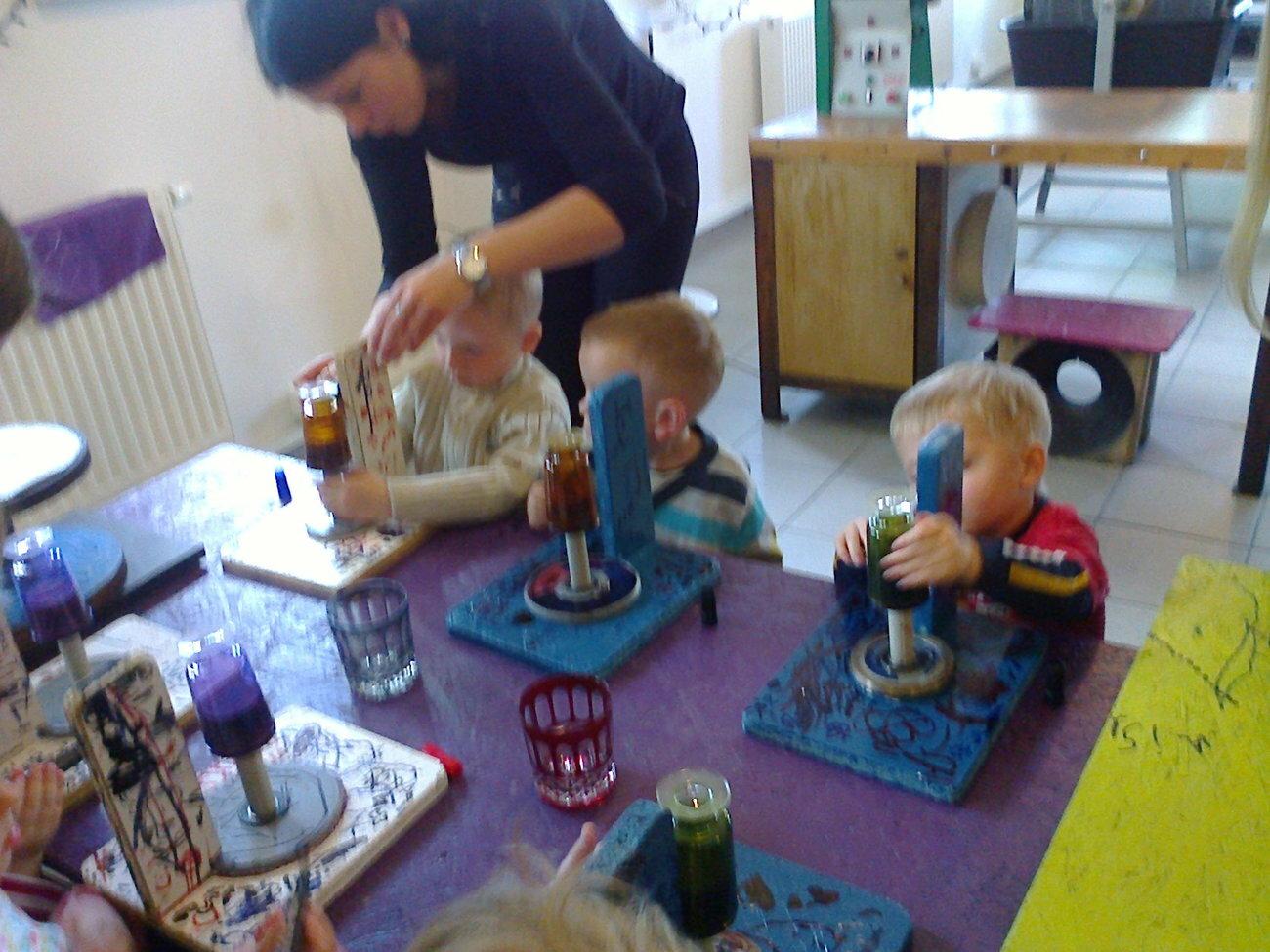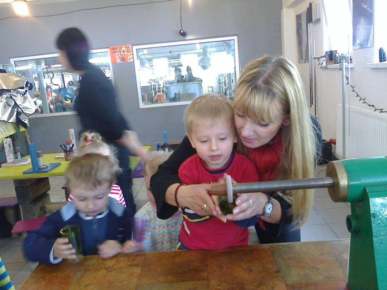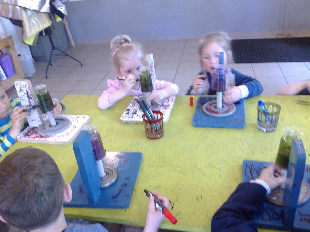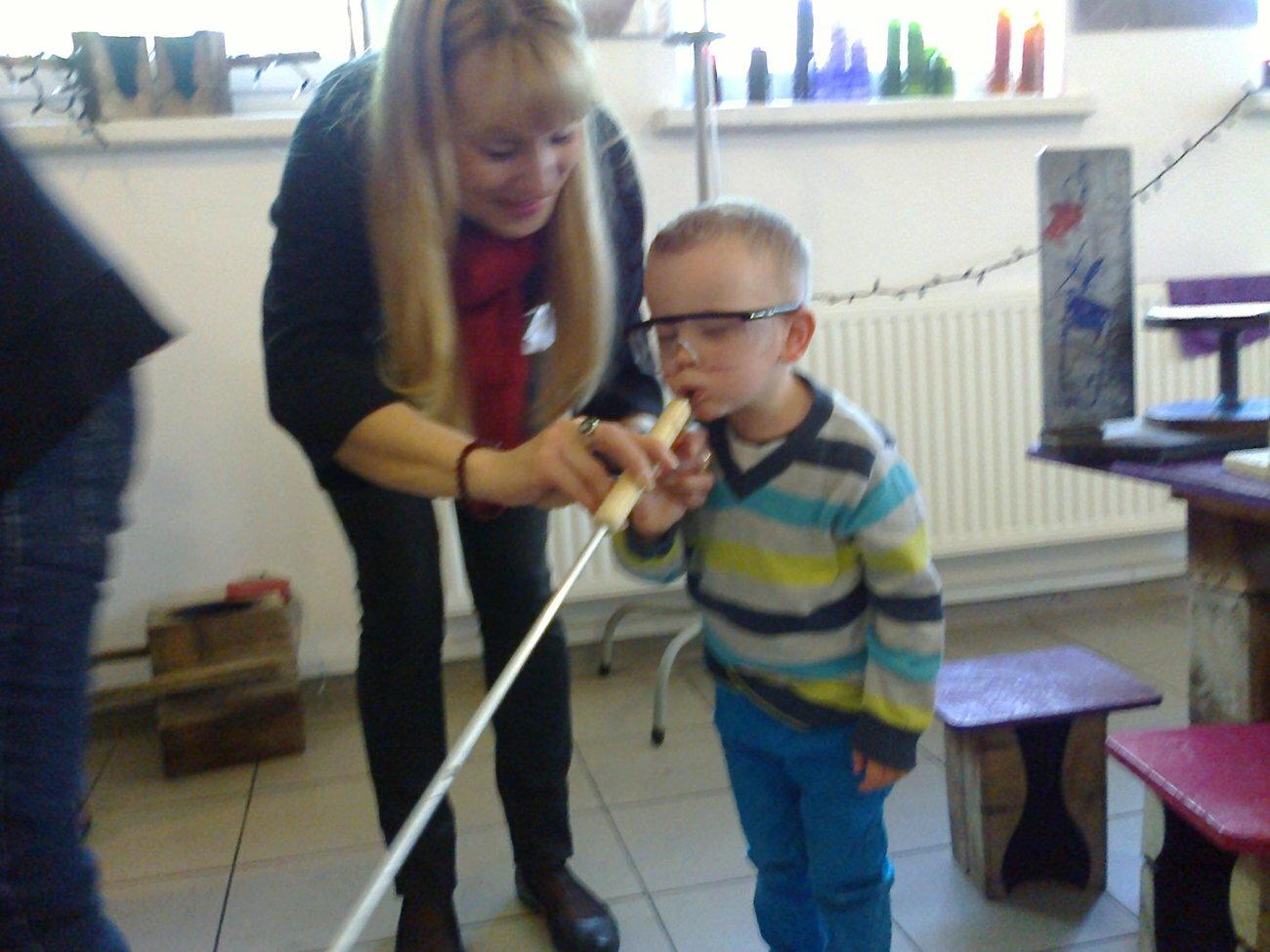 Zostaliśmy podzieleni na kilka małych grup i w takim gronie podążyliśmy na warsztaty. Tam dmuchaliśmy bańki mydlane, a potem wykonaliśmy własne kubeczki, które mogliśmy zabrać do domu.