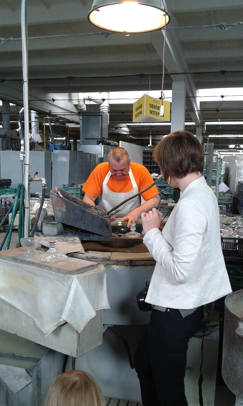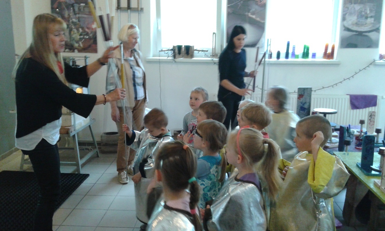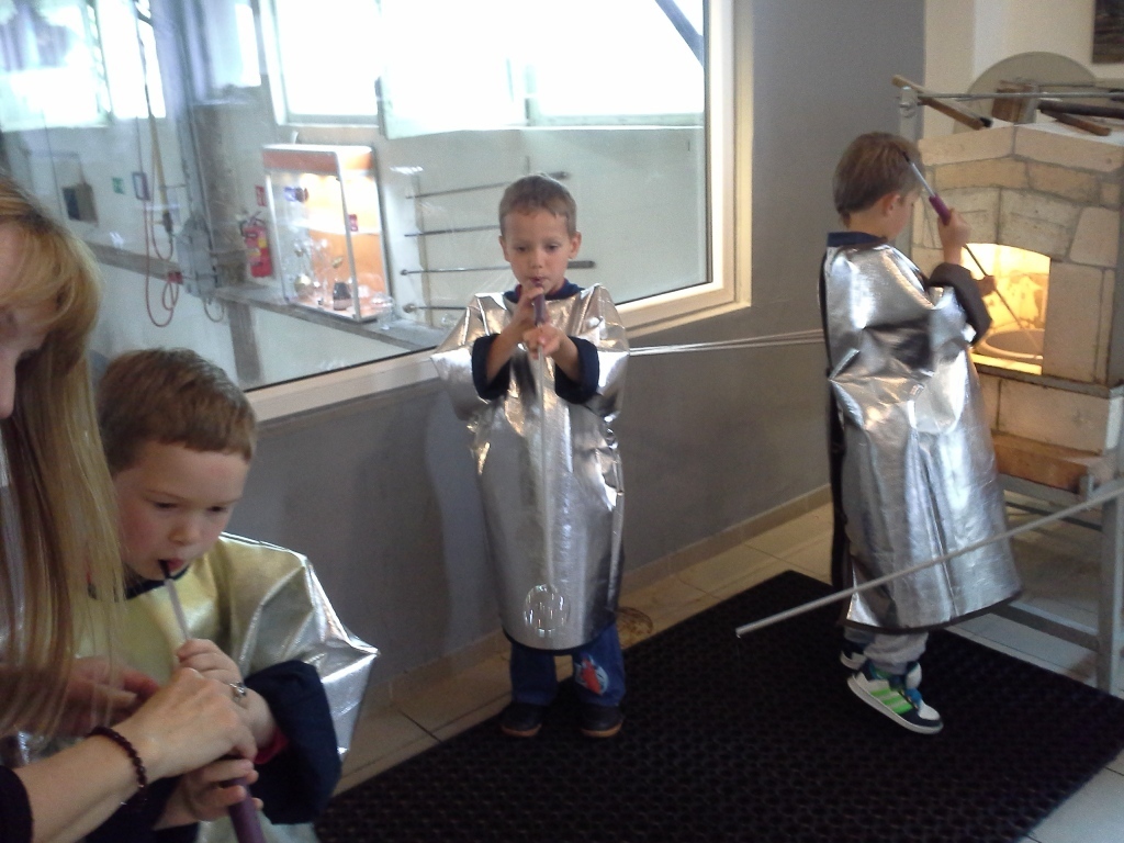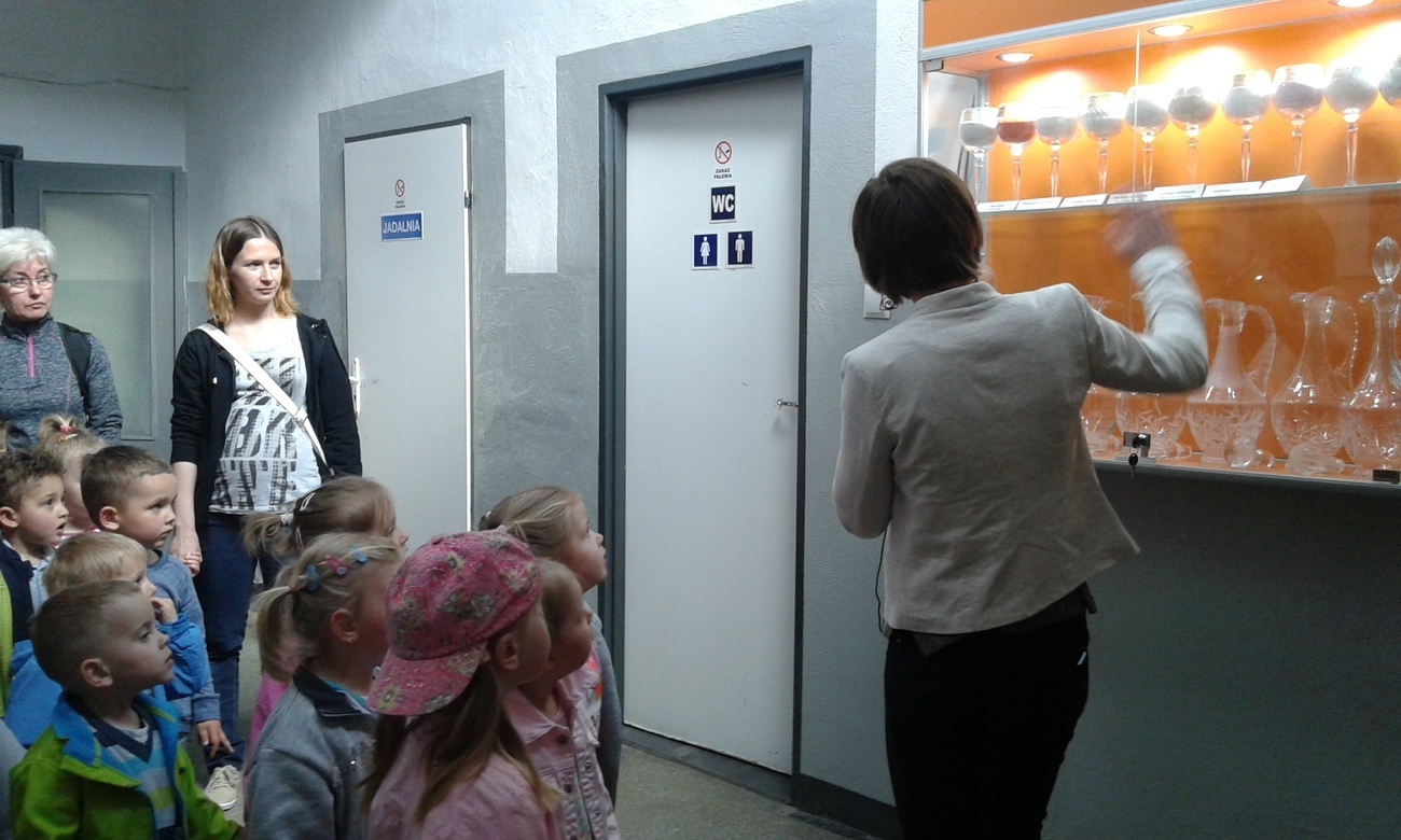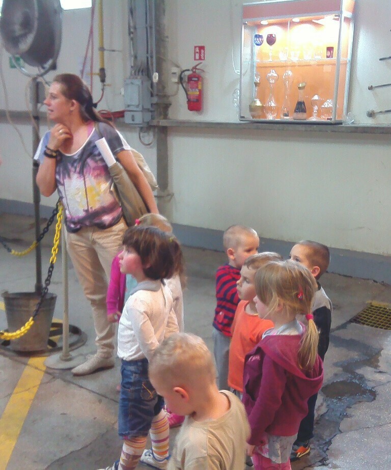 Zobaczyliśmy także stroje w jakich pracują przy piecu, pracownicy huty. Zwiedzaliśmy także hutę, ponieważ byliśmy ciekawi jak powstaje szkło. Od dzisiaj wiemy, że do wyrobu szkła potrzebny jest piasek i stłuczka szklana. W pomieszczeniach było strasznie gorąco i głośno, kiedy przyglądaliśmy się pracy przy piecach. Oglądaliśmy również jak panie polerują szkło i ozdabiają je. Pomyśleliśmy, że muszą być bardzo zdolne i wytrwałe.