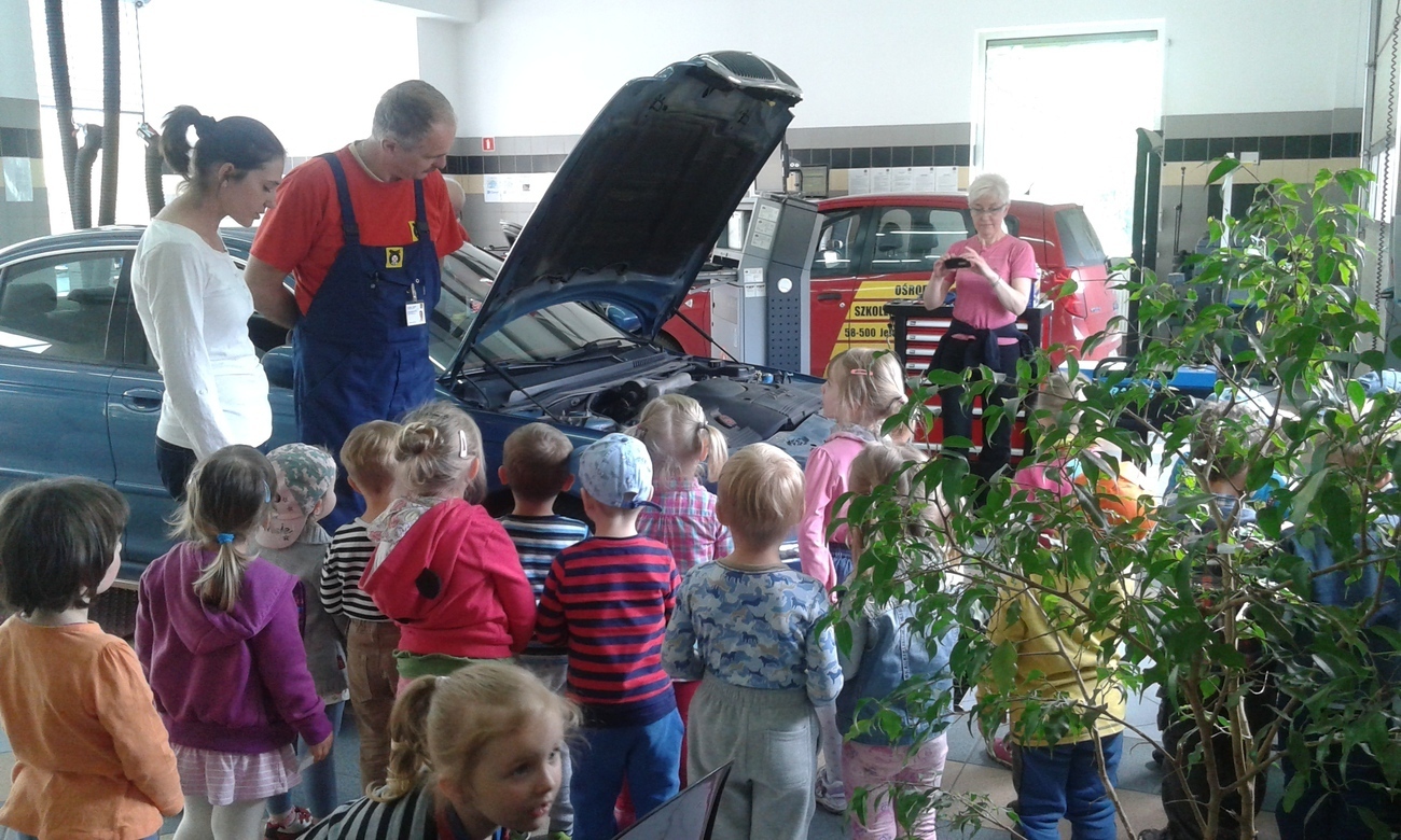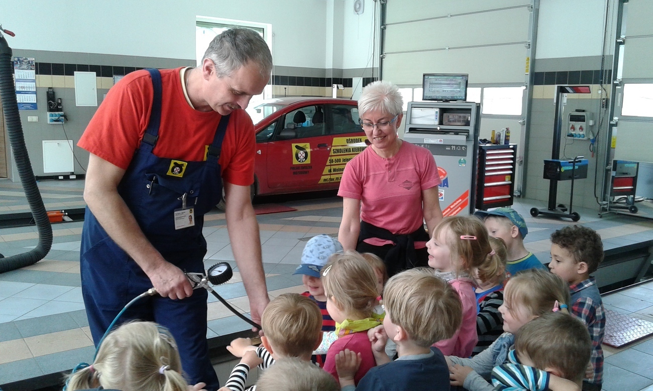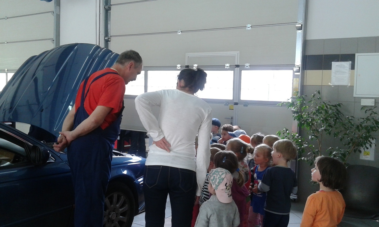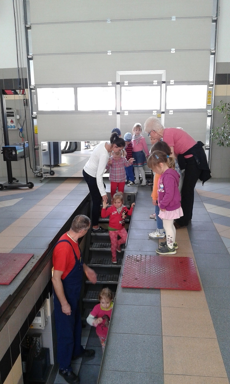 Tygryski i Skrzaty są bardzo ciekawe świata i lubią podczas spacerów poszukiwać przygód. I tak było tym razem. Wędrując tak wokół przedszkola p. Karolina , p. Klaudia i p. Lucynka pomyślały może odwiedzimy panów mechaników ze stacji diagnostycznej.