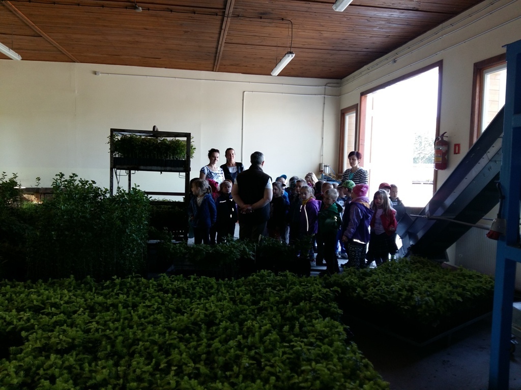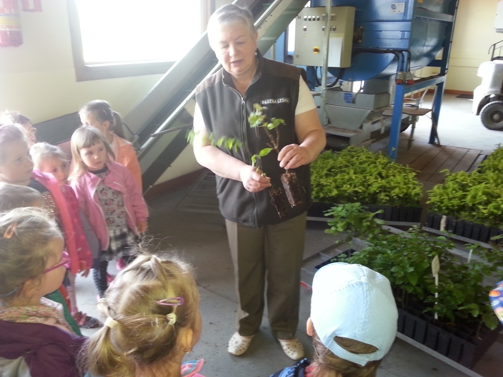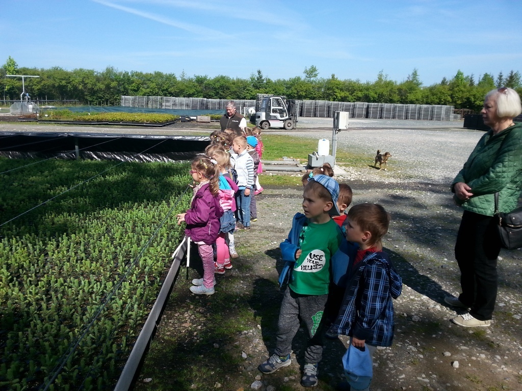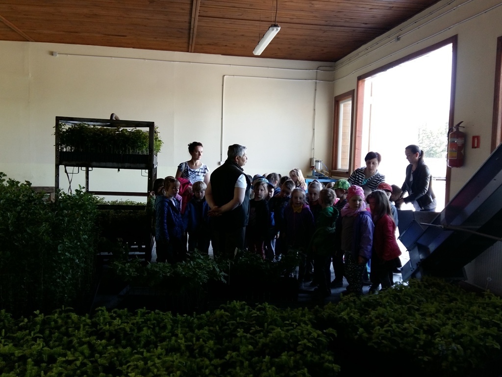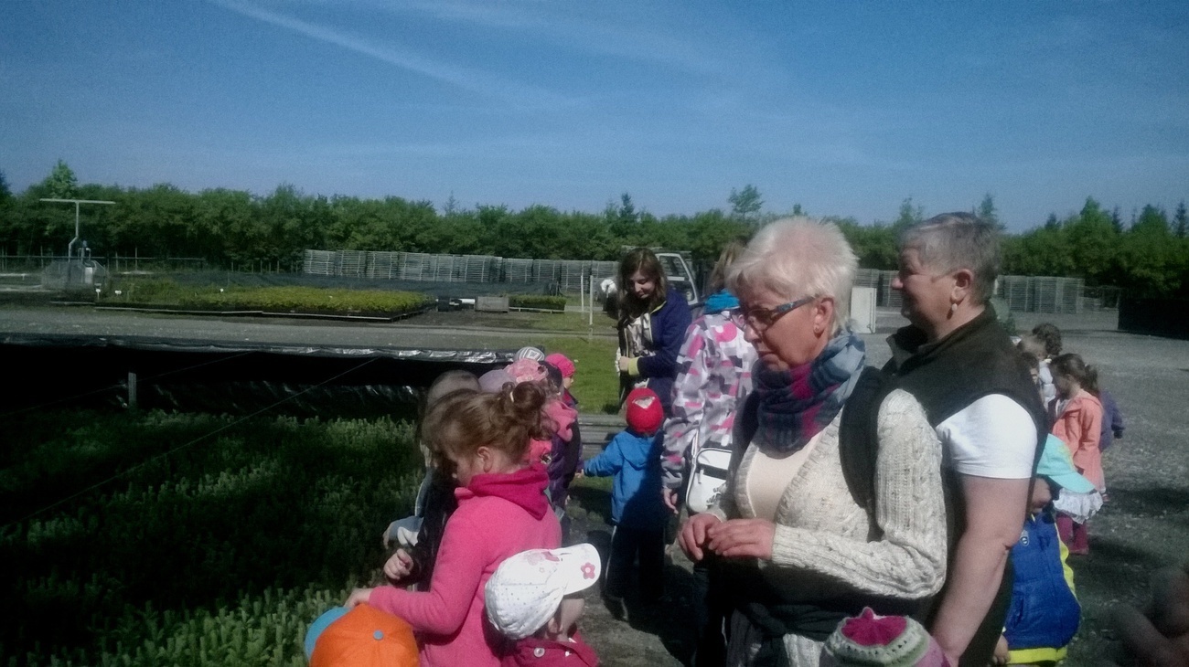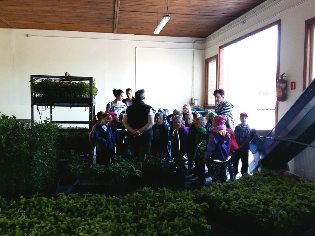 Na miejscu czekała już pani Bogusia, która zaprosiła nas do zwiedzania. Rozpoczęliśmy od wędrówki pomiędzy drzewami, aż dotarliśmy do "ścieżki zmysłów". Była wykonana z szyszek, trawy, kamieni, mchu, znalezionych w lesie, a które mają różny kształt i fakturę. Następnie przeszliśmy do hali, gdzie odbywało się sadzenie nasion w specjalnych kasetach przy użyciu maszyn. Pani Bogusia zaprowadziła nas również do ogromnych szklarni, w których nasionka rosły i stawały się małymi drzewkami. Gdy już podrosną zostają przesadzane ze szklarni i rosną już pod gołym niebem, a podlewają je specjalne zraszacze.