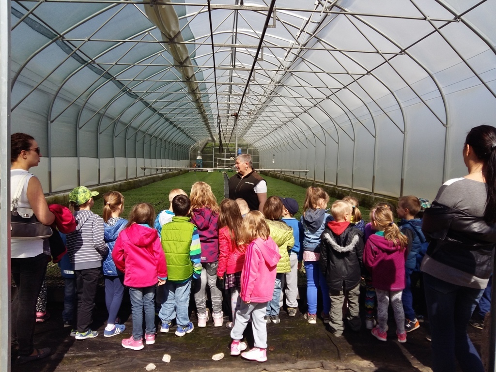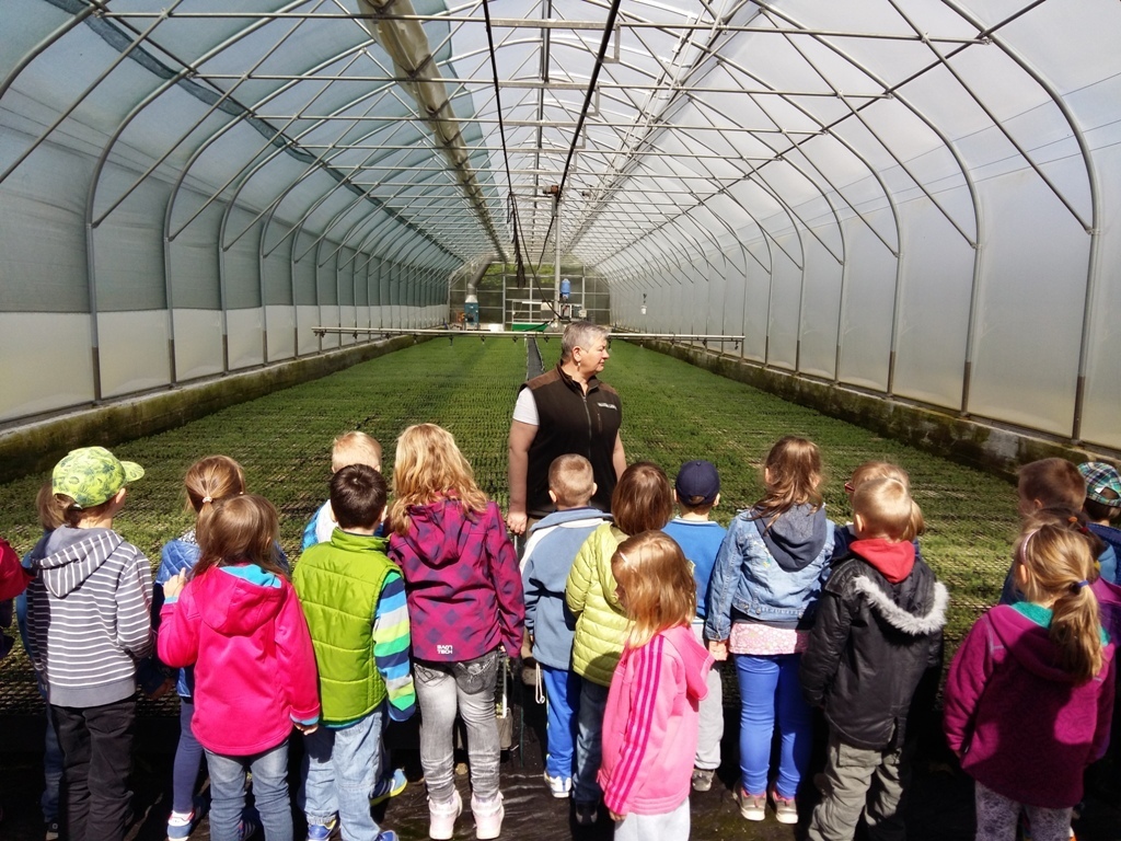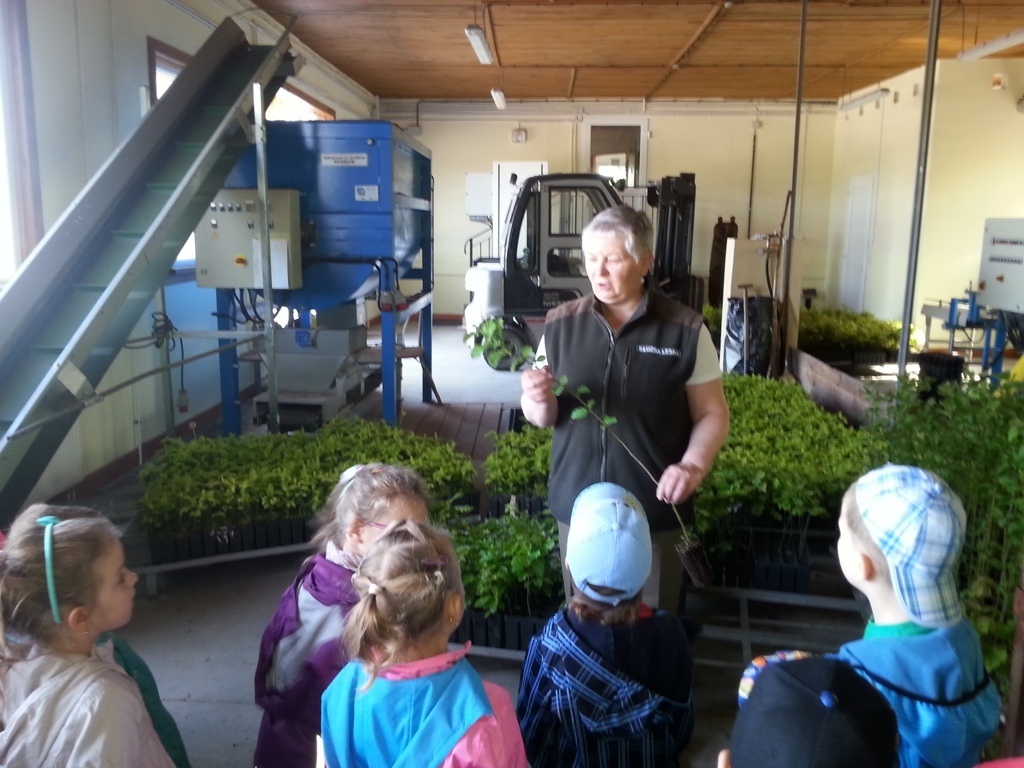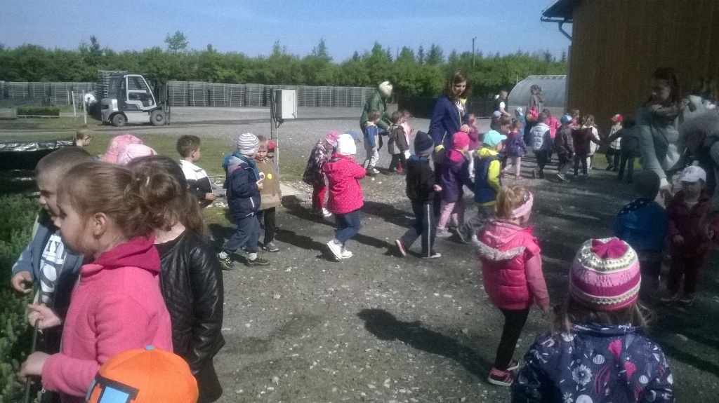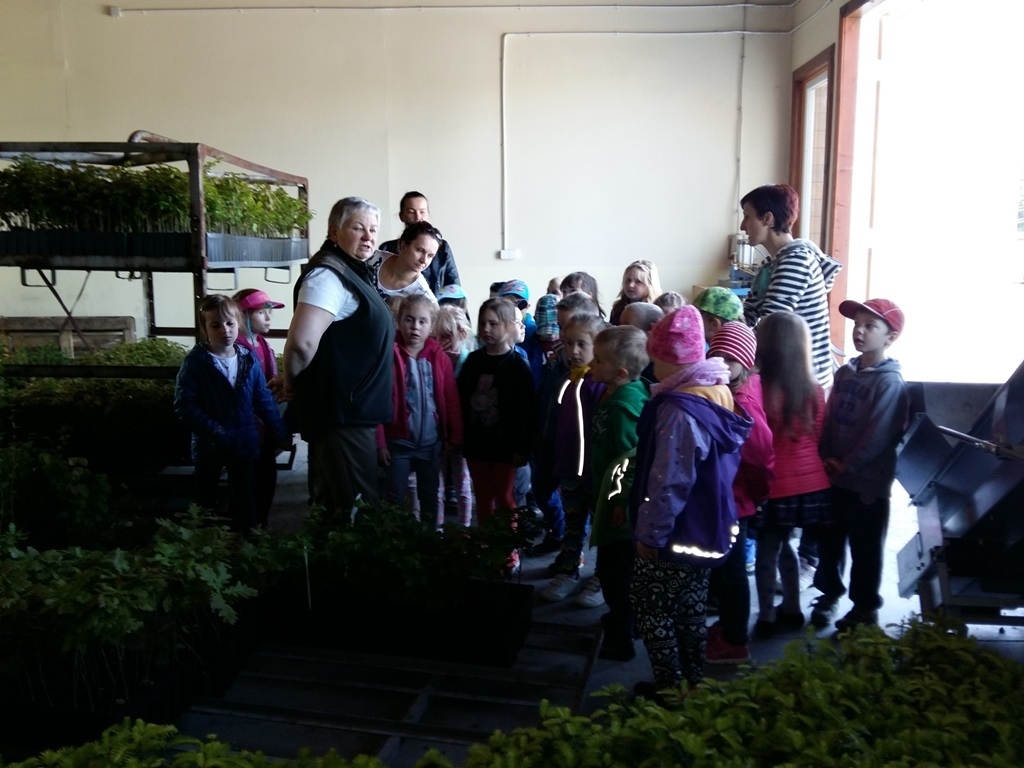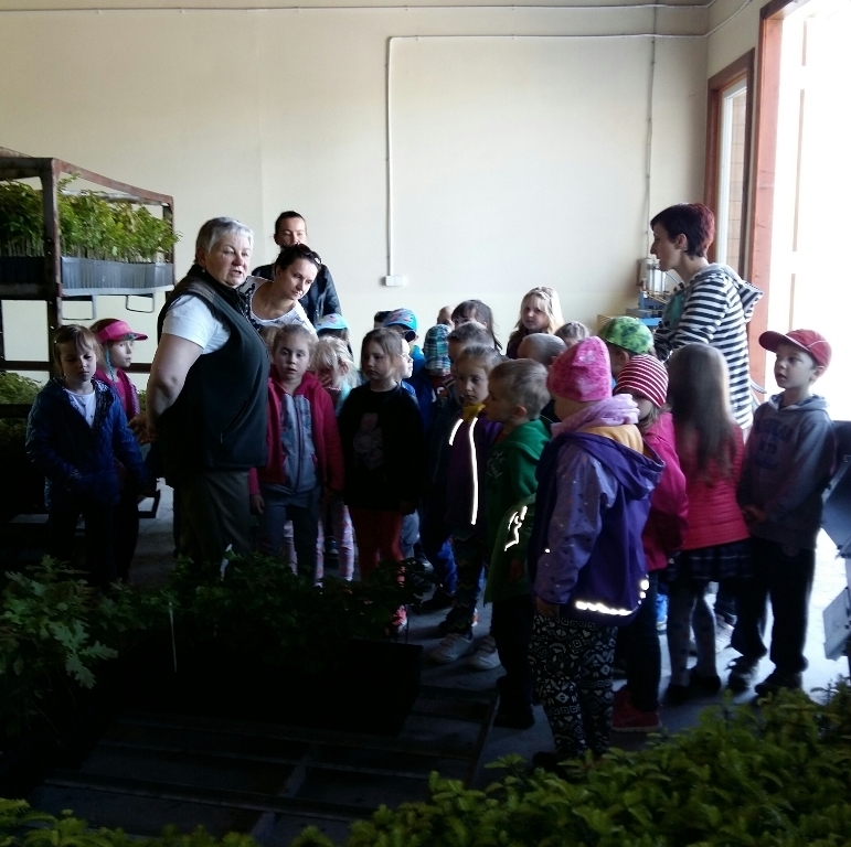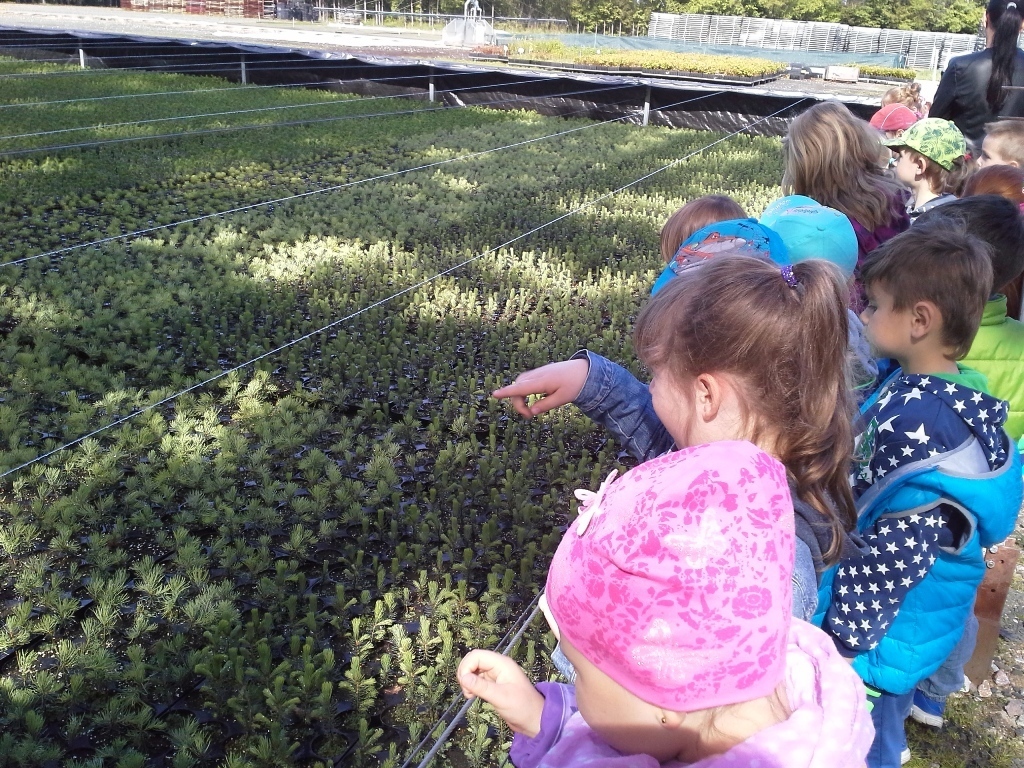 Na miejscu czekała już pani Bogusia, która zaprosiła nas do zwiedzania. Rozpoczęliśmy od wędrówki pomiędzy drzewami, aż dotarliśmy do "ścieżki zmysłów". Była wykonana z szyszek, trawy, kamieni, mchu, znalezionych w lesie, a które mają różny kształt i fakturę. Następnie przeszliśmy do hali, gdzie odbywało się sadzenie nasion w specjalnych kasetach przy użyciu maszyn. Pani Bogusia zaprowadziła nas również do ogromnych szklarni, w których nasionka rosły i stawały się małymi drzewkami. Gdy już podrosną zostają przesadzane ze szklarni i rosną już pod gołym niebem, a podlewają je specjalne zraszacze.