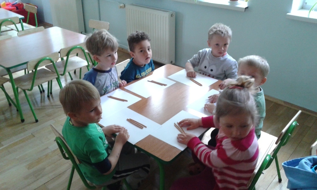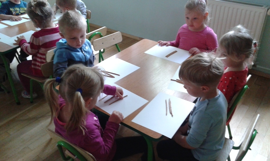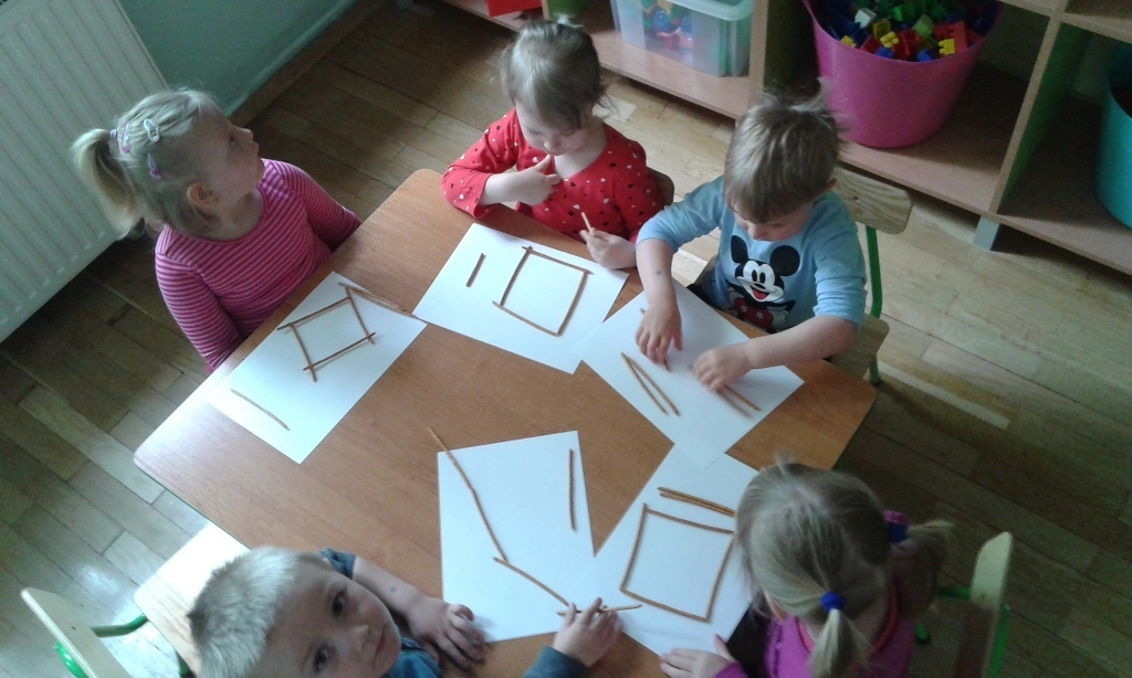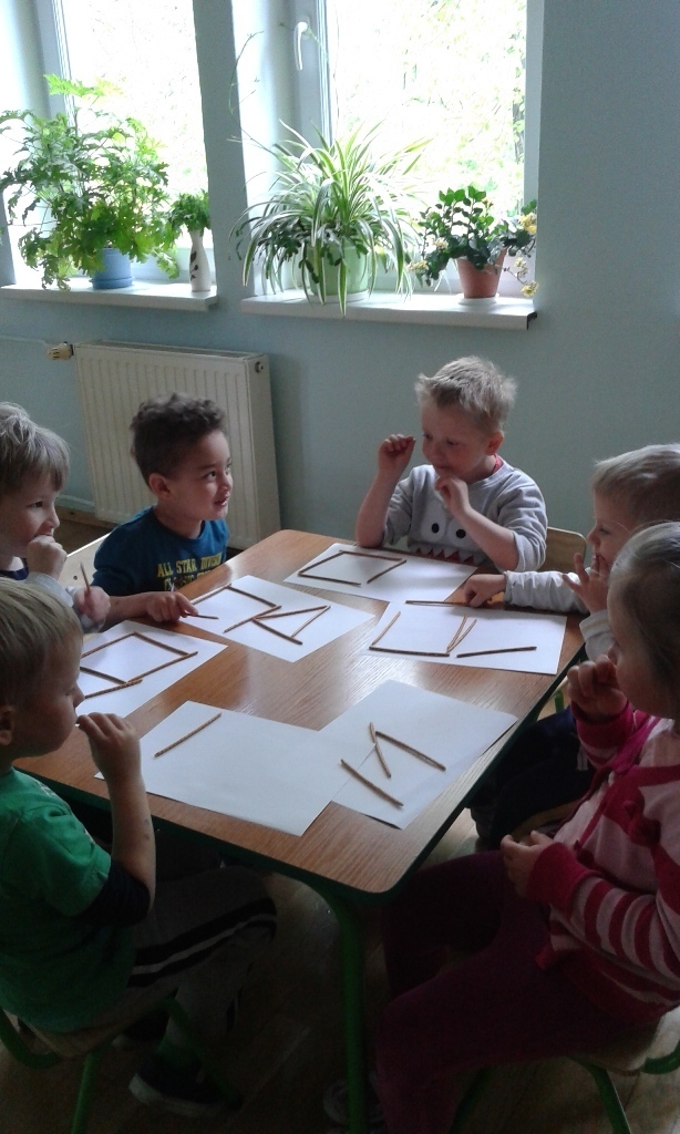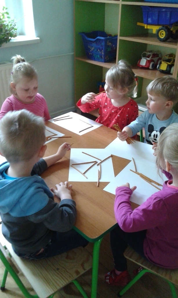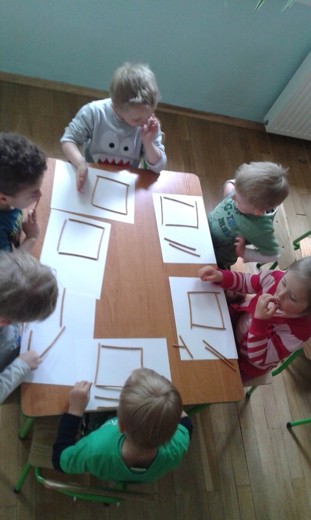 Od zawsze wiadomo, że Tygryski przepadają za paluszkami. A czemu nie zamienić ich w liczmany? Każdy z przedszkolaków otrzymał pakiet paluszków - liczmanów, które miał porachować, a następnie ułożyć z nich figury geometryczne, kwadrat i trójkąt. Wszyscy spisali się na medal !!!