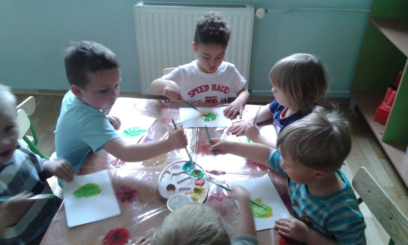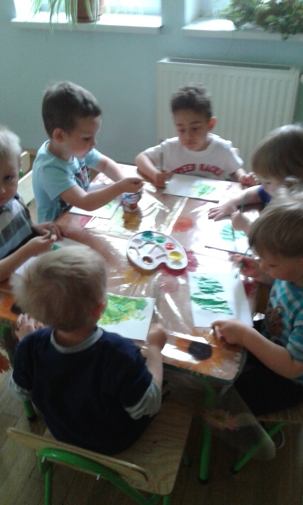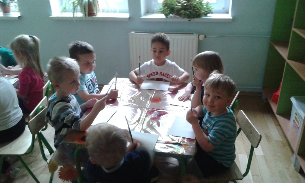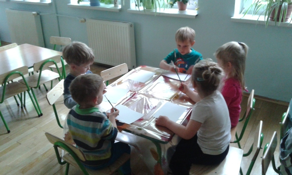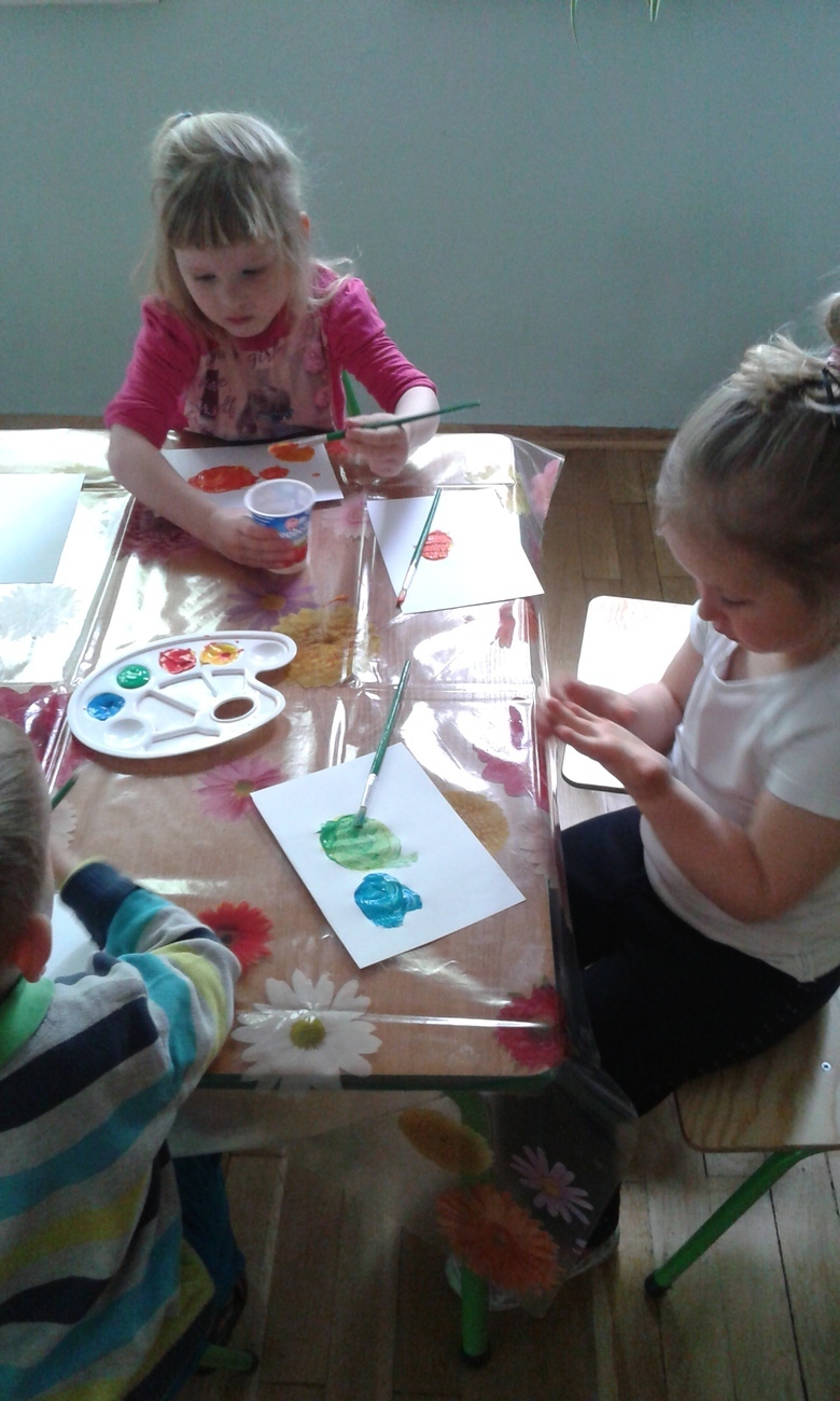 Każde z dziecko otrzymało kartkę, farby i pędzel, tak przygotowani mogliśmy przystąpić do eksperymentu.